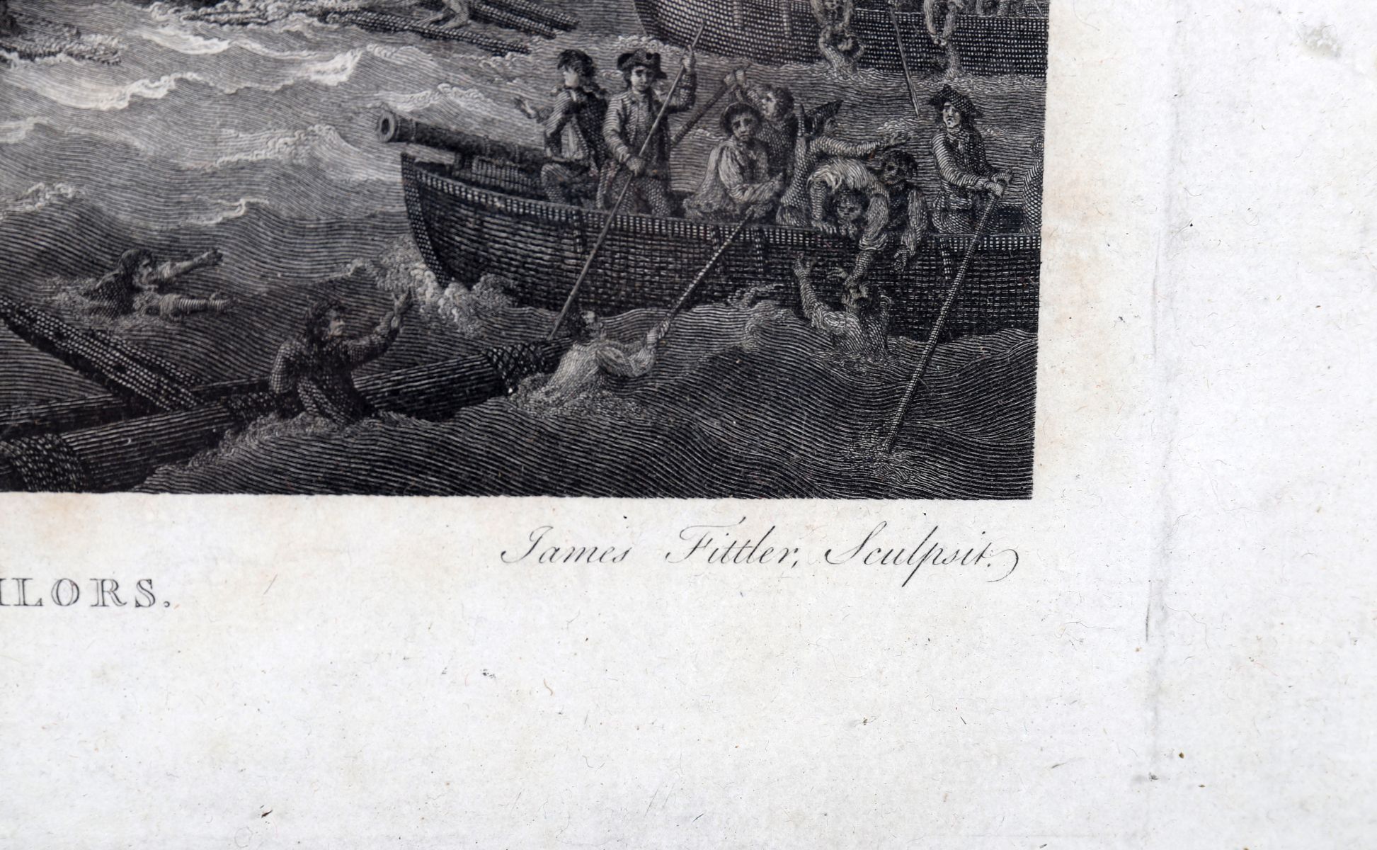 The plate bears a dedication to senior British officers including Sir George Elliot, with engraved credits along the margin, after an original composition associated with late 18th-century British historical printmaking. Presented in a period ebonised and gilt moulded frame.