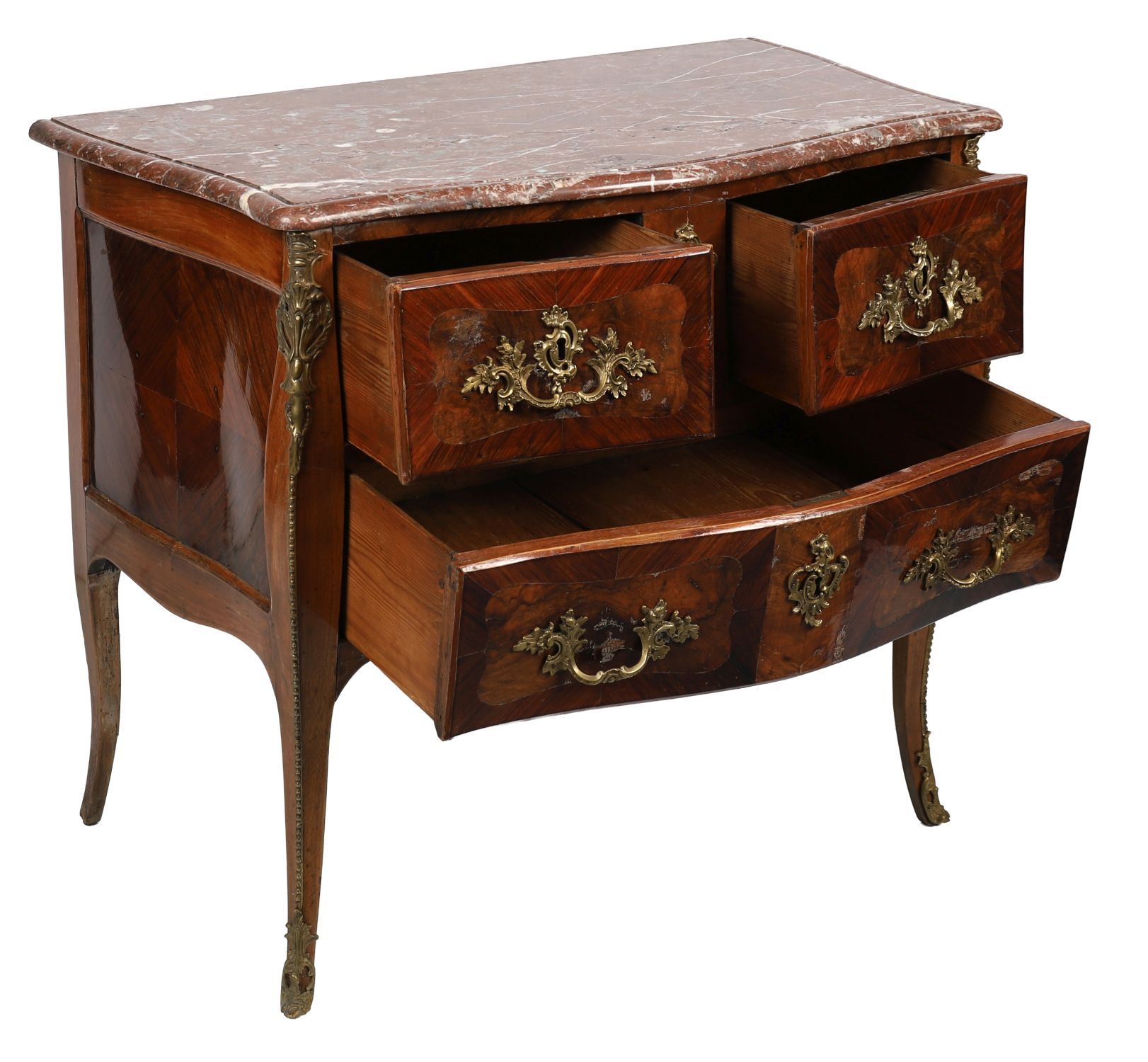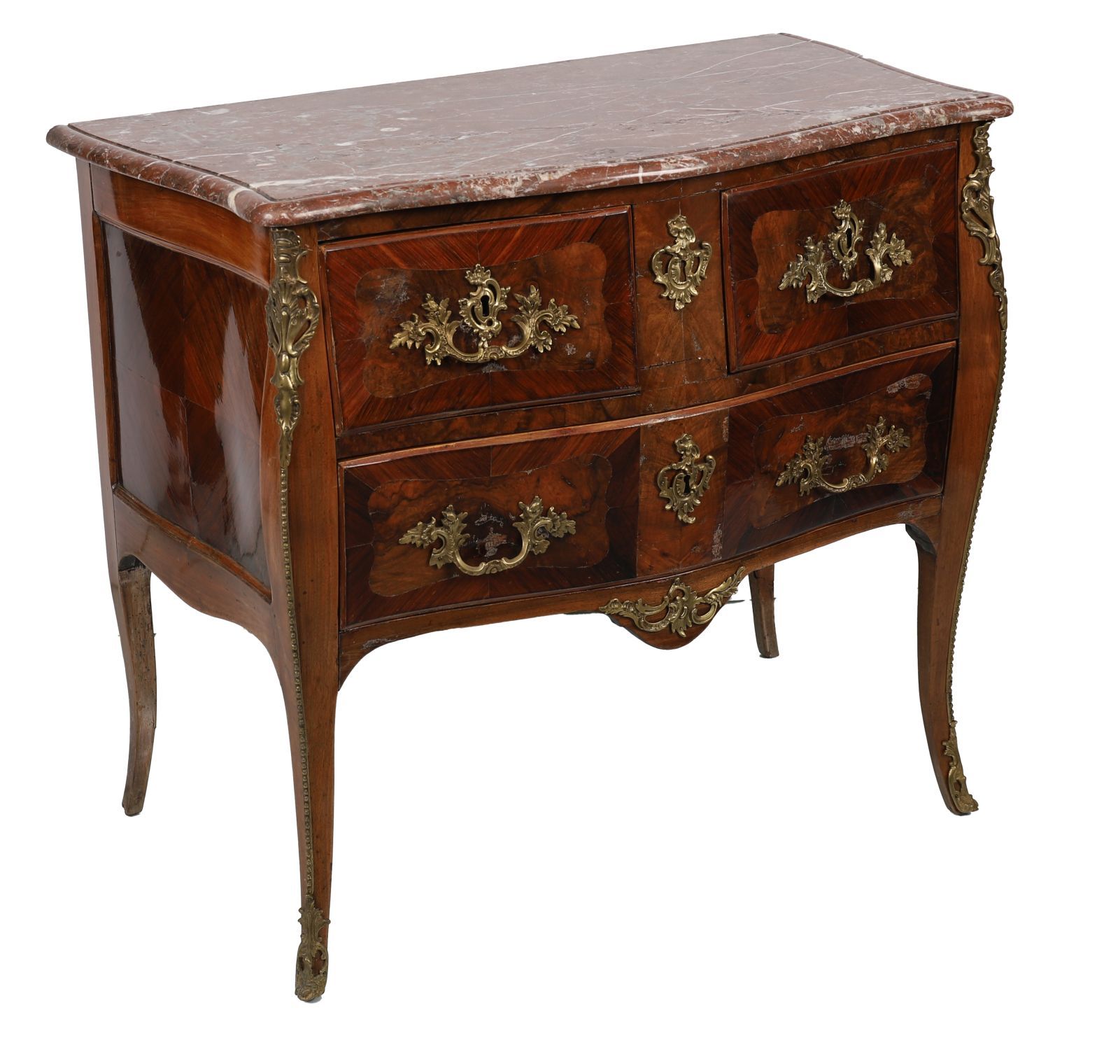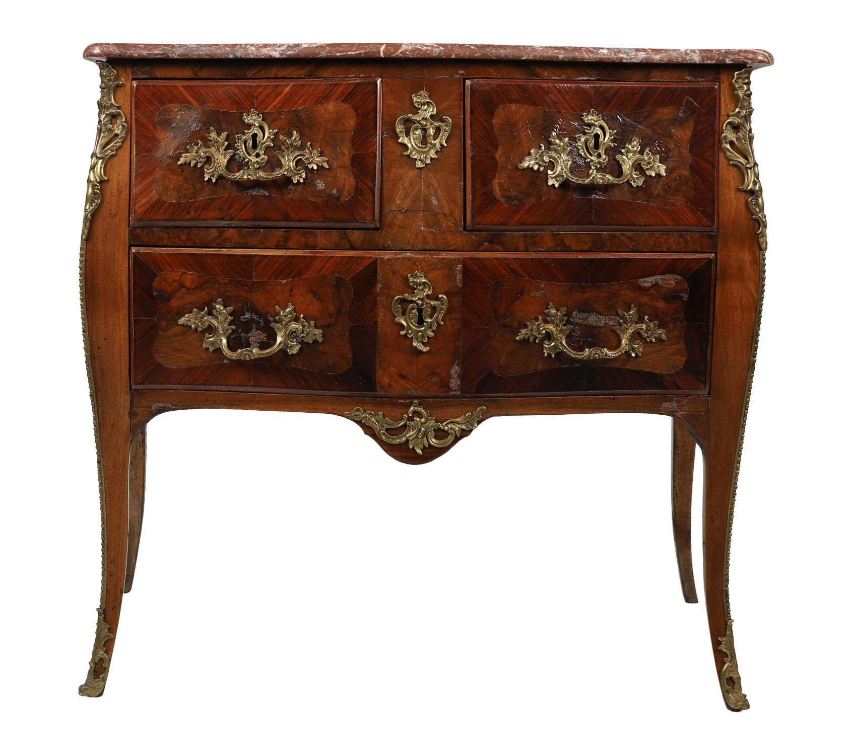 The shaped pink and white veined marble top is original to the piece and follows the undulating contour of the carcass. Cabriole legs are accented with finely cast bronze sabots and corner mounts. The sides feature matching marquetry panels, and the carcass is veneered in kingwood and tulipwood with crossbanded detail.