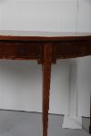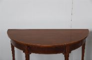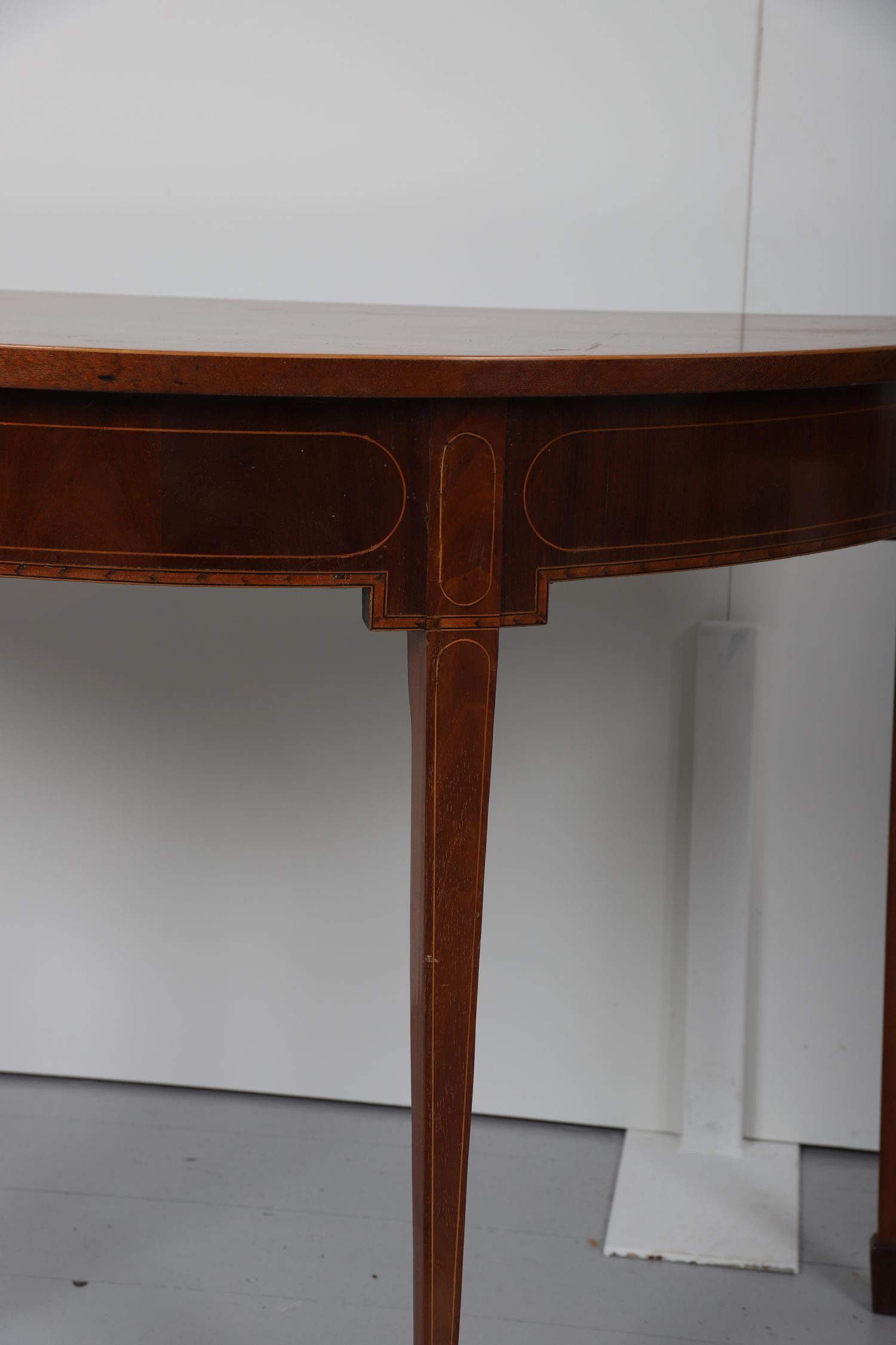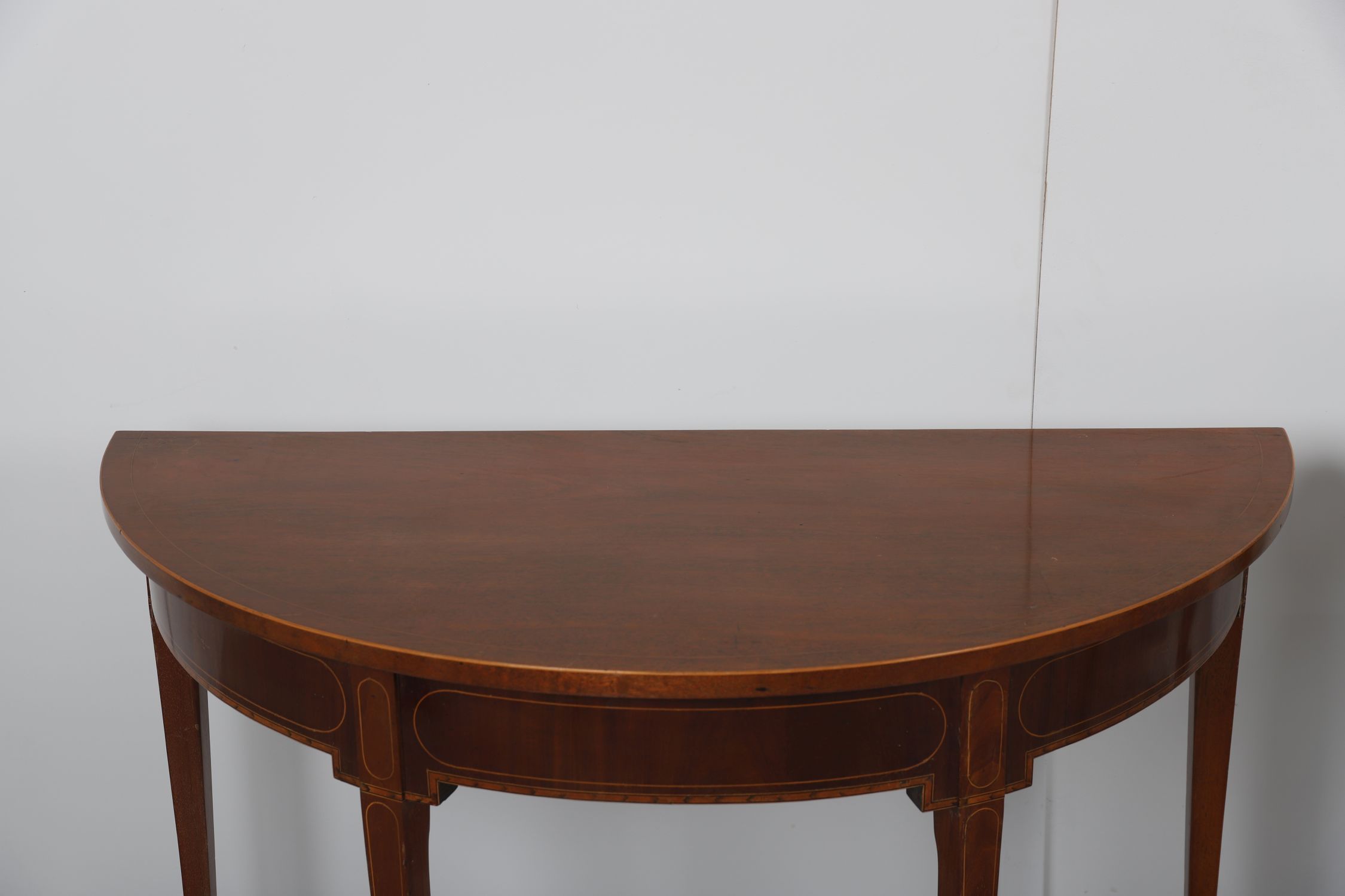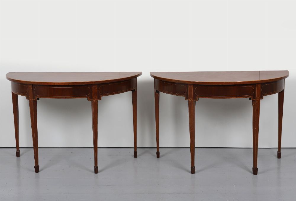 A fine pair of George III demi-lune console tables, veneered in figured mahogany, the tops crossbanded in satinwood with boxwood stringing and line inlay to the friezes, raised on square tapering legs with spade feet. The refined proportions and inlay reflect the neoclassical influence popularised by George Hepplewhite and Thomas Sheraton during the late Georgian period.
