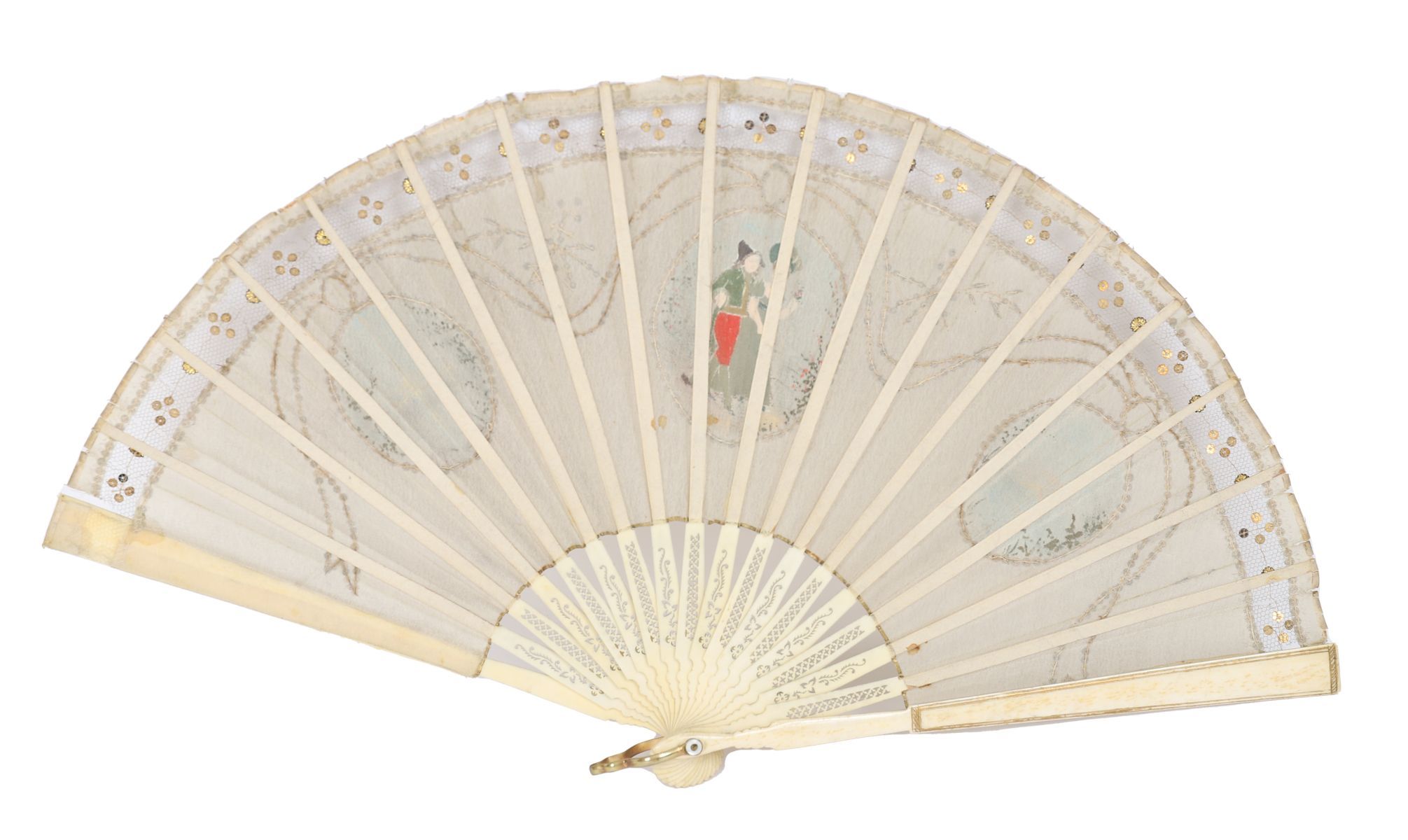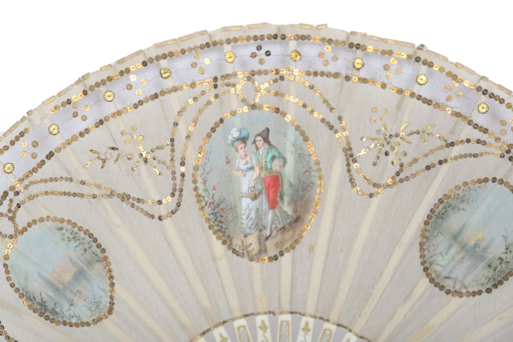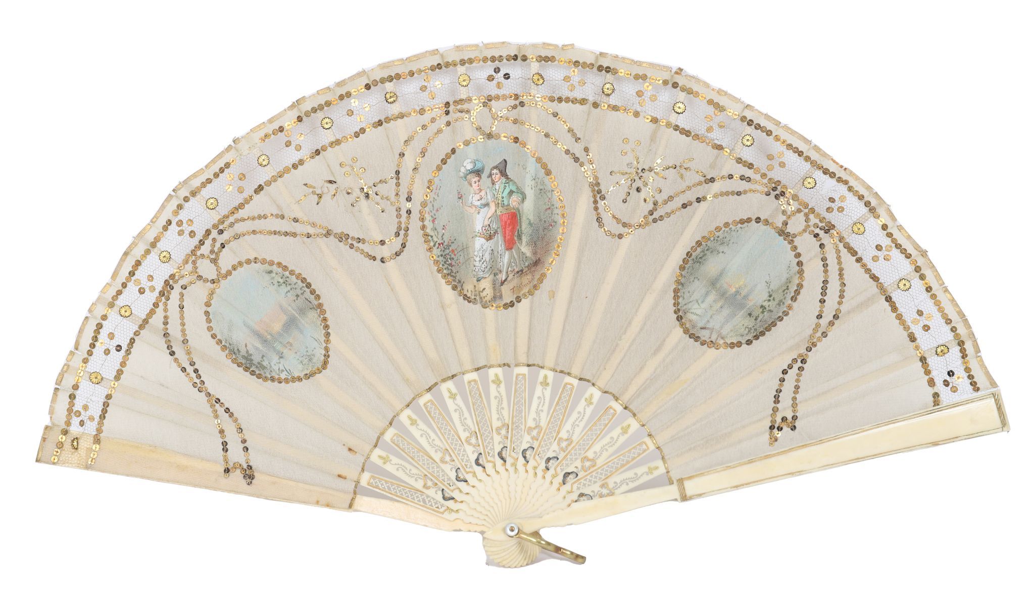 A finely worked Continental folding fan, the leaf painted with oval vignettes depicting an elegantly dressed courting couple within a pastoral landscape, interspersed with additional landscape reserves, all heightened with applied sequins and gilt embellishment. Mounted on delicately pierced and decorated staves, likely bone or ivory, with carved and gilt guard sticks.