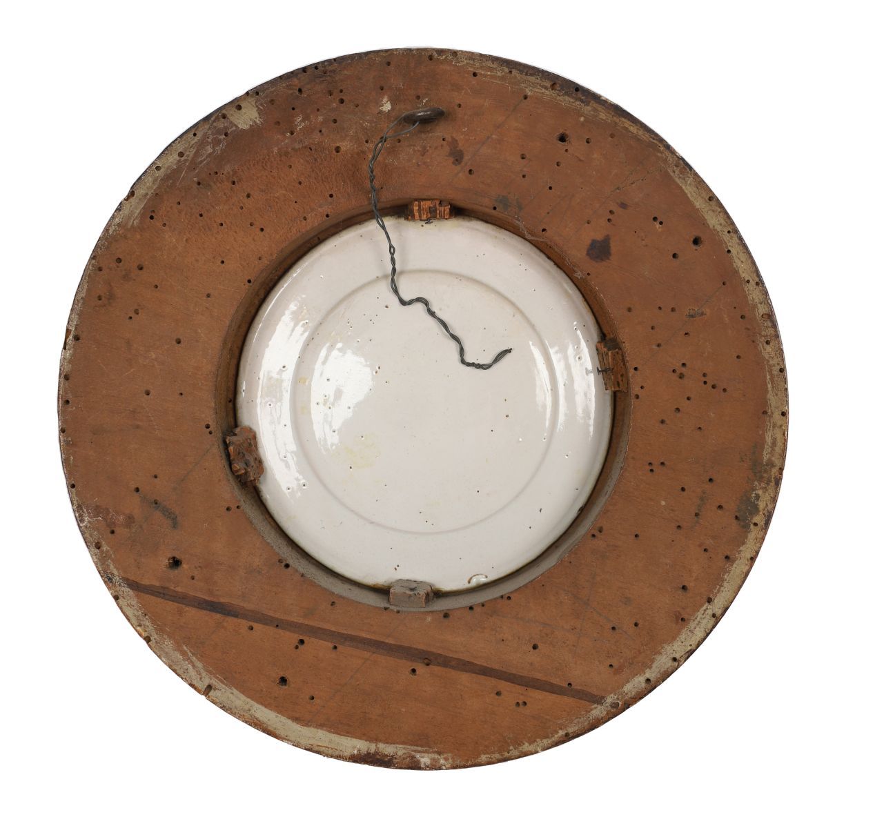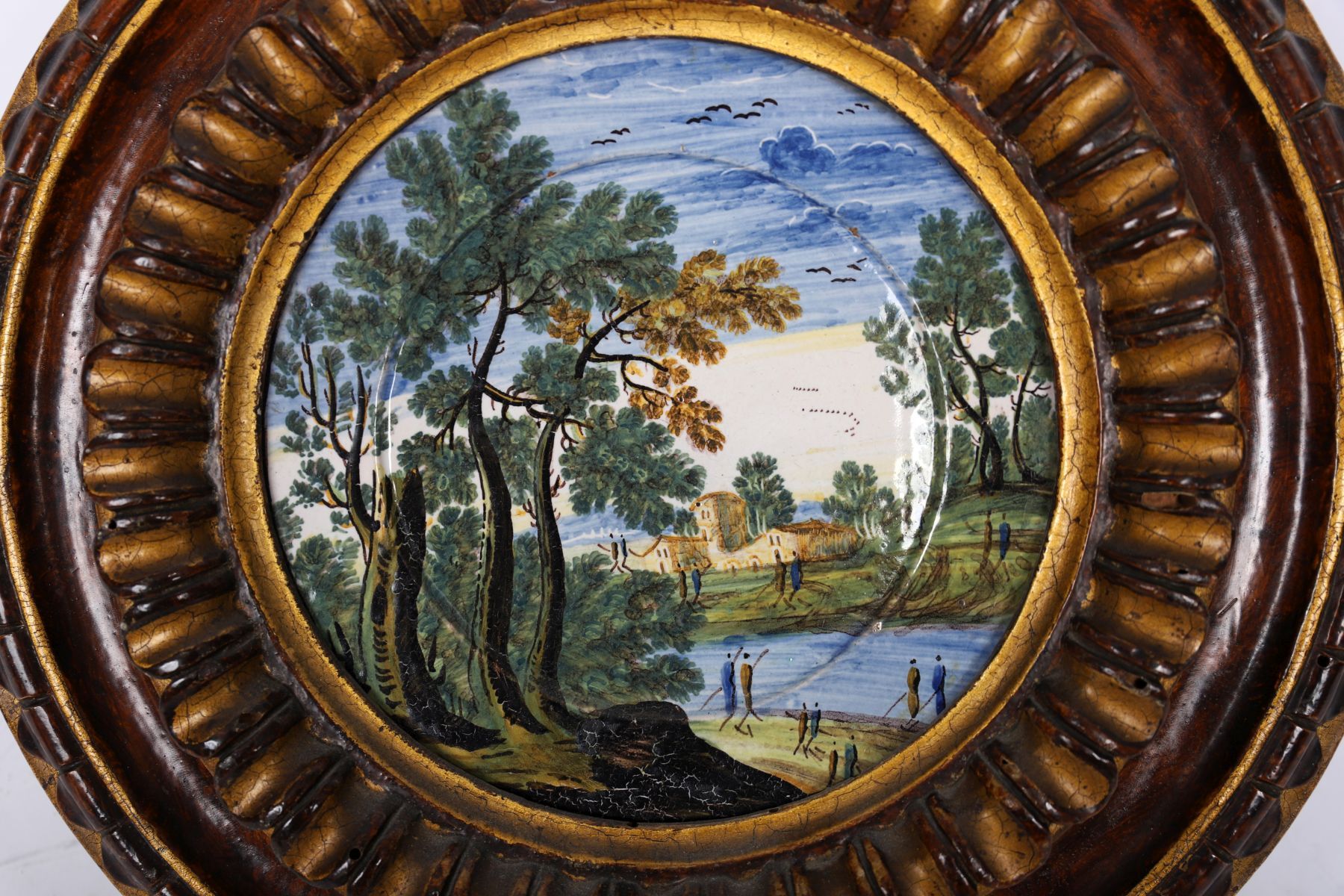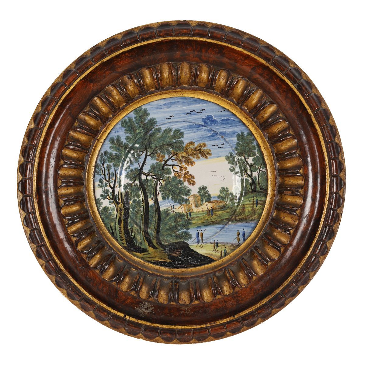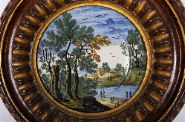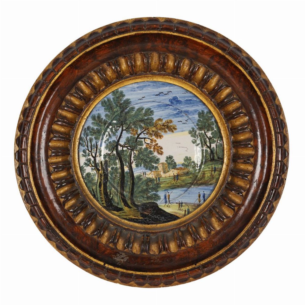 A faience or majolica plaque painted with a landscape scene featuring trees, water, and distant architecture, mounted within a carved and gilt circular frame.