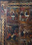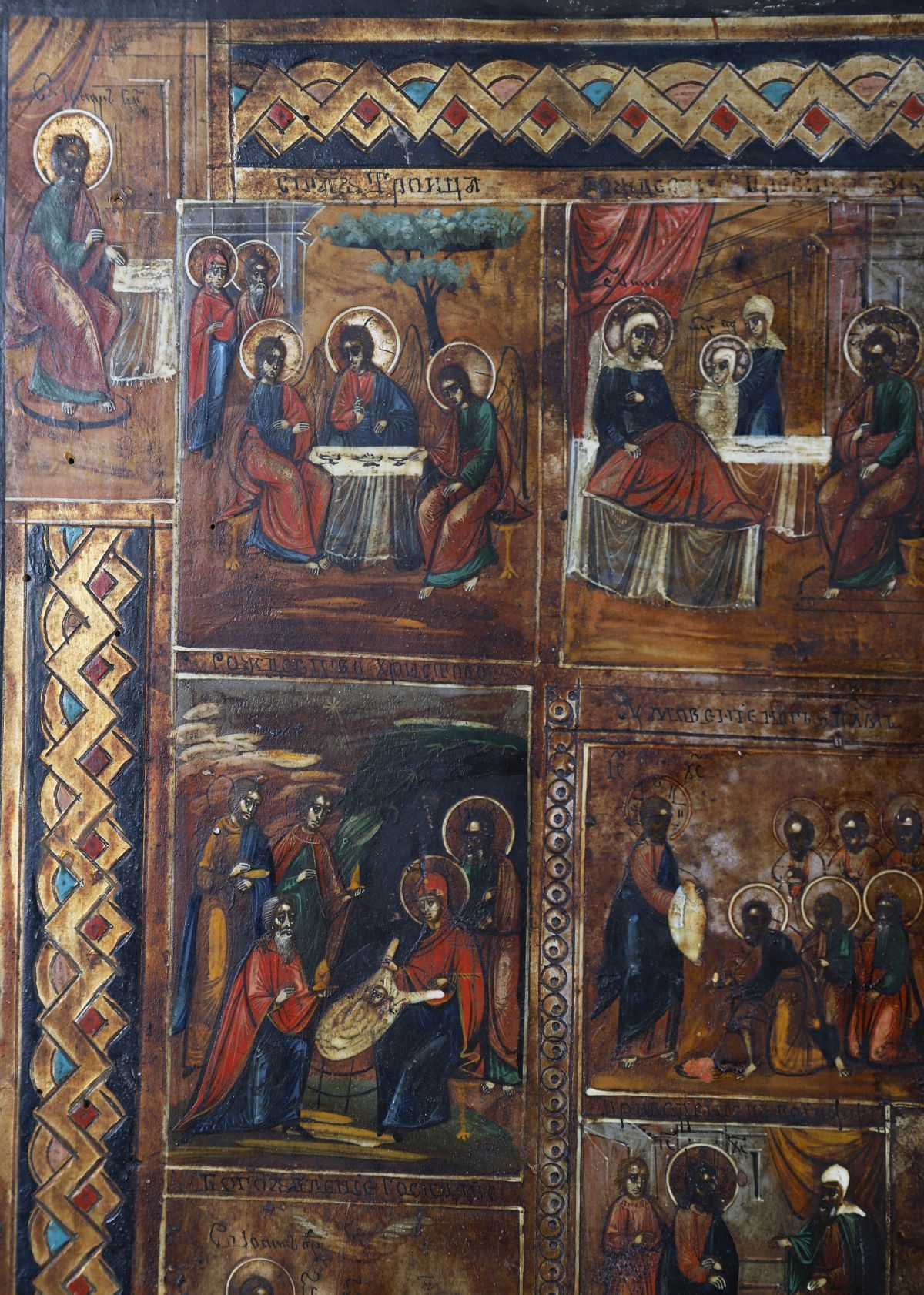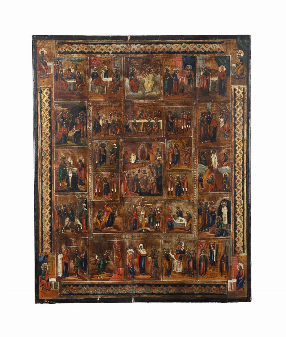 A late 18th to early 19th-century Russian icon, tempera and gilt on panel, depicting multiple narrative scenes from the life of Christ and the Virgin, bordered with geometric ornamentation. Retaining rich polychrome and gilt highlights.