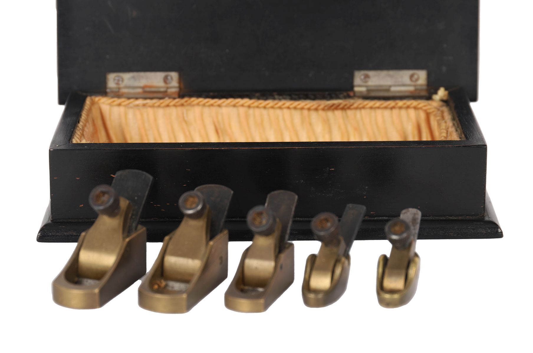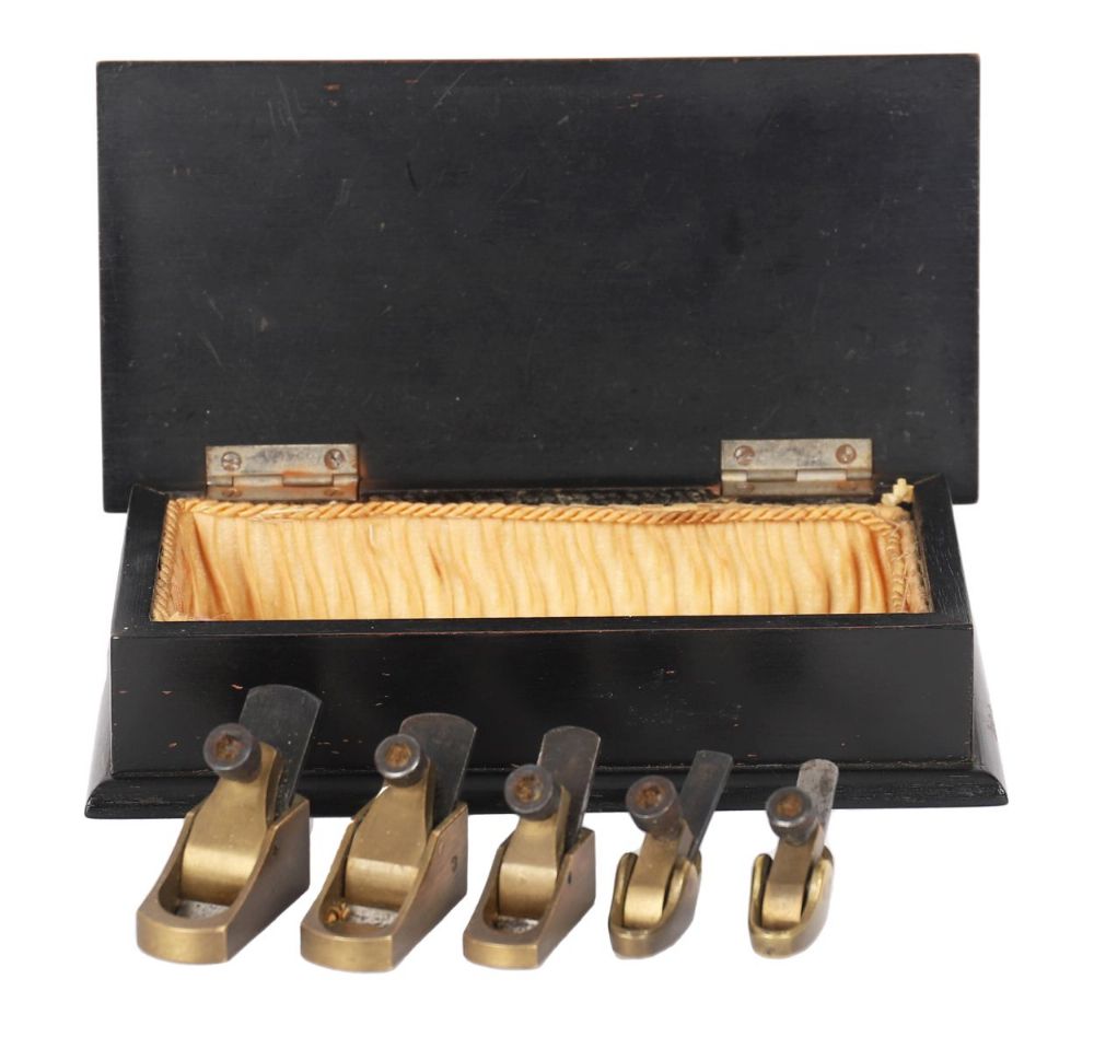 An unusual set of five miniature brass violin planes, each with steel blade and screw adjustment, graduating in size.