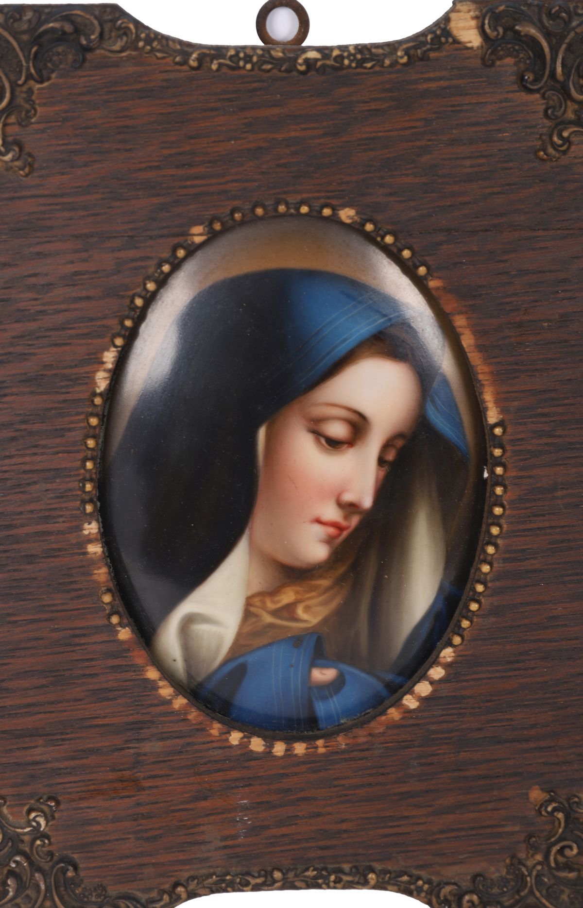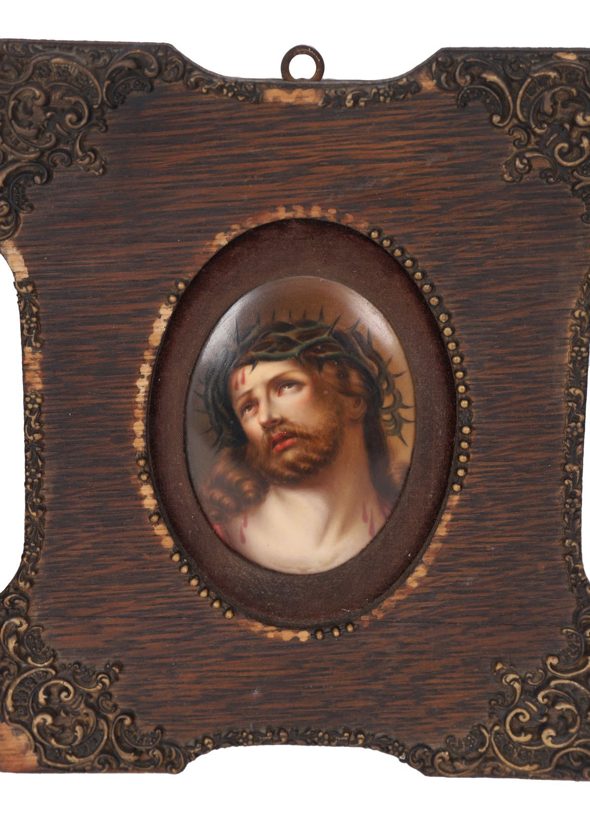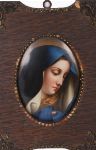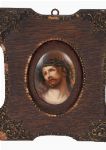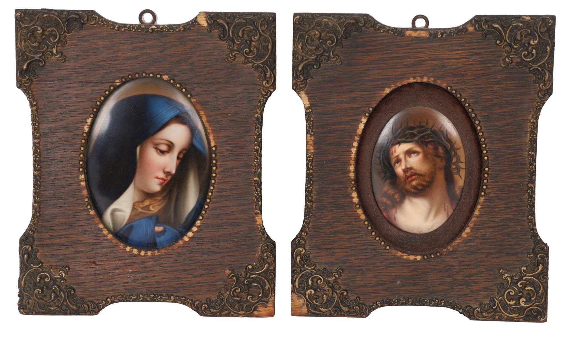 A pair of oval miniature portraits on ceramic tile depicting the Virgin Mary and Christ crowned with thorns, each housed in an hinged oak frame with applied moulded mounts and beaded borders. Finely detailed devotional images.