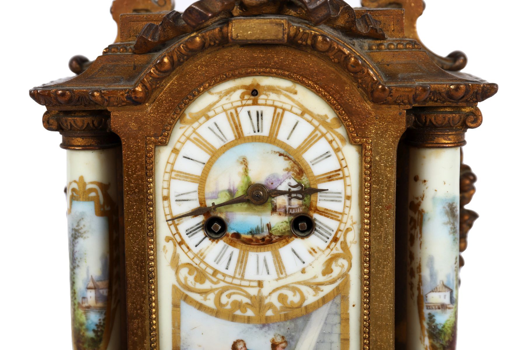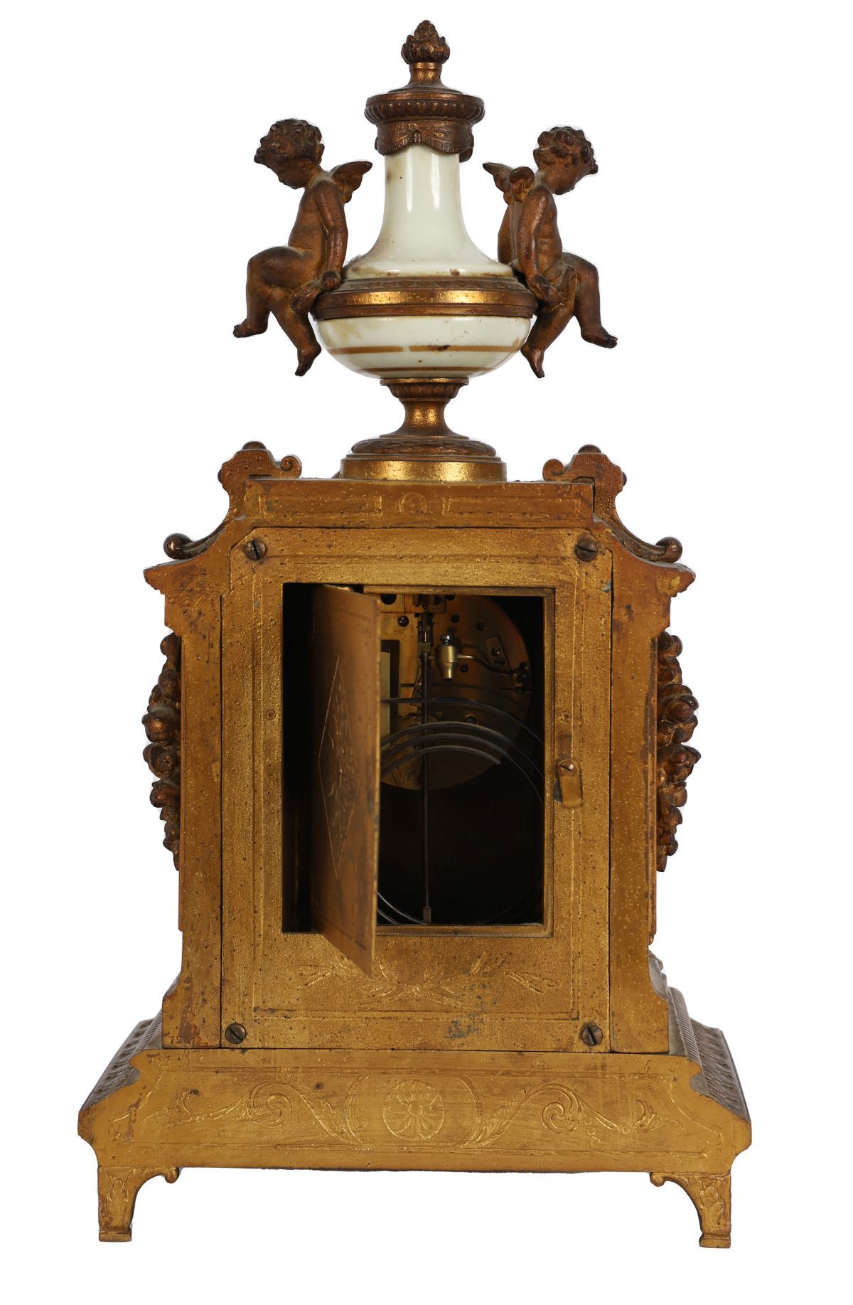 the enamelled dial above a painted panel flanked by a painted pillar on either side below a cherub mounted finial.