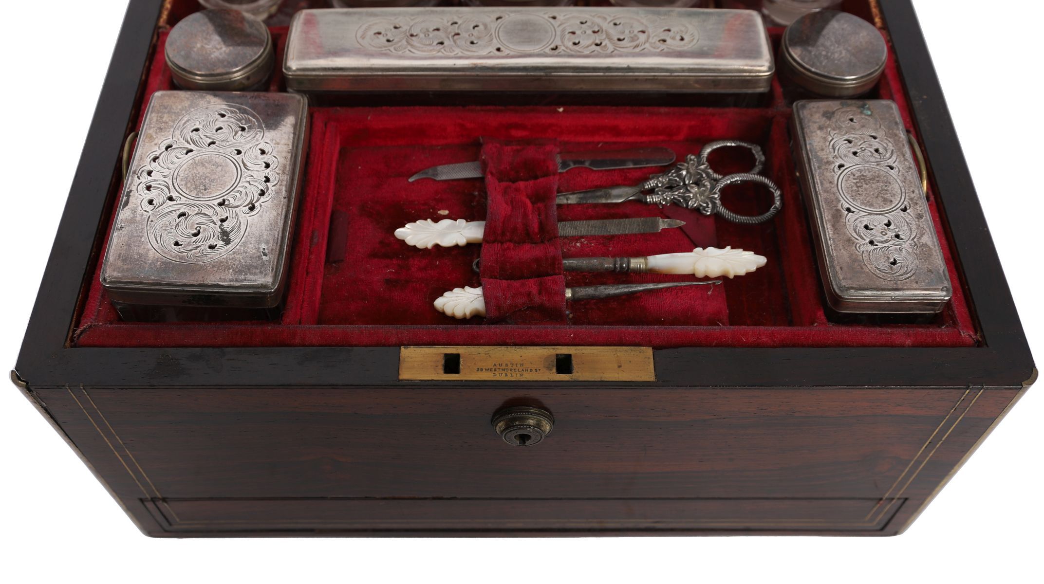 A rosewood vanity box stamped Austin of Dublin, the hinged lid enclosing a fitted interior with silver-plated and glass jars and grooming implements, set within a velvet-lined compartmented interior.