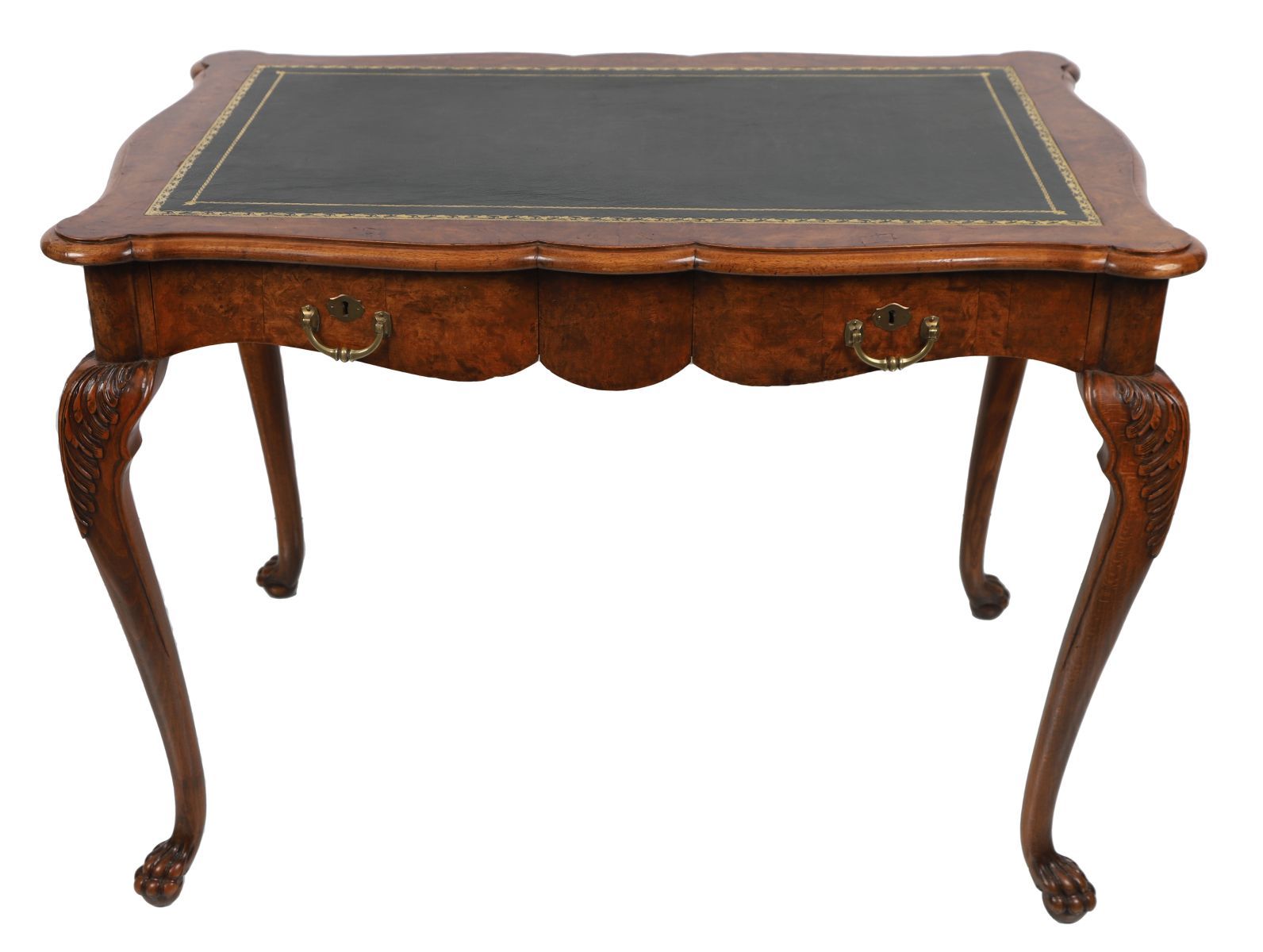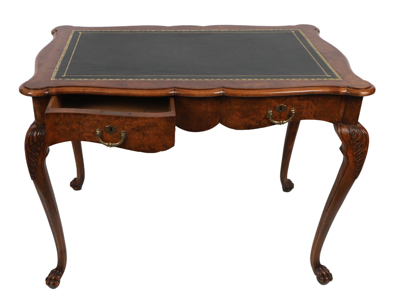 The expansive, tooled leather inset rectangular serpentine-shaped top sits above a frieze drawer and is raised on dramatic leaf-carved cabriole legs terminating on claw feet.