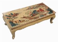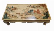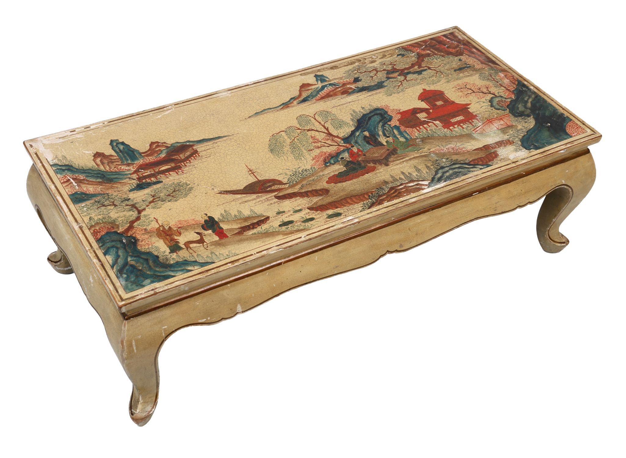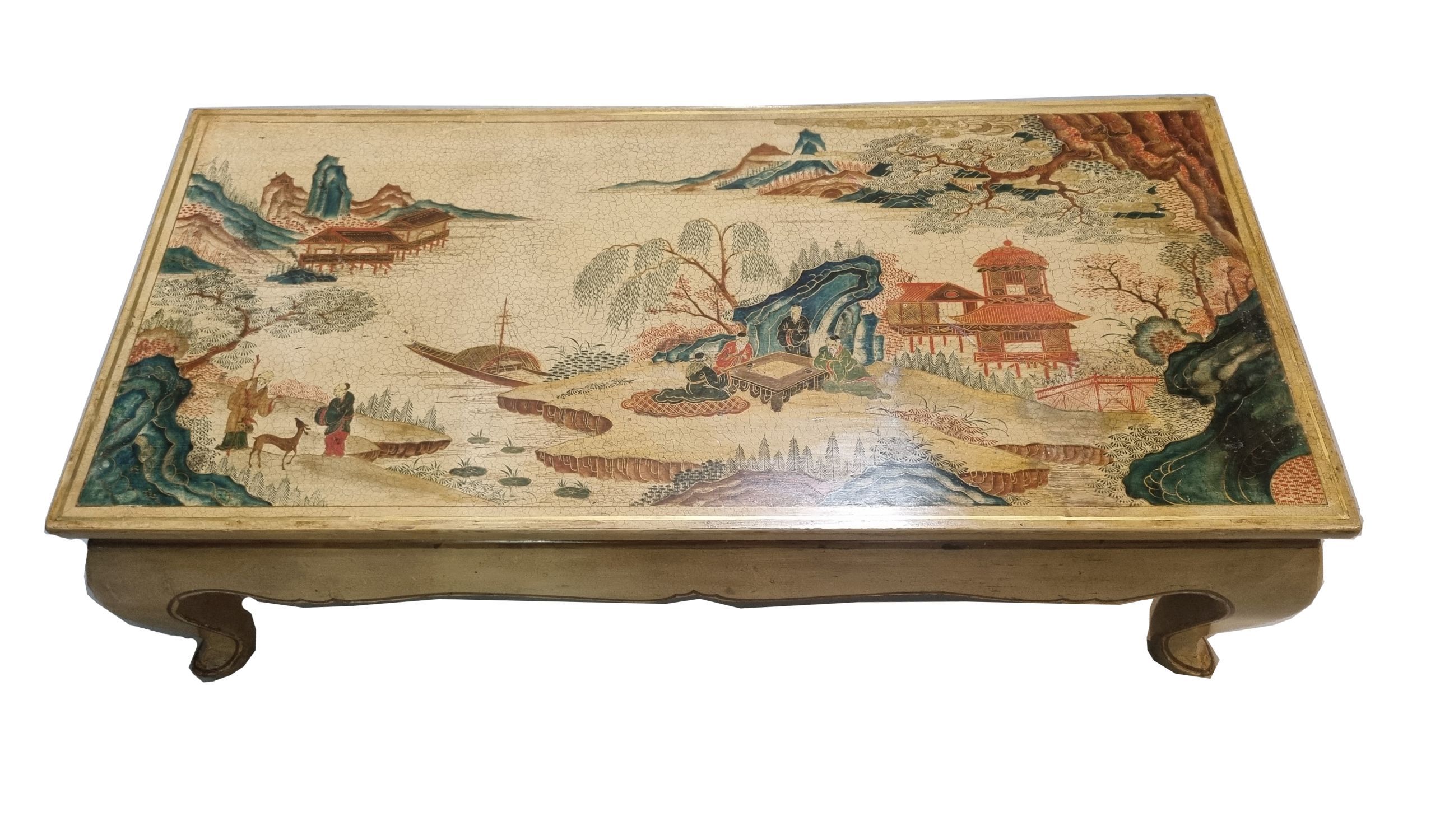 A rectangular coffee table with cabriole legs, the top inset with a lacquered panel depicting an extensive Chinese landscape scene with pagodas, figures, and mountains in polychrome, framed by a gilded surround.
