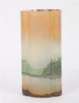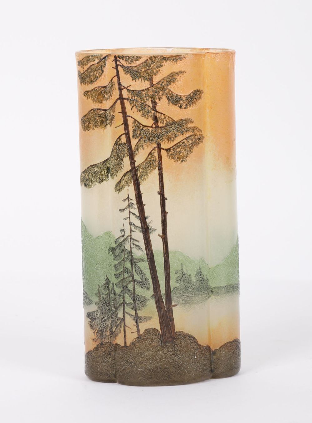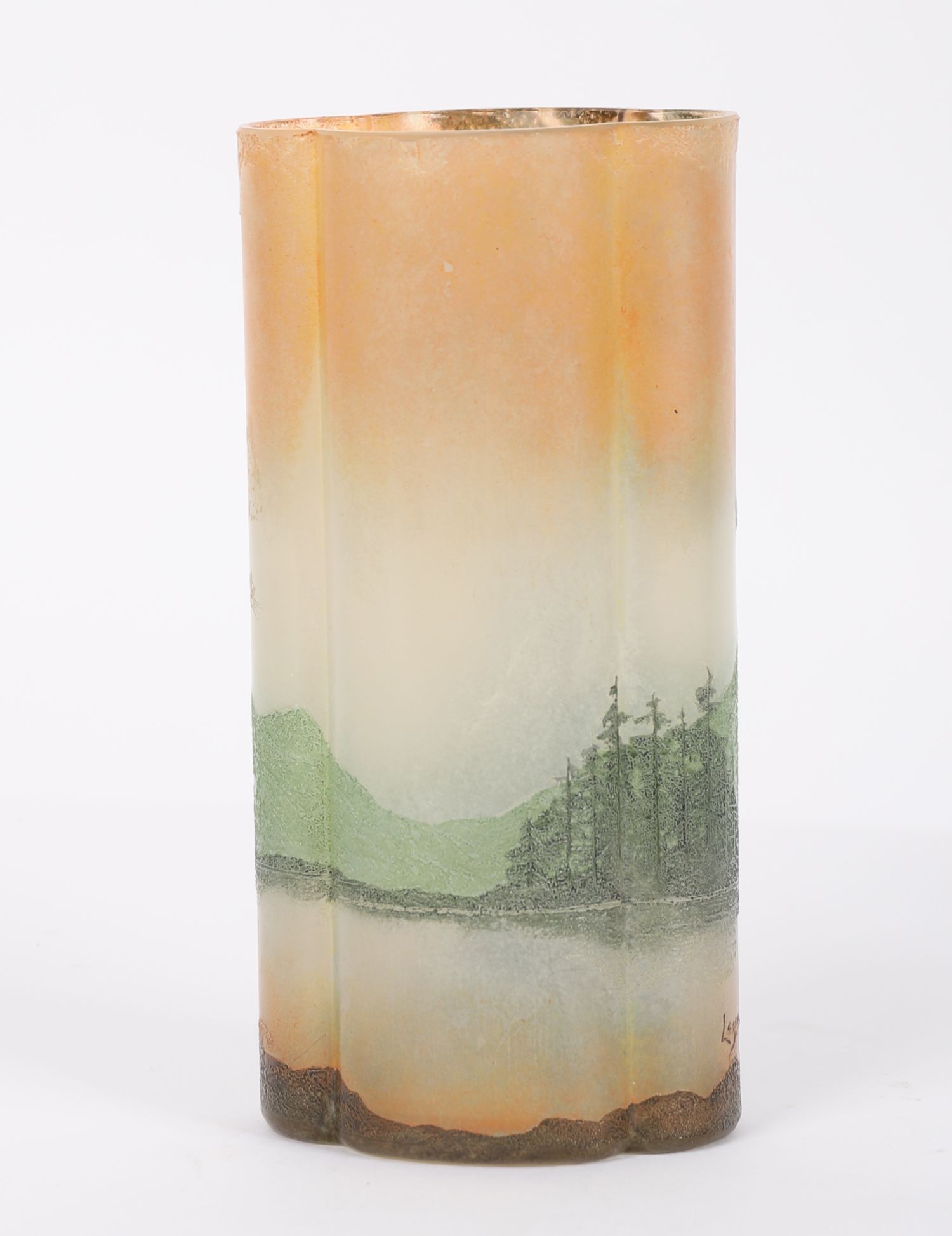 A fine early 20th century French cameo glass vase by Legras, of fluted upright form, acid-etched and enamelled with a continuous mountain and lake landscape, overlaid in shades of green and brown on an amber ground. Signed Legras to the side. Legras was a leading French glassmaker of the Art Nouveau and Art Deco periods, celebrated for his scenic etched and enamelled decoration.