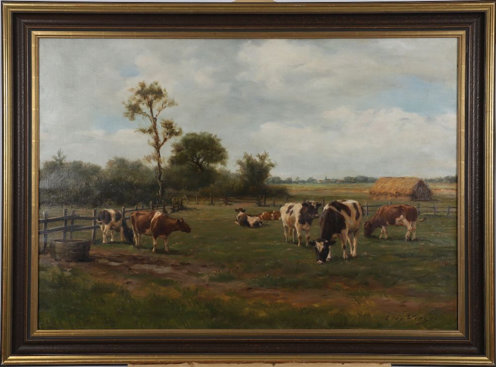 An oil painting depicting cattle grazing and resting in a lush field, with trees and haystacks under a clouded sky. Signed lower right by Leopold Wenzel (1885–1972), known for his bucolic and pastoral scenes. Framed.