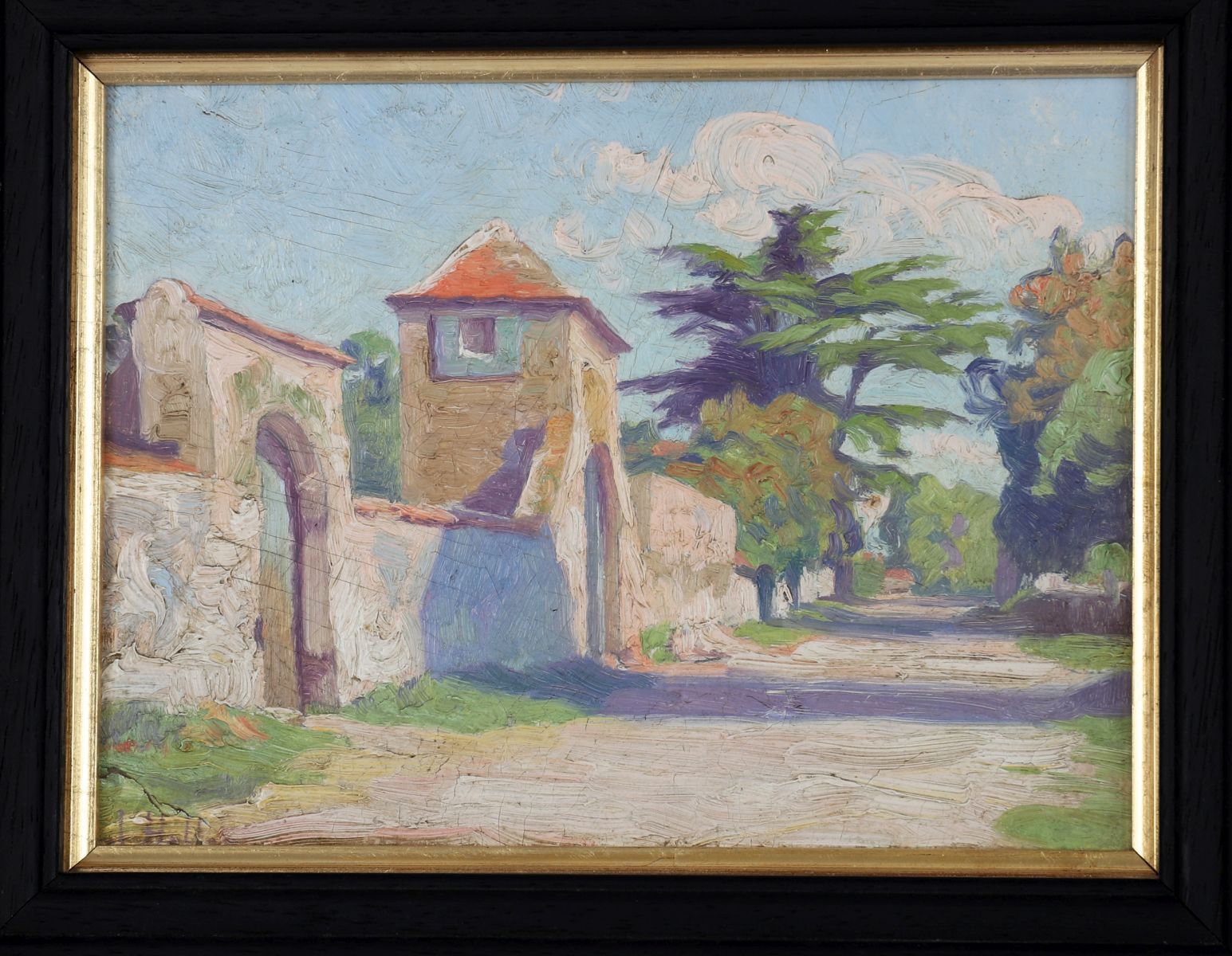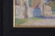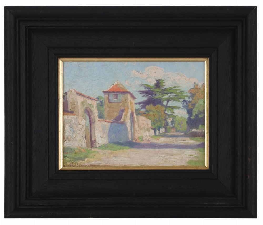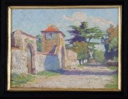 A delightful painting depicting a monastery wall and gatehouse, with tall Cedar of Lebanon trees in the background, this painting by Letitia Marion Hamilton was likely painted 'en plein air', with the shadows cast by trees on the roadway setting up a visual rhythm that is echoed