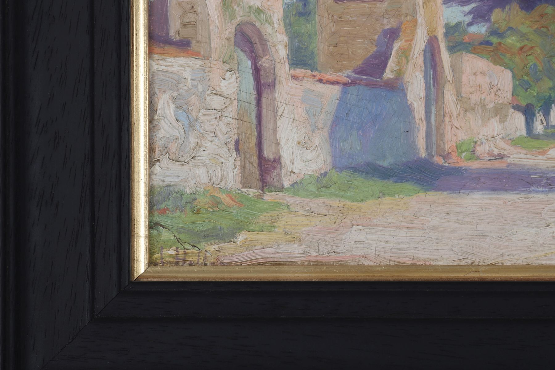 by arched gateways in the wall of the monastery. Hamilton is adept at using complementary colours, with the violet shadows contrasting with the green foliage and whitewashed wall.