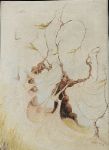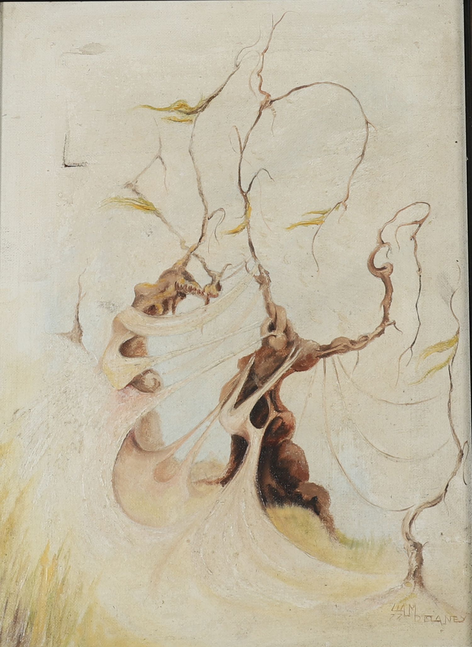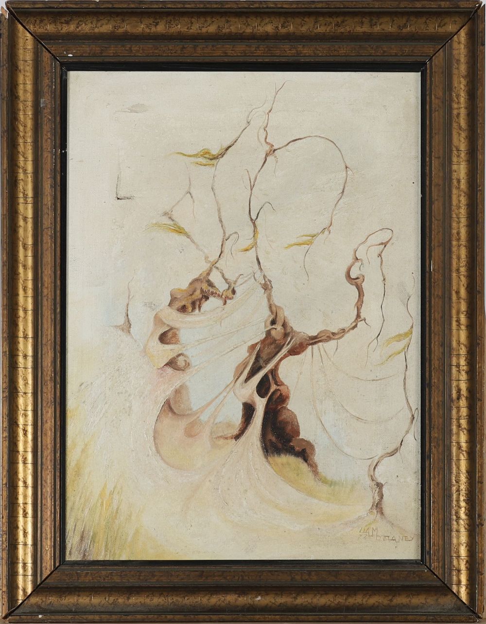 Oil on canvas, signed lower right, depicting an abstracted, wind-swept tree form with elongated curling branches. Soft muted palette and dynamic movement typical of Delaney's style. Oriel Gallery label verso.
