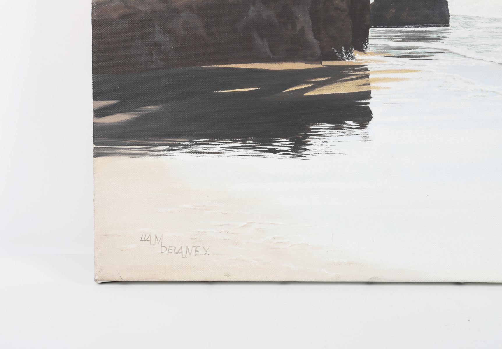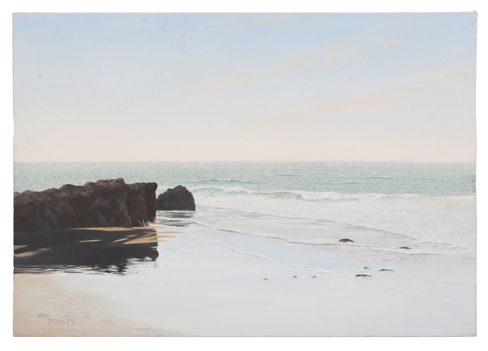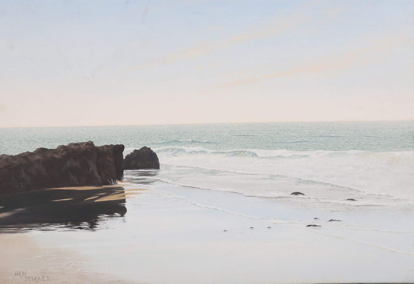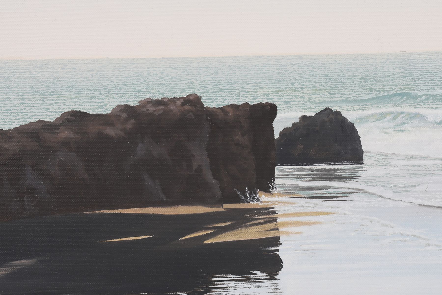 An oil painting depicting a tranquil shoreline with breaking waves under a soft sky, rendered in delicate natural tones with fine attention to light and reflection. Signed lower left. Unframed.