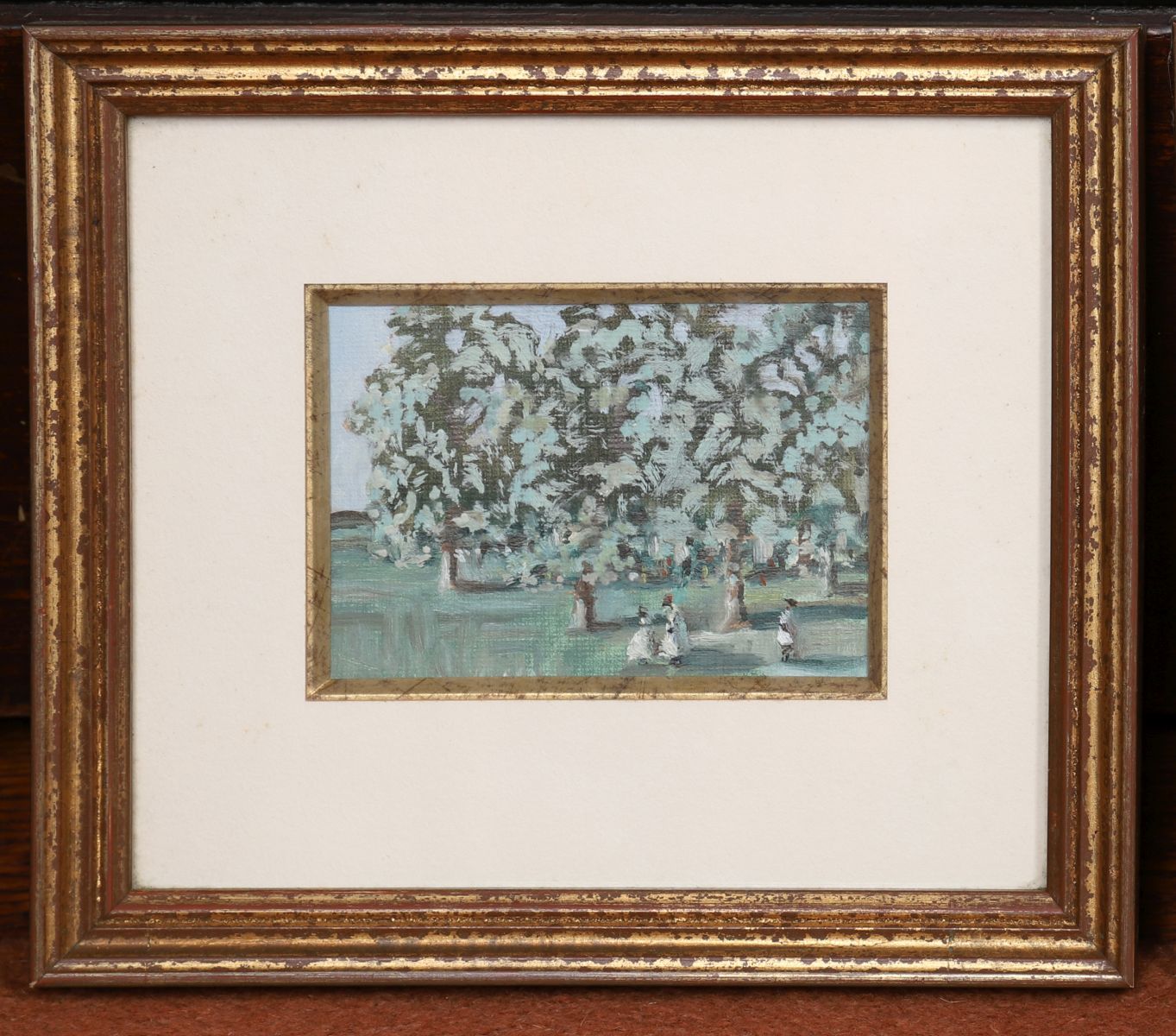 A pair of miniature landscape paintings by Liam Proud, each executed in oil and depicting pastoral scenes with figures beneath trees. Both framed and presented as a pair.