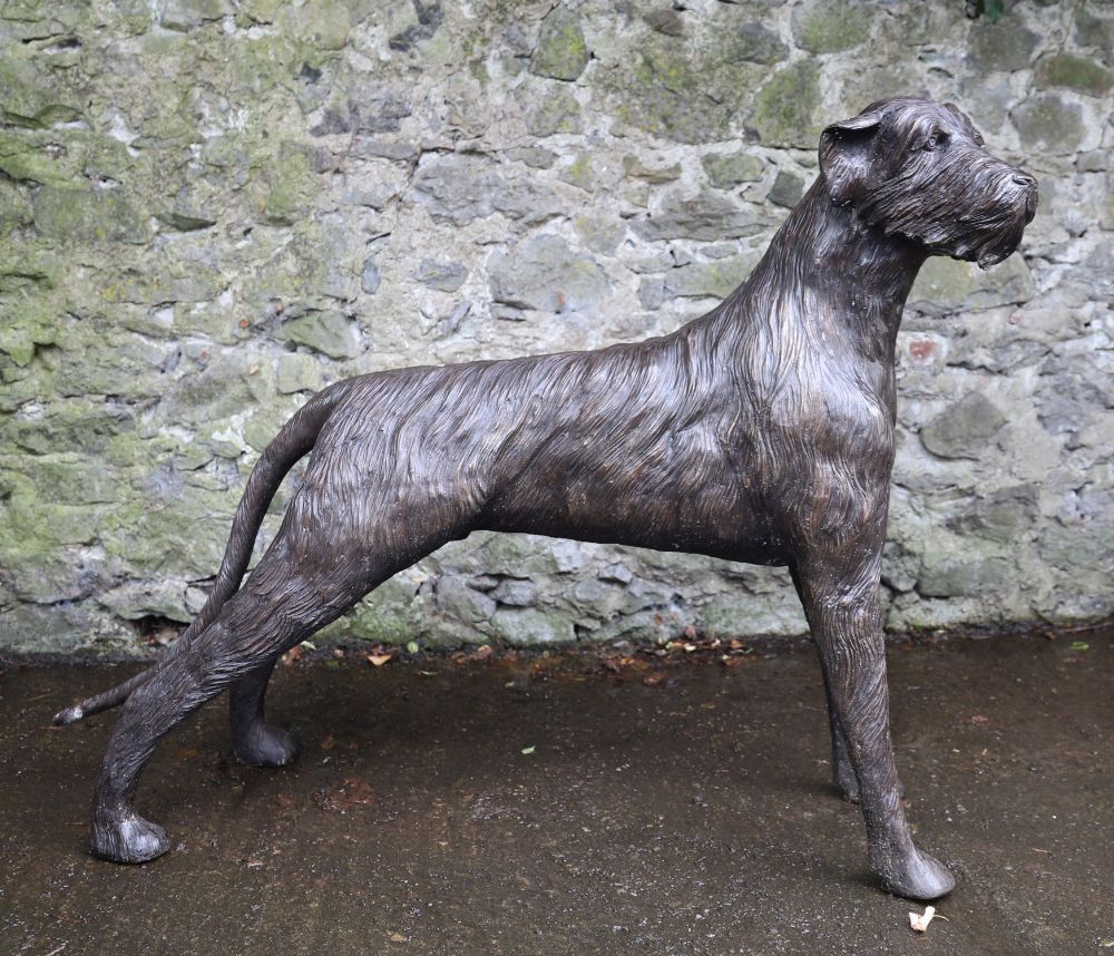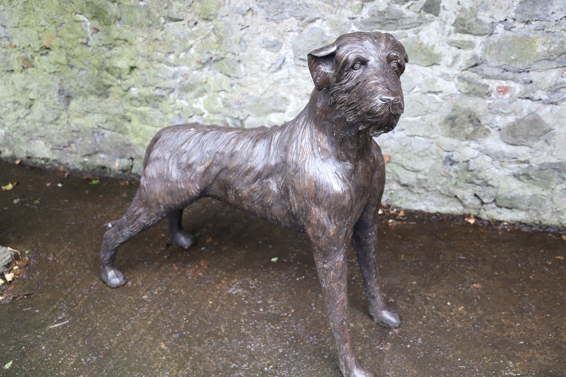 A striking lifesize bronze sculpture of an Irish wolfhound, finely modelled with naturalistic detail capturing the noble stance and textured coat of the breed. The work is signed by the sculptor, demonstrating skilled craftsmanship and attention to anatomical accuracy. Patinated surface with rich, varied tones enhancing depth and character.