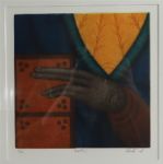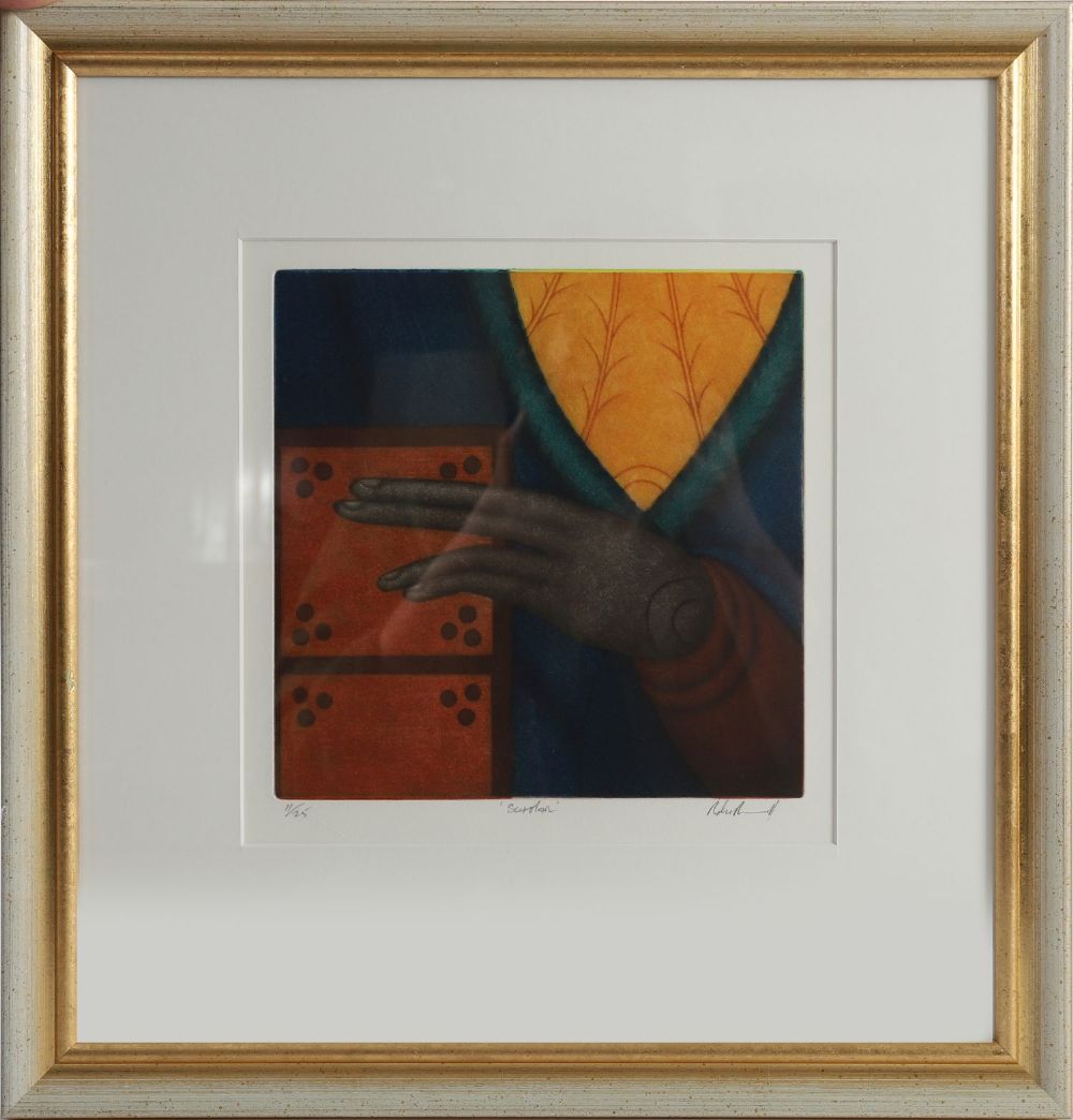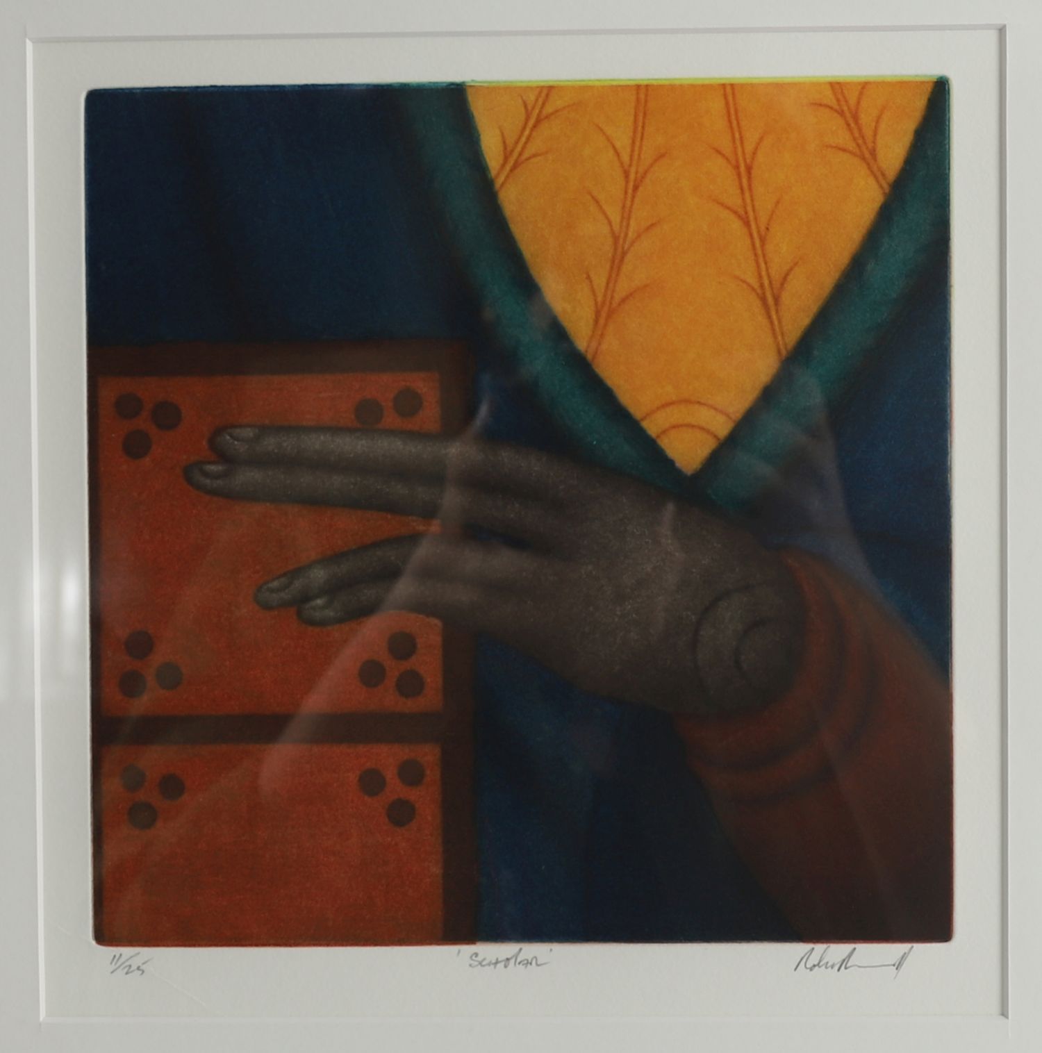 Striking limited edition print titled "Scholar", numbered 11/25, depicting a stylised hand set against a richly coloured geometric and patterned background in tones of blue, gold, and red. The composition blends figurative detail with abstract form, creating a bold visual statement. Signed by the artist in pencil to the lower margin and presented in a gilt frame with white mount.