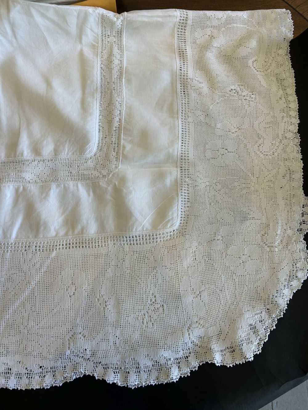 The wider border contains 'Filet Crochet Lace', the border above the main border features ' Drawn Thread Work' also known as 'Atrante' needlework. The fabric also features machine or hand-cut embroidery.