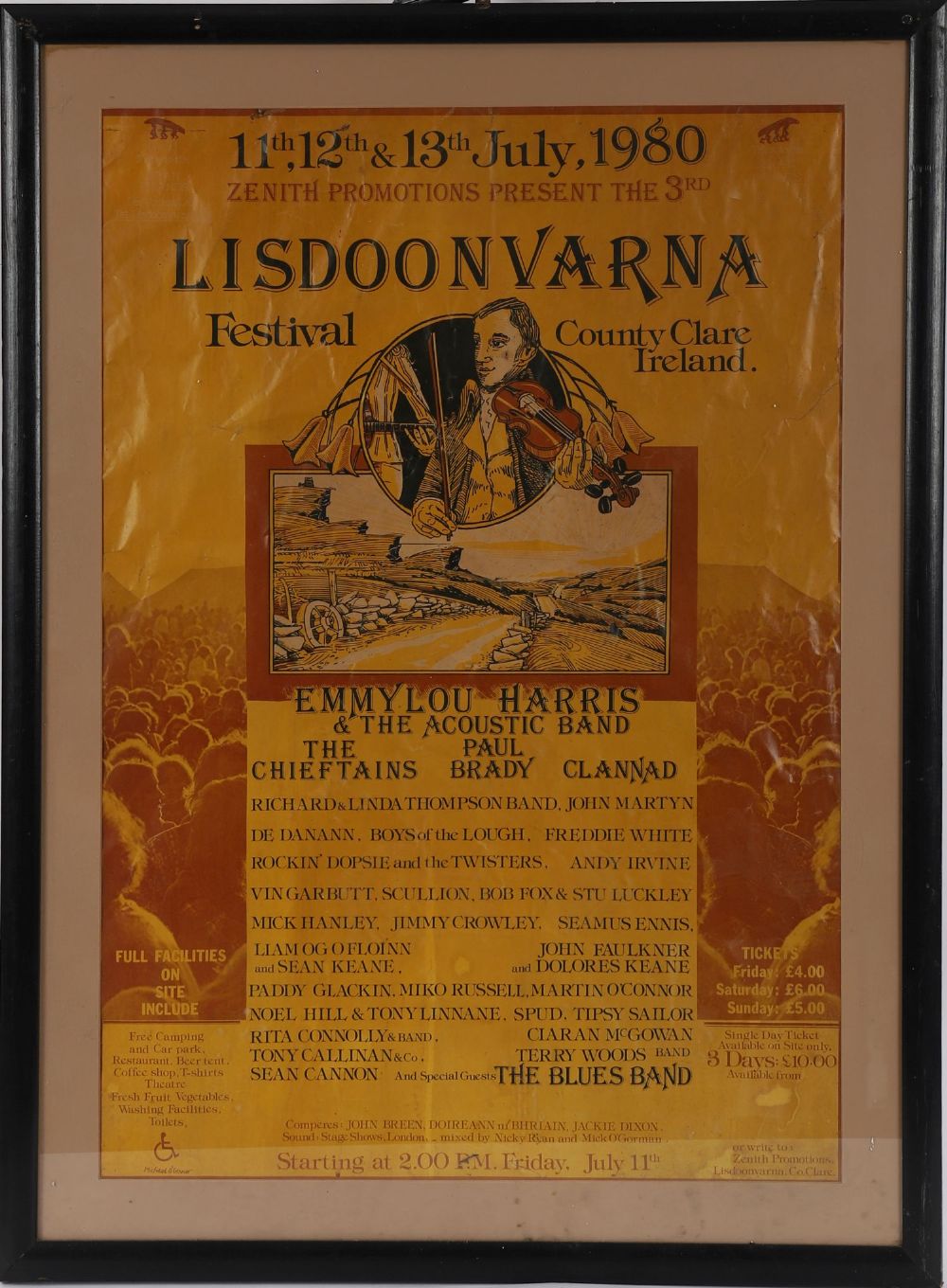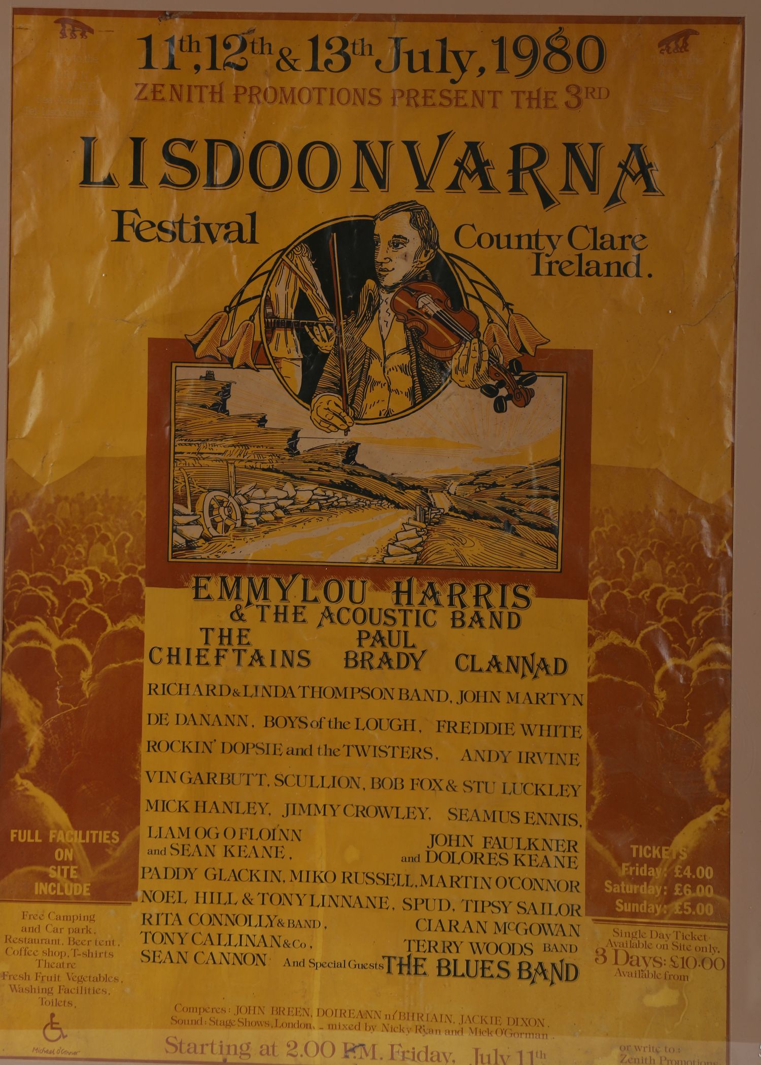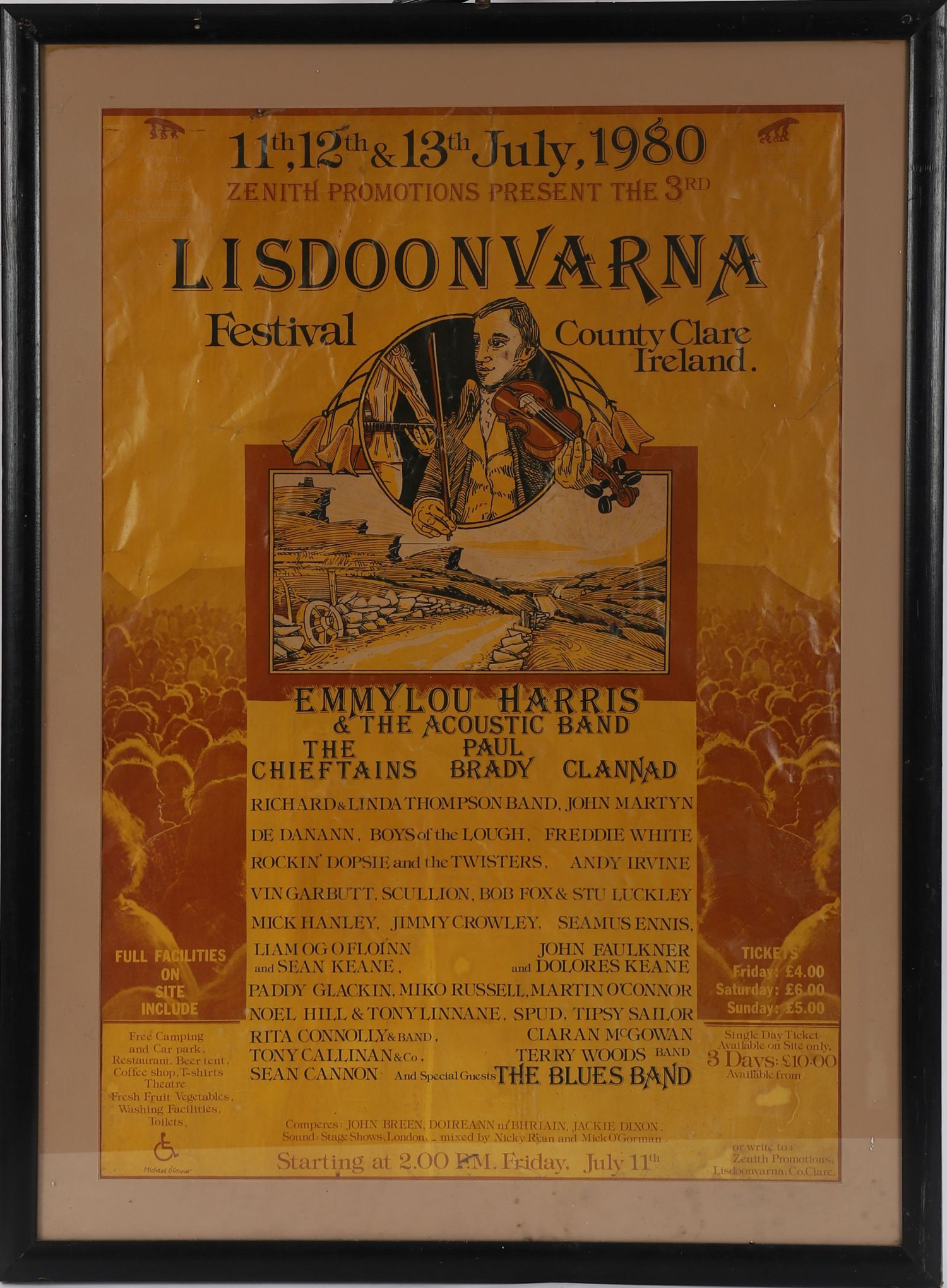 Original framed poster advertising the 3rd Lisdoonvarna Festival, held in County Clare, Ireland, on 11th–13th July 1980. Featuring headline performers Emmylou Harris & The Acoustic Band, The Chieftains, Paul Brady, and Clannad, along with a host of other notable acts. Printed in yellow and brown with central vignette of a fiddler and Irish rural scene.