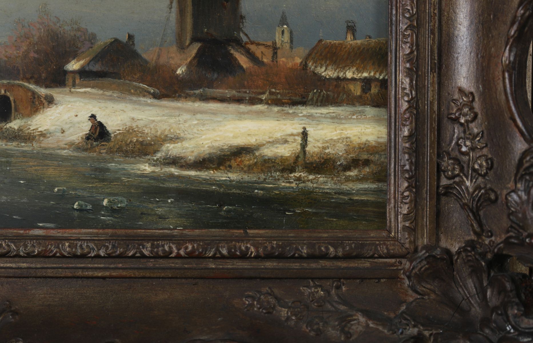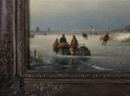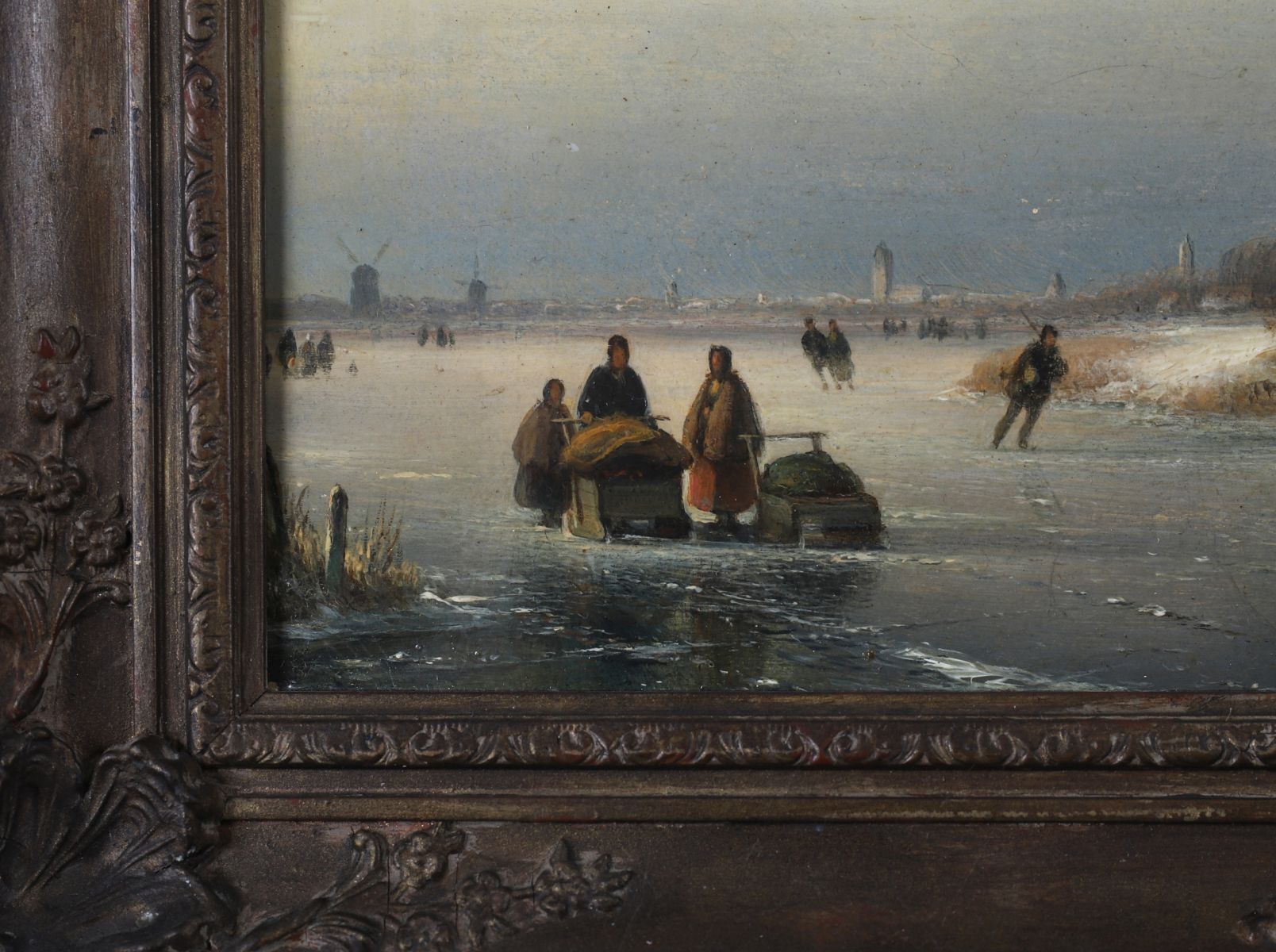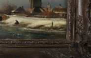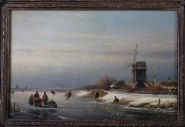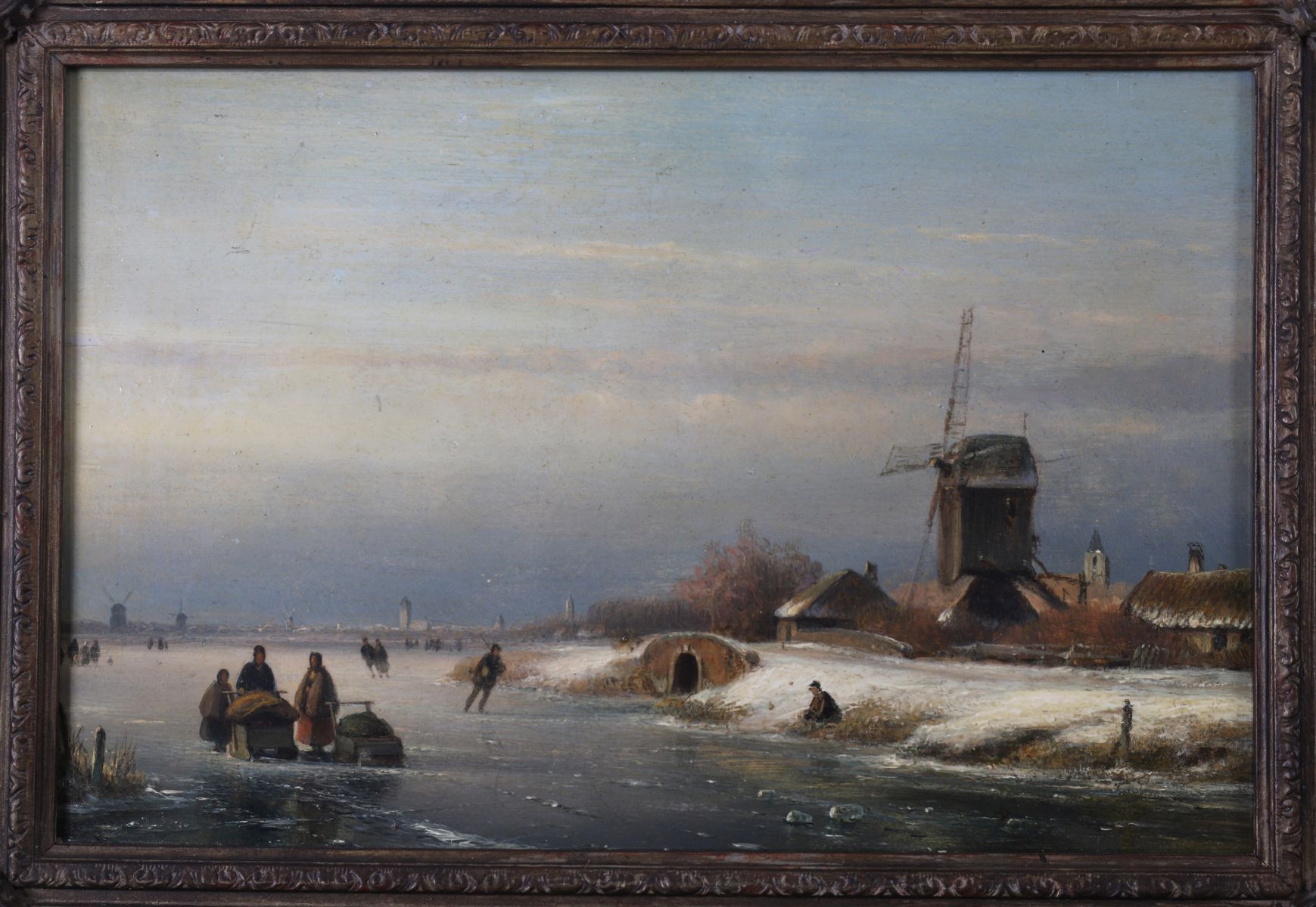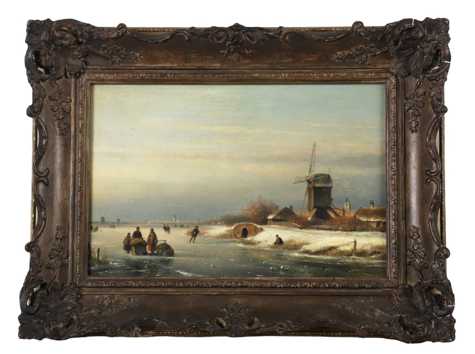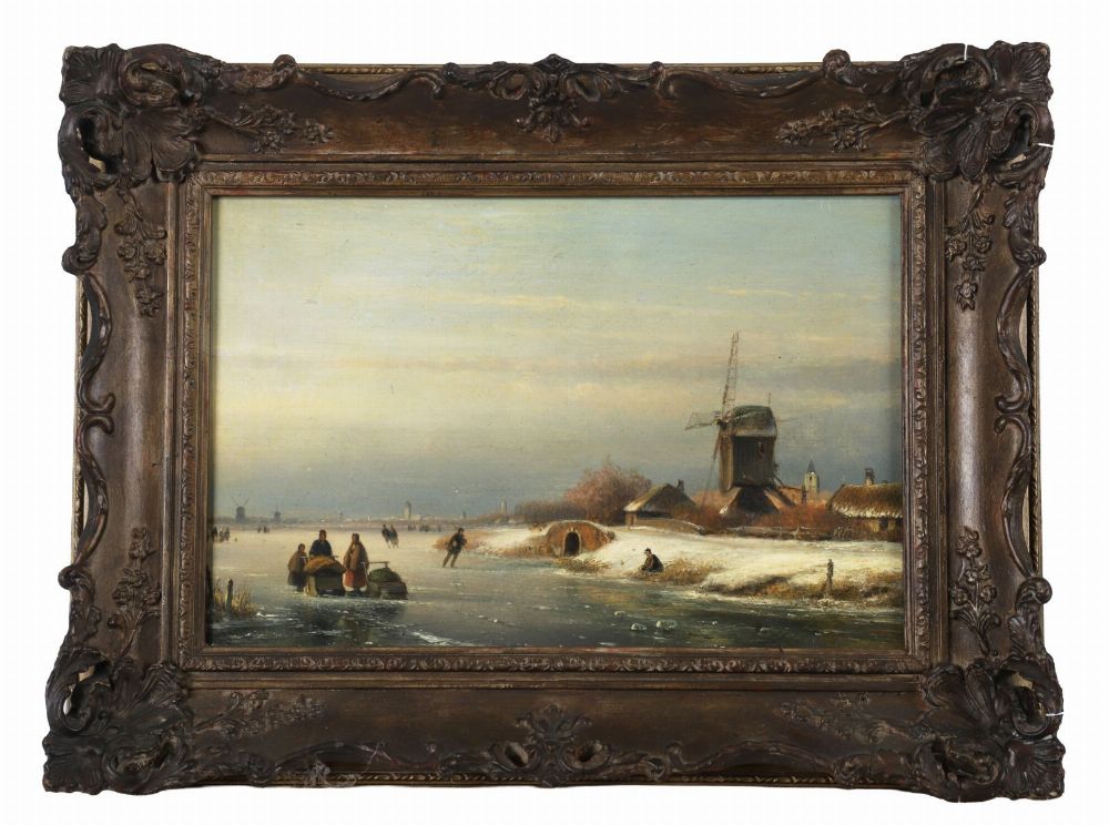 A winter landscape depicting figures skating and socialising on a frozen river near a village windmill beneath a golden sunset. Oil on panel, signed lower right. Presented in a Rococo-style gilt frame.