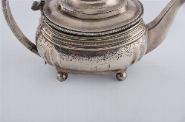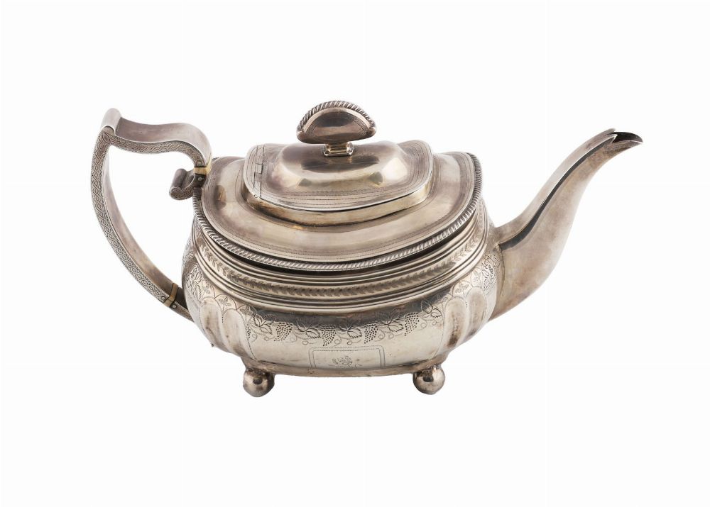 London, 1901. Oval body with engraved foliate borders and scroll handle.