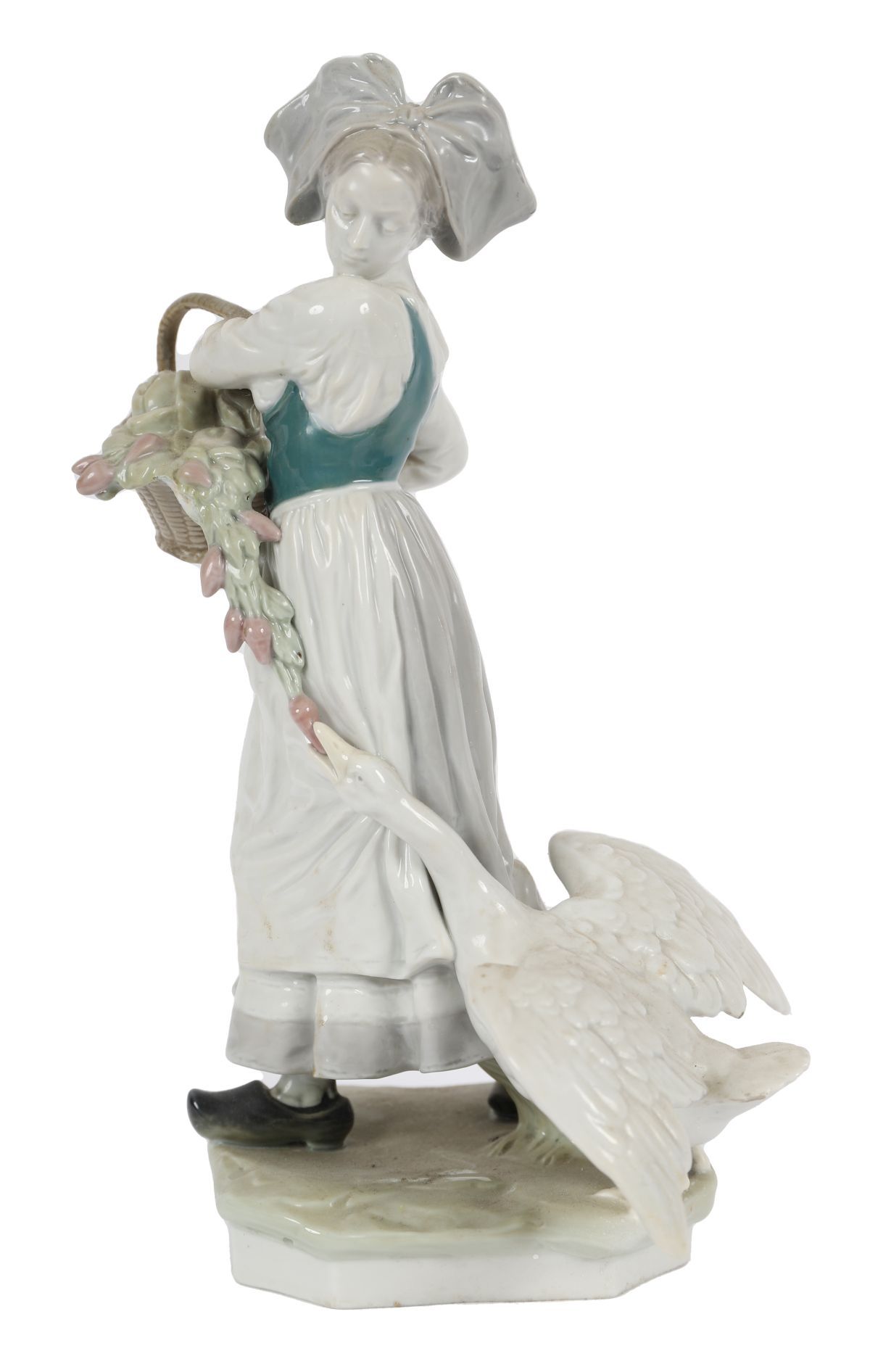 Polychrome porcelain figure depicting a young maiden carrying a basket of flowers, accompanied by a goose at her side. The modelling, palette and pastoral subject are consistent with Lorraine / Lunéville-type production.