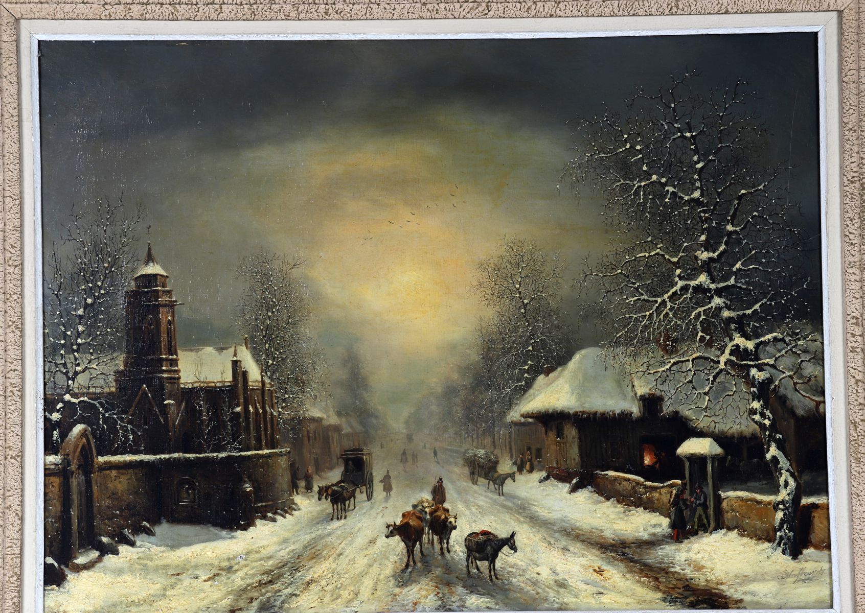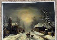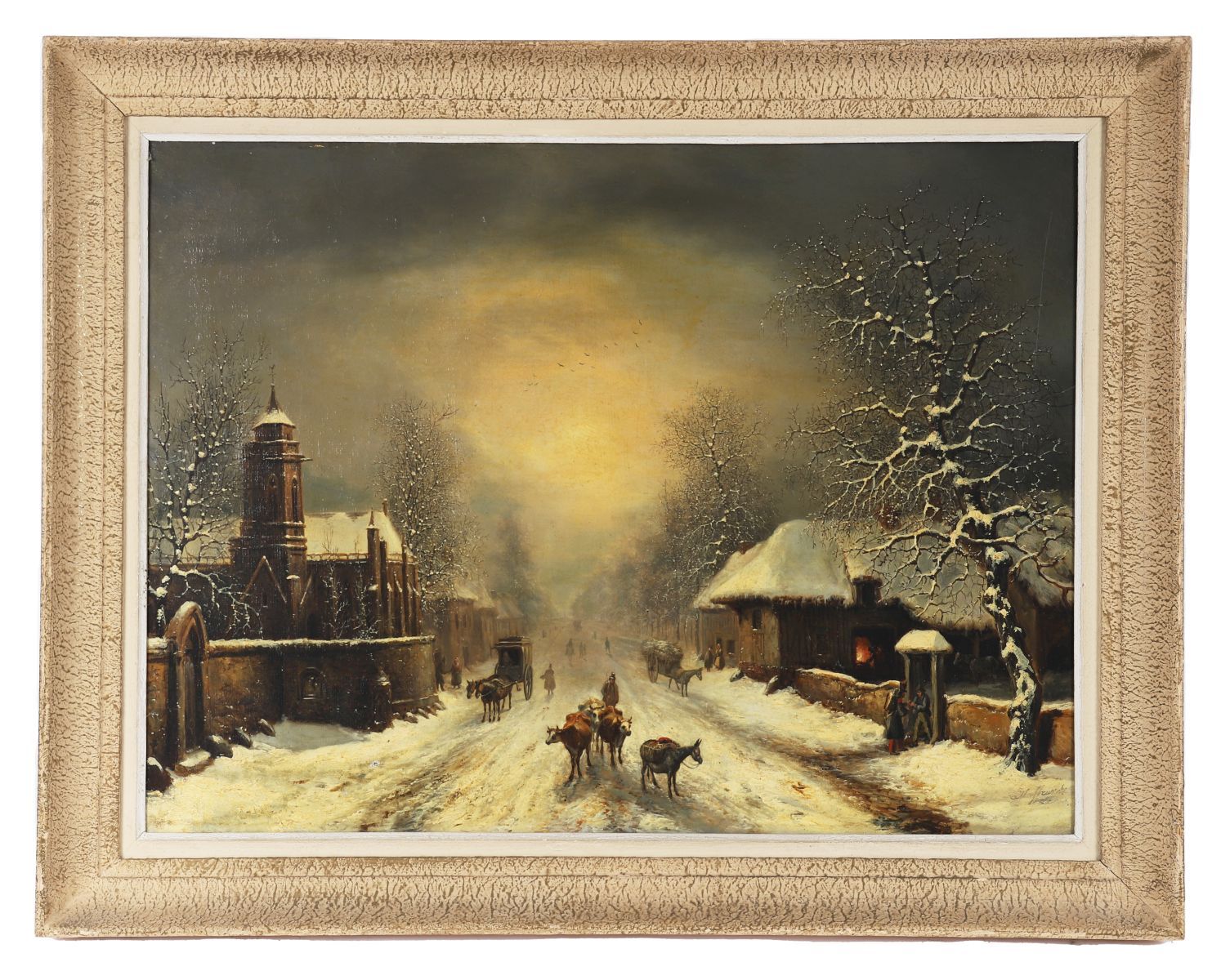 A winter landscape by Louis Claude Malbranche depicting a snow-covered village street animated by figures, carts, and livestock, painted in muted tonal harmonies with strong atmospheric effect. A characteristic and scarce work by the artist, best known for his finely observed winter scenes.