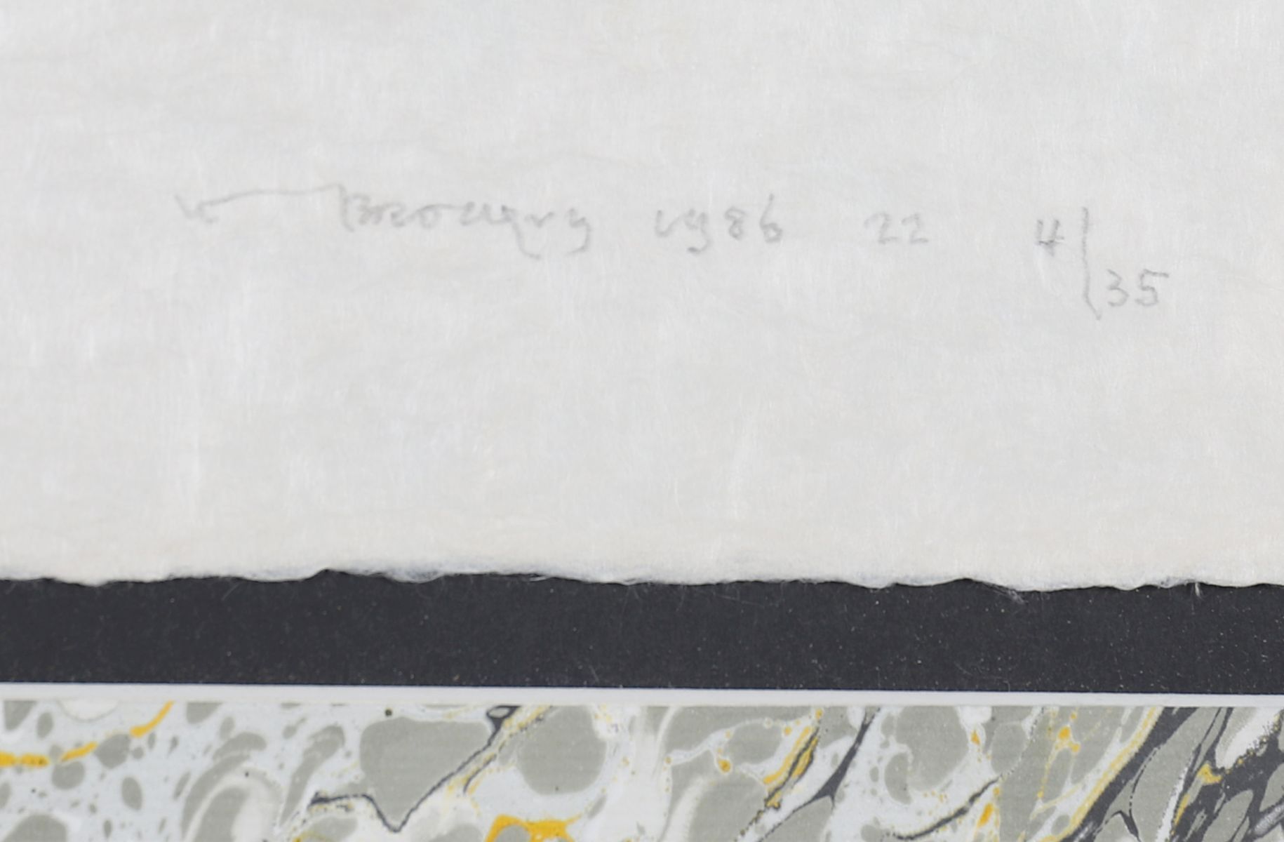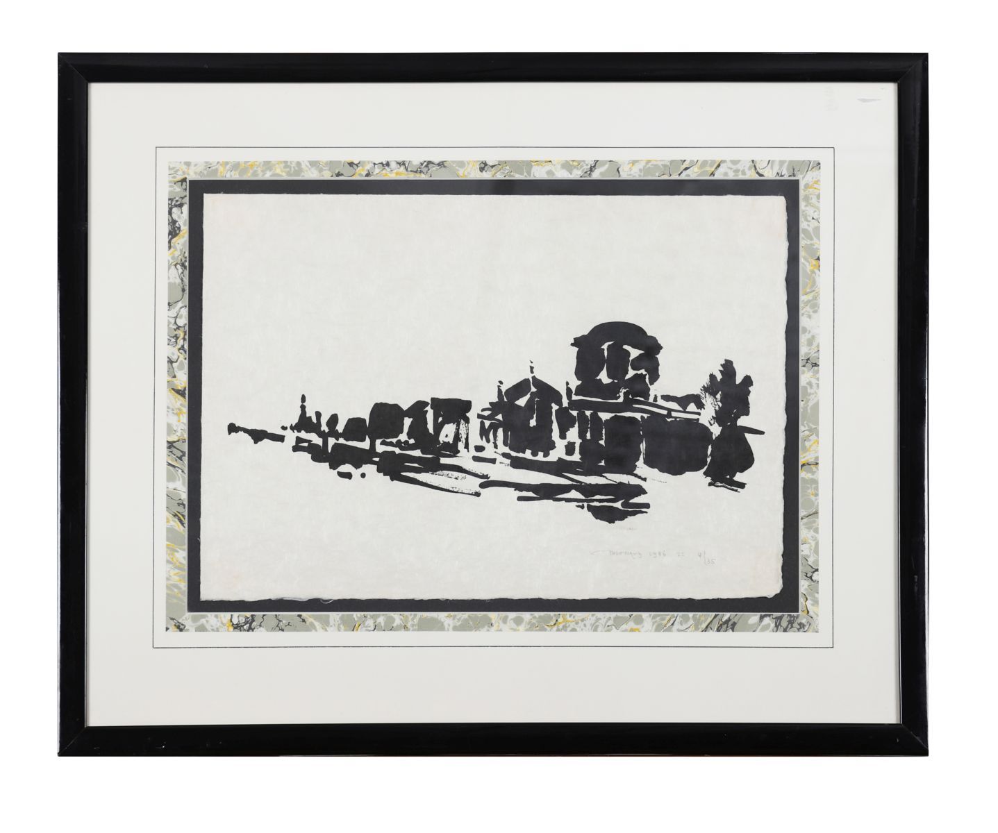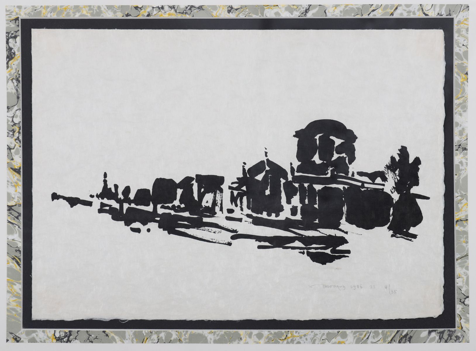 A limited edition lithograph by Louis le Brocquy depicting the Custom's House in bold black form against a pale ground. Executed with the artist’s characteristic economy of line and expressive abstraction, the work evokes the rhythm and atmosphere of Dublin life. Signed and dated in pencil lower right, numbered 4/35. Presented in a marbled mount and black frame.