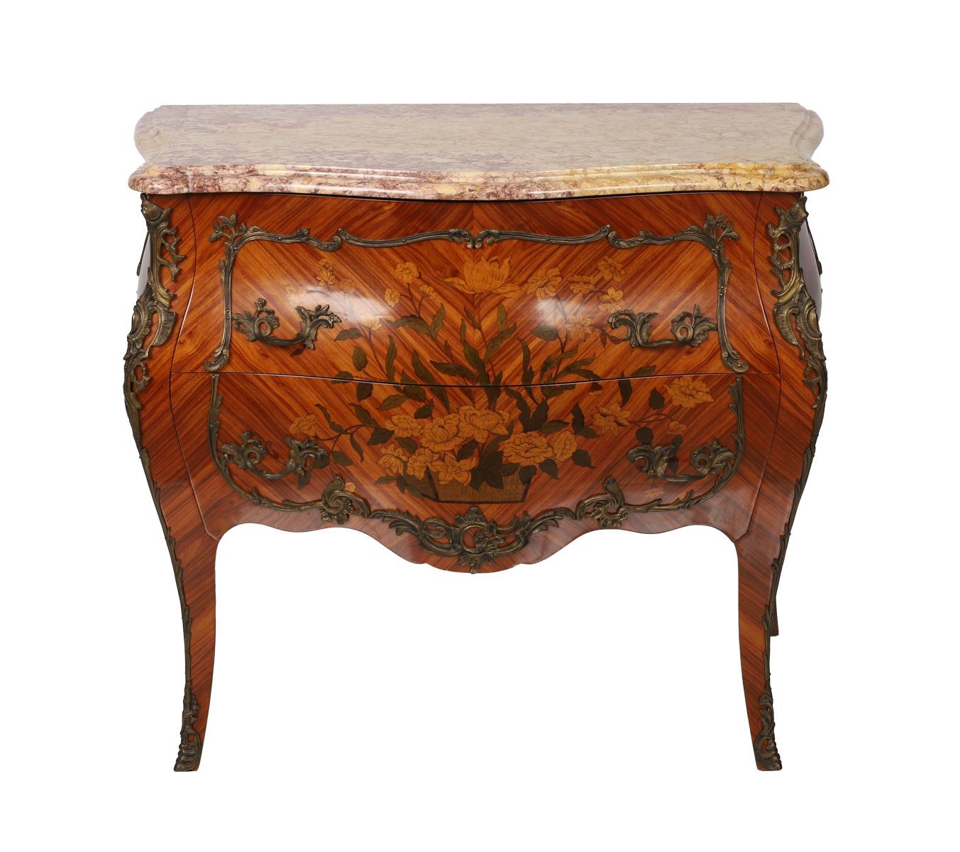 A Louis XV-style floral marquetry commode, the serpentine Breche d’Alep marble top above two drawers with gilt-bronze mounts and shaped apron, raised on cabriole legs with gilt-bronze sabots.