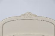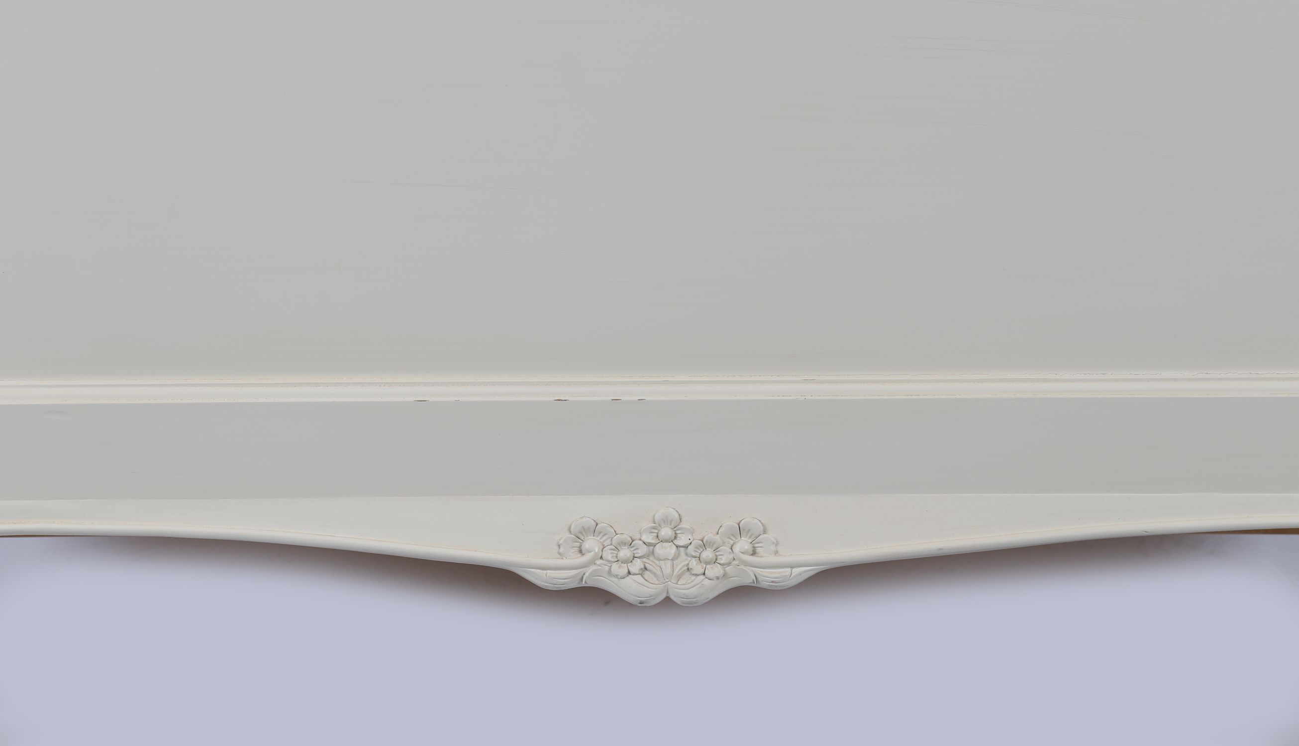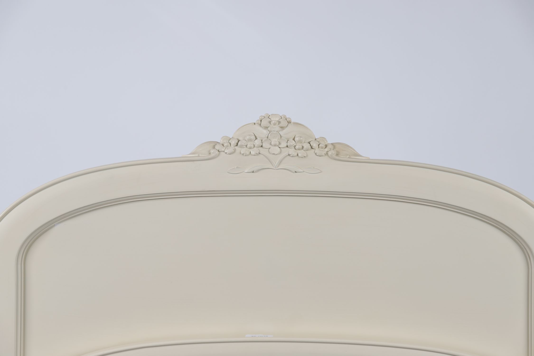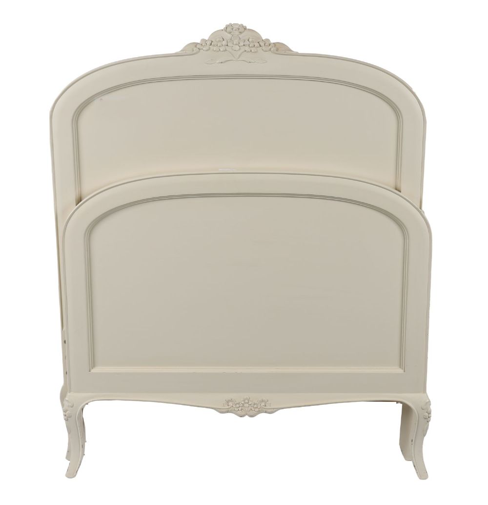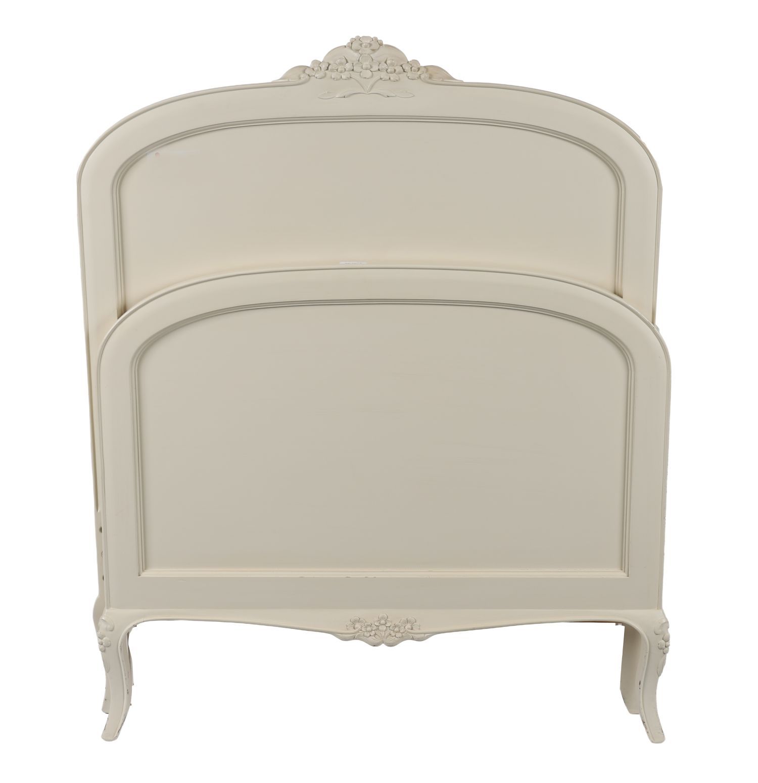 A Louis XV style single bed frame, the headboard with arched crest and carved floral decoration, the footboard with matching shaped outline and recessed panels, all raised on short scroll legs and finished in antique cream - refined Rococo influence throughout.