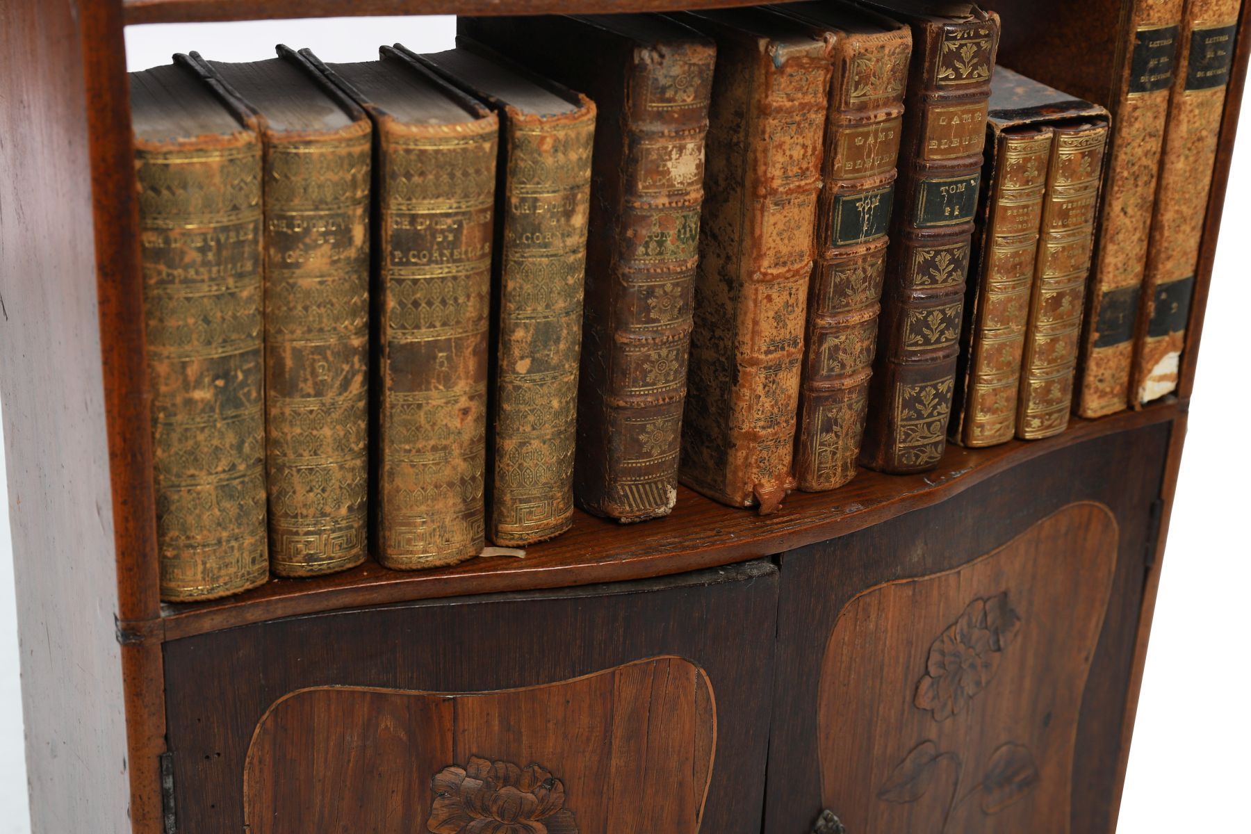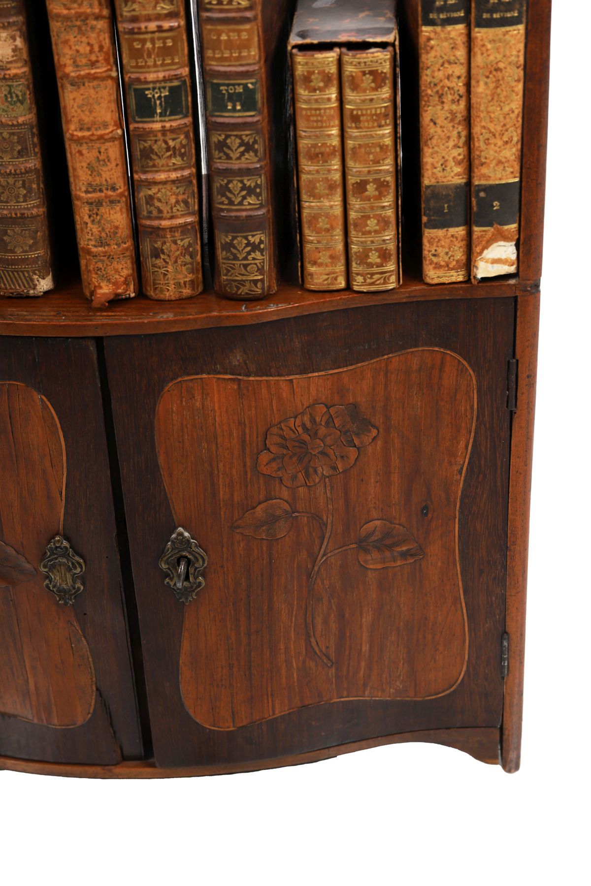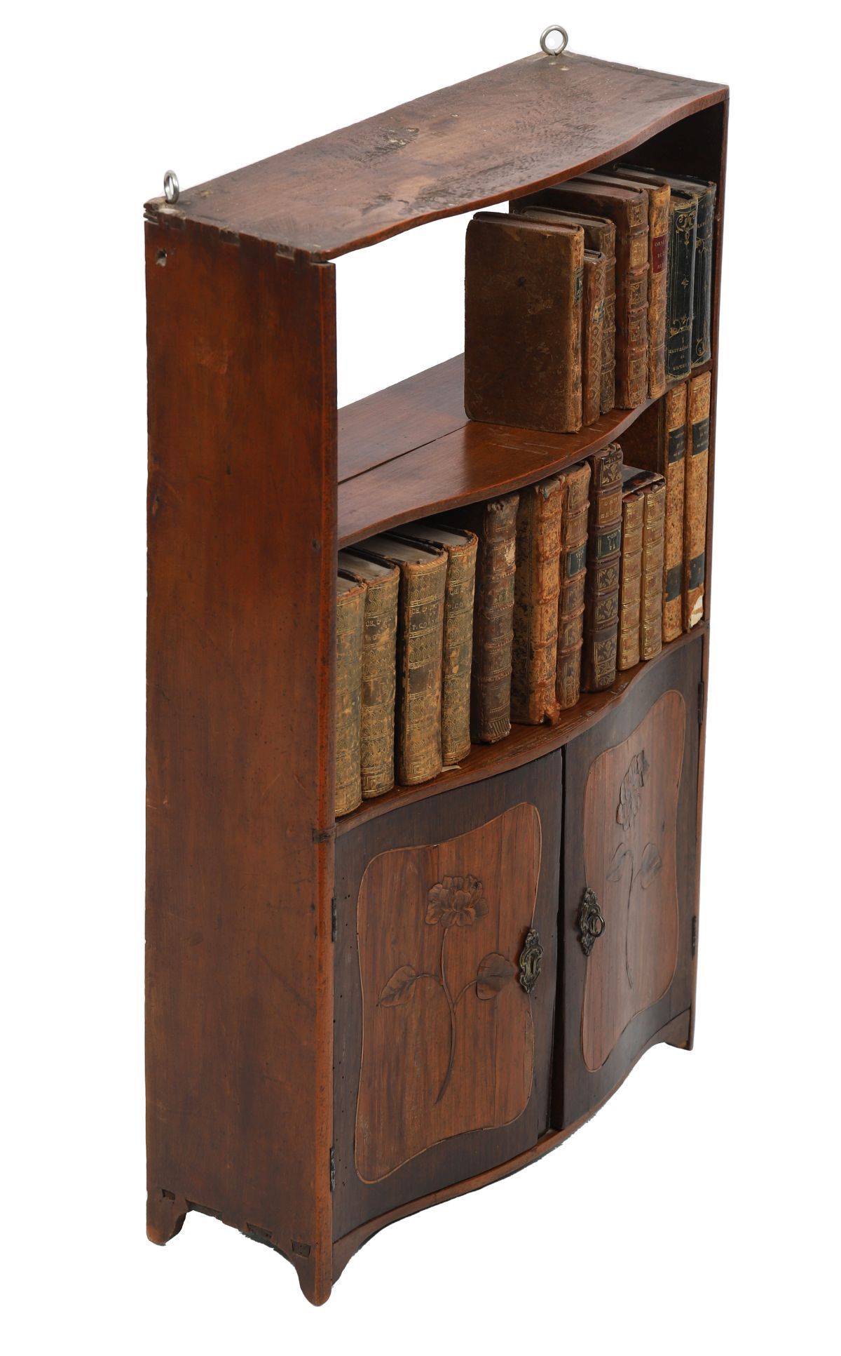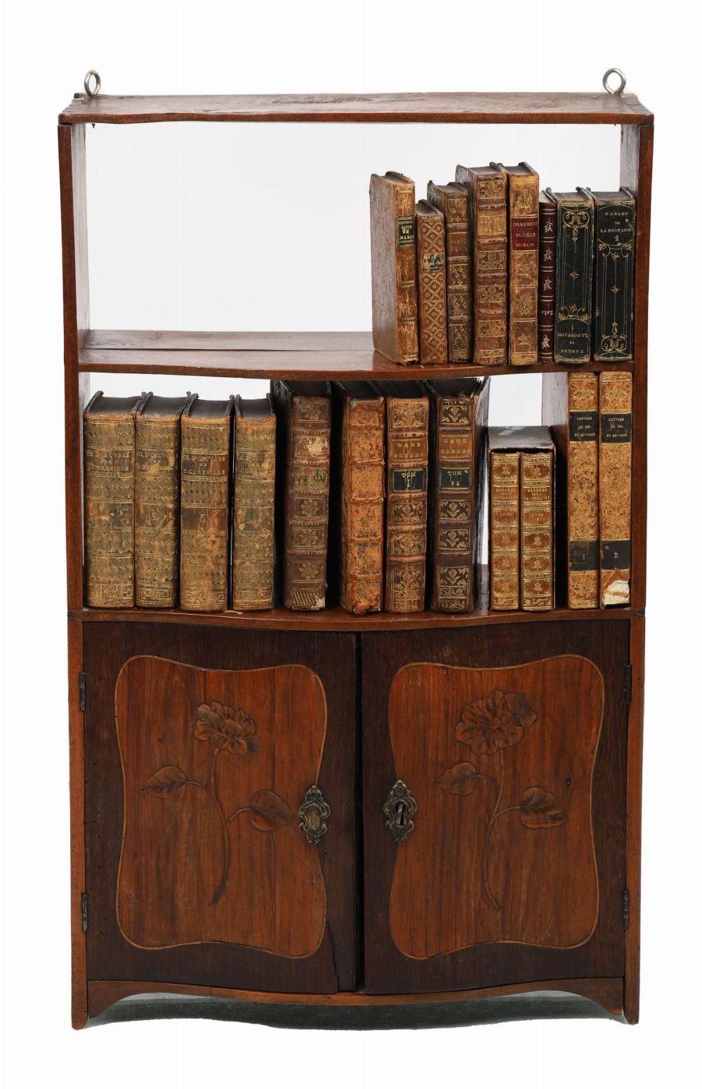 A Louis XVI period kingwood wall cabinet, 18th century, with shaped top above open shelving and a pair of cupboard doors below, decorated with marquetry floral panels and fitted with metal mounts.
