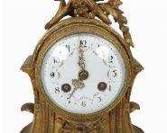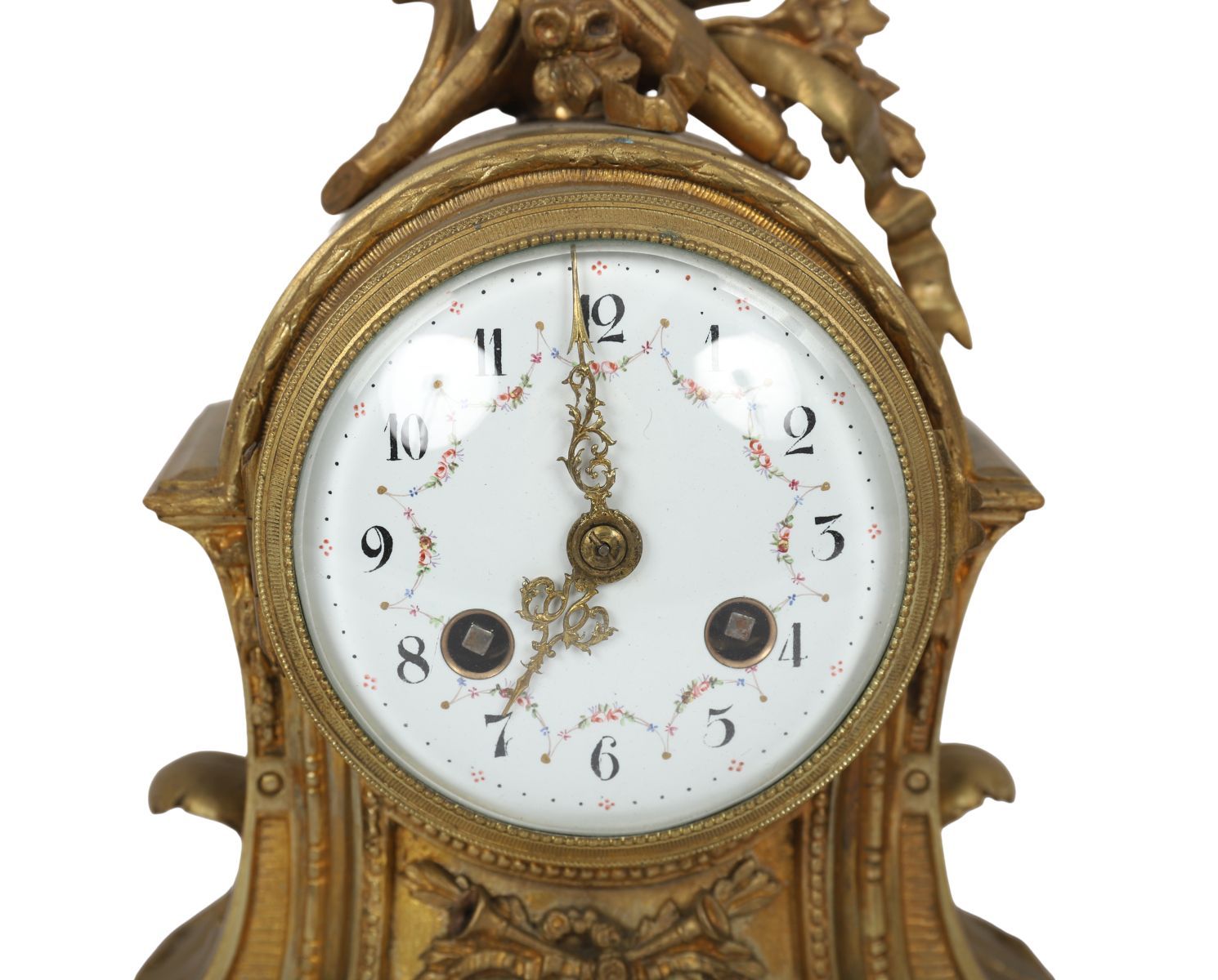 Late 19th century. The central drum clock with enamel dial surmounted by twin doves, flanked by a pair of matching urn sidepieces, all with foliate gilt-bronze mounts.