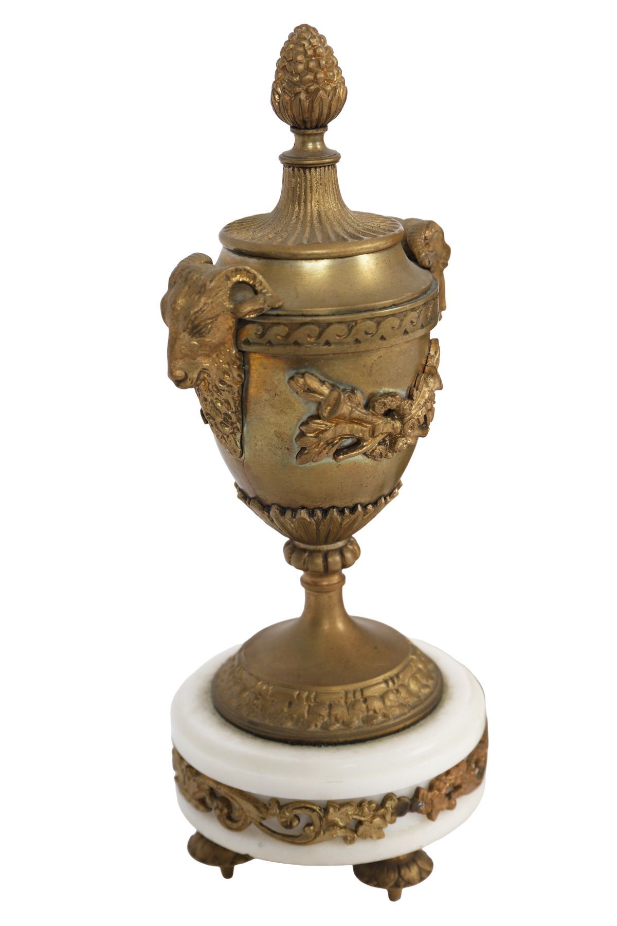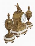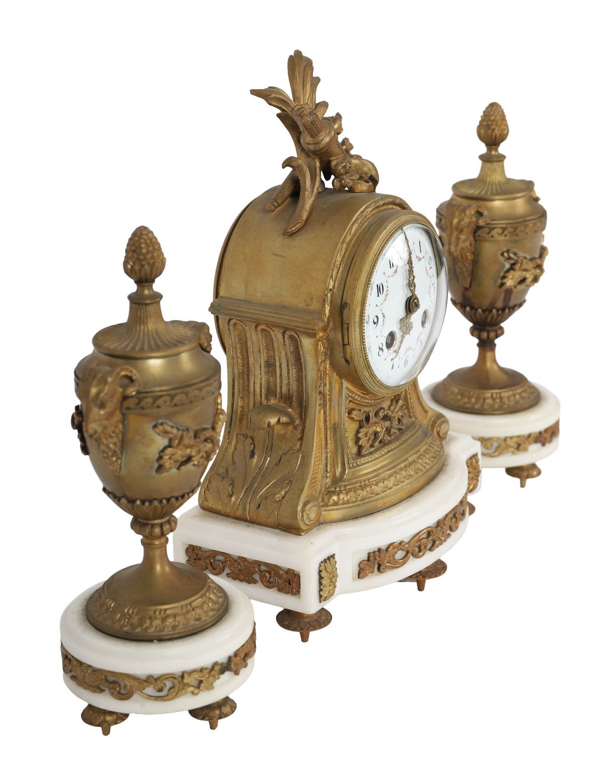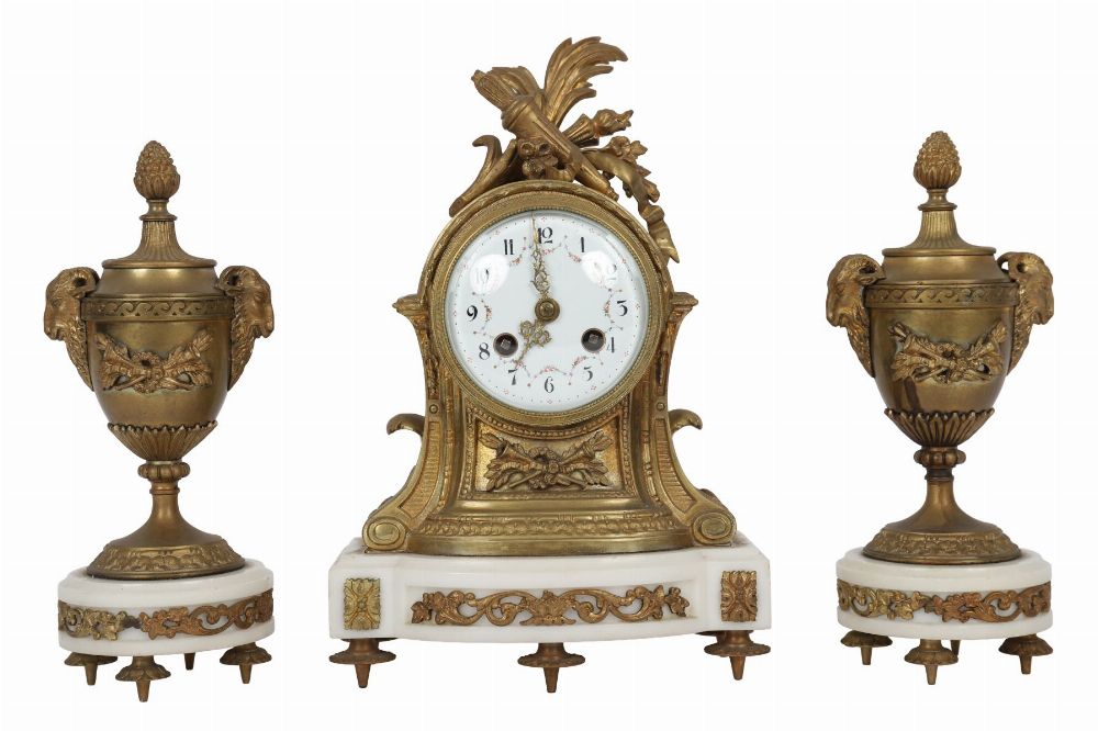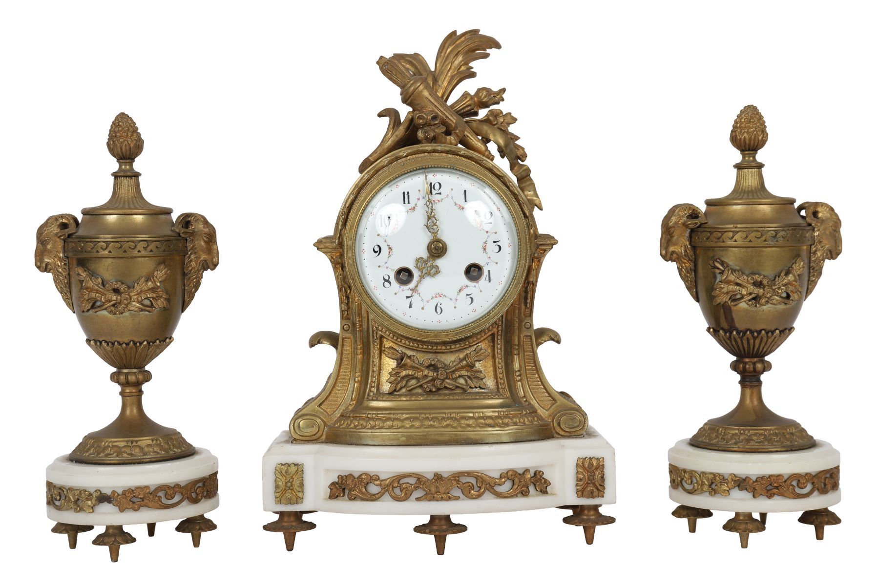 Lot 974 LOUIS XVI-STYLE ORMOLU AND WHITE MARBLE CLOCK GARNITURE