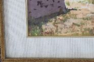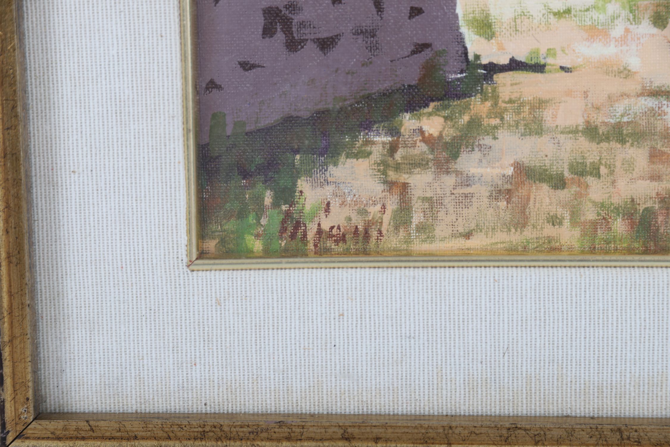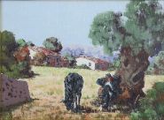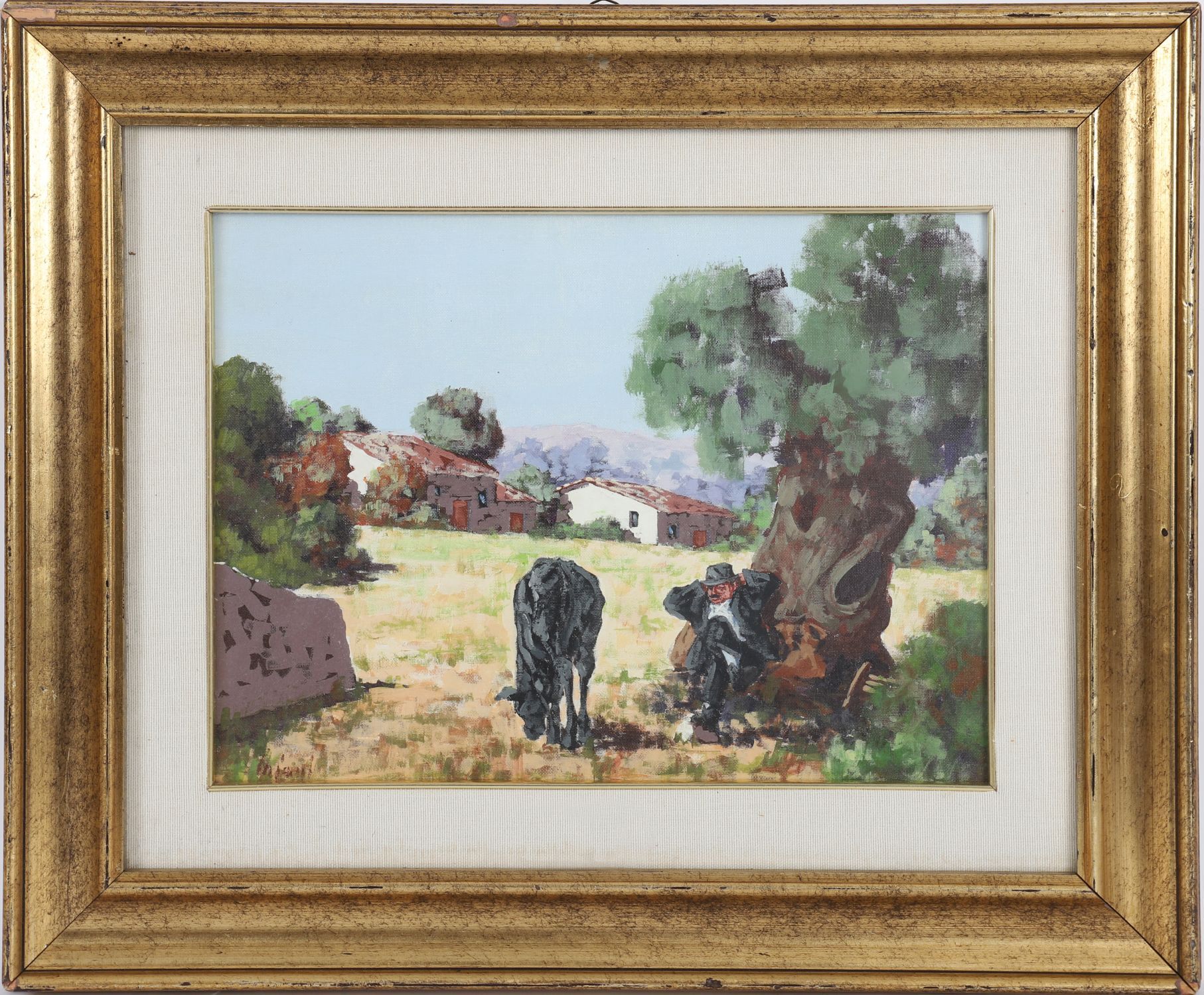 An oil on canvas depicting a rustic Italian landscape with farmhouses, a resting figure beneath a tree, and a grazing cow in the foreground. Painted in rich colours with impressionistic brushwork. Contained in a gilt frame.
