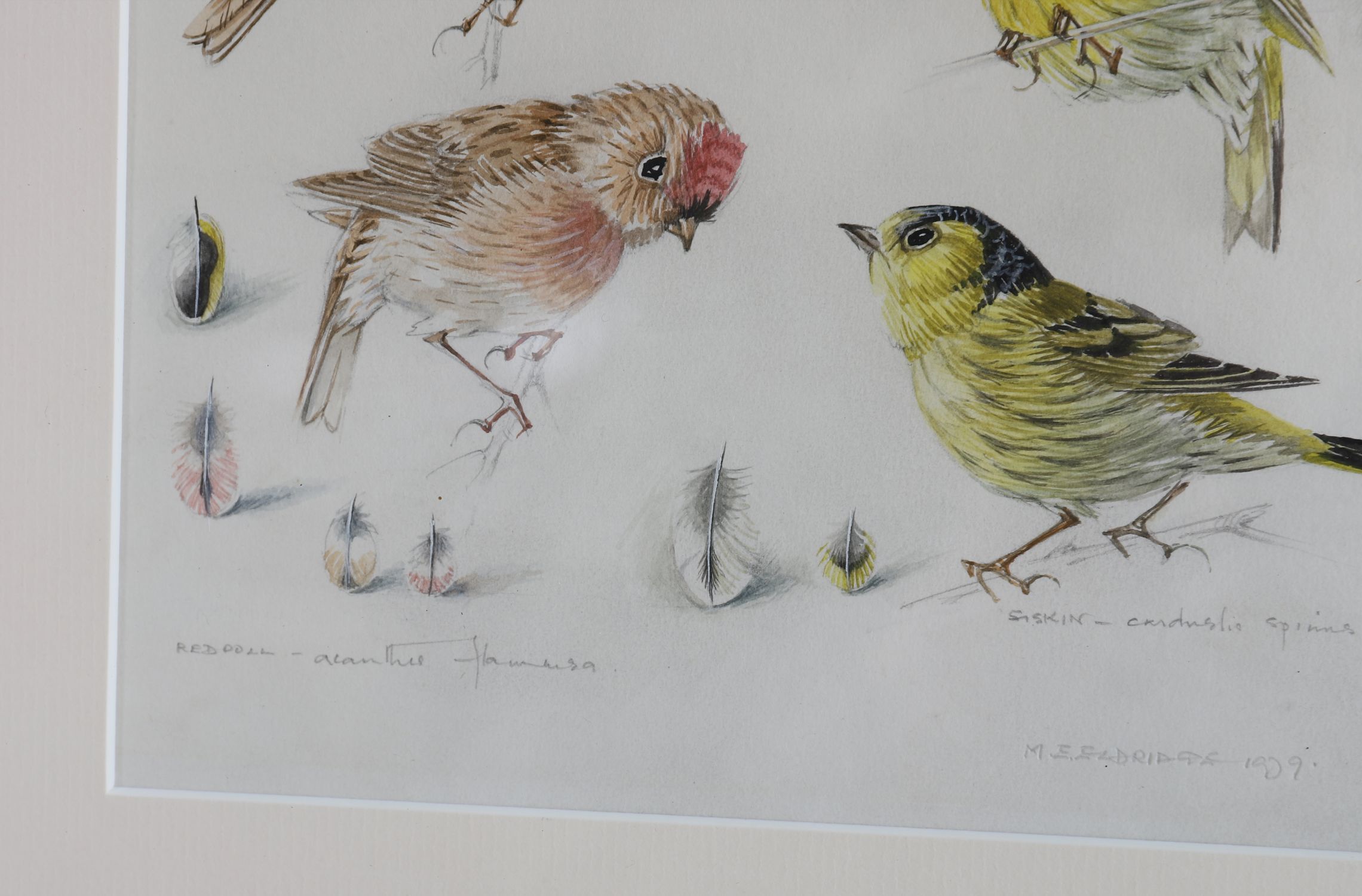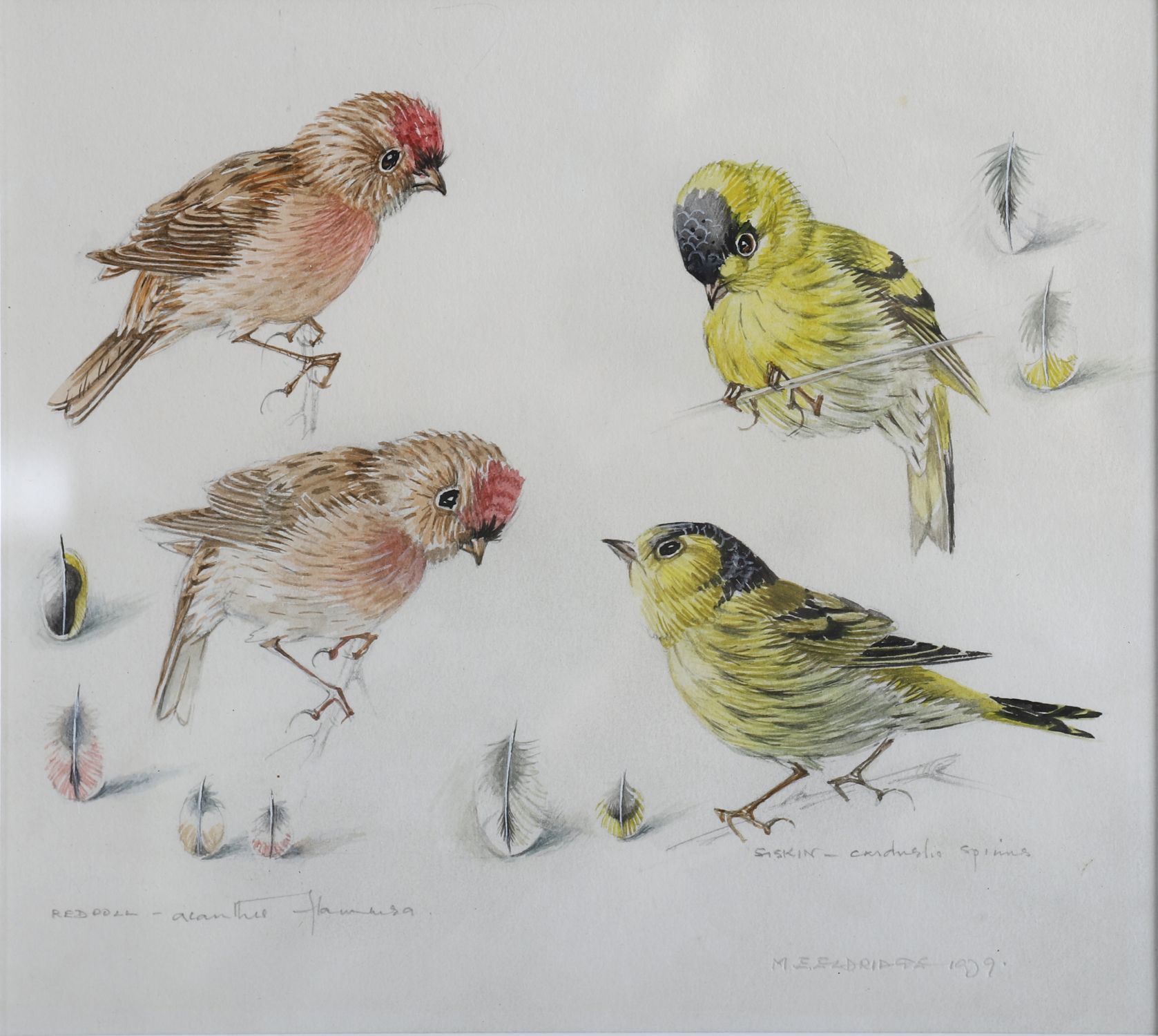 M.E. Penrose, watercolour and ink on paper, a detailed ornithological study depicting a group of four birds including redpolls (Acanthis flammea) and siskins (Carduelis spinus), with finely rendered feather details. Signed and titled lower right. Mounted and framed.