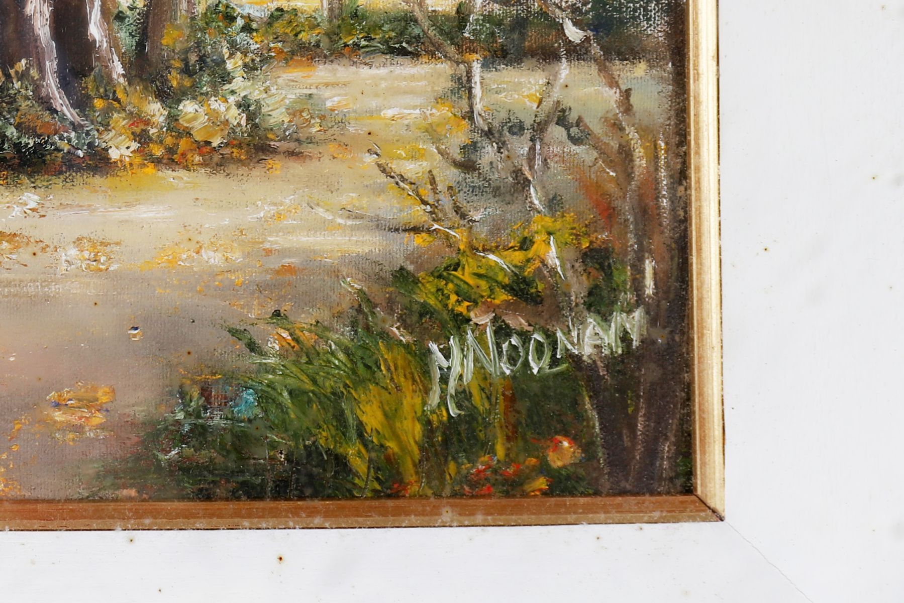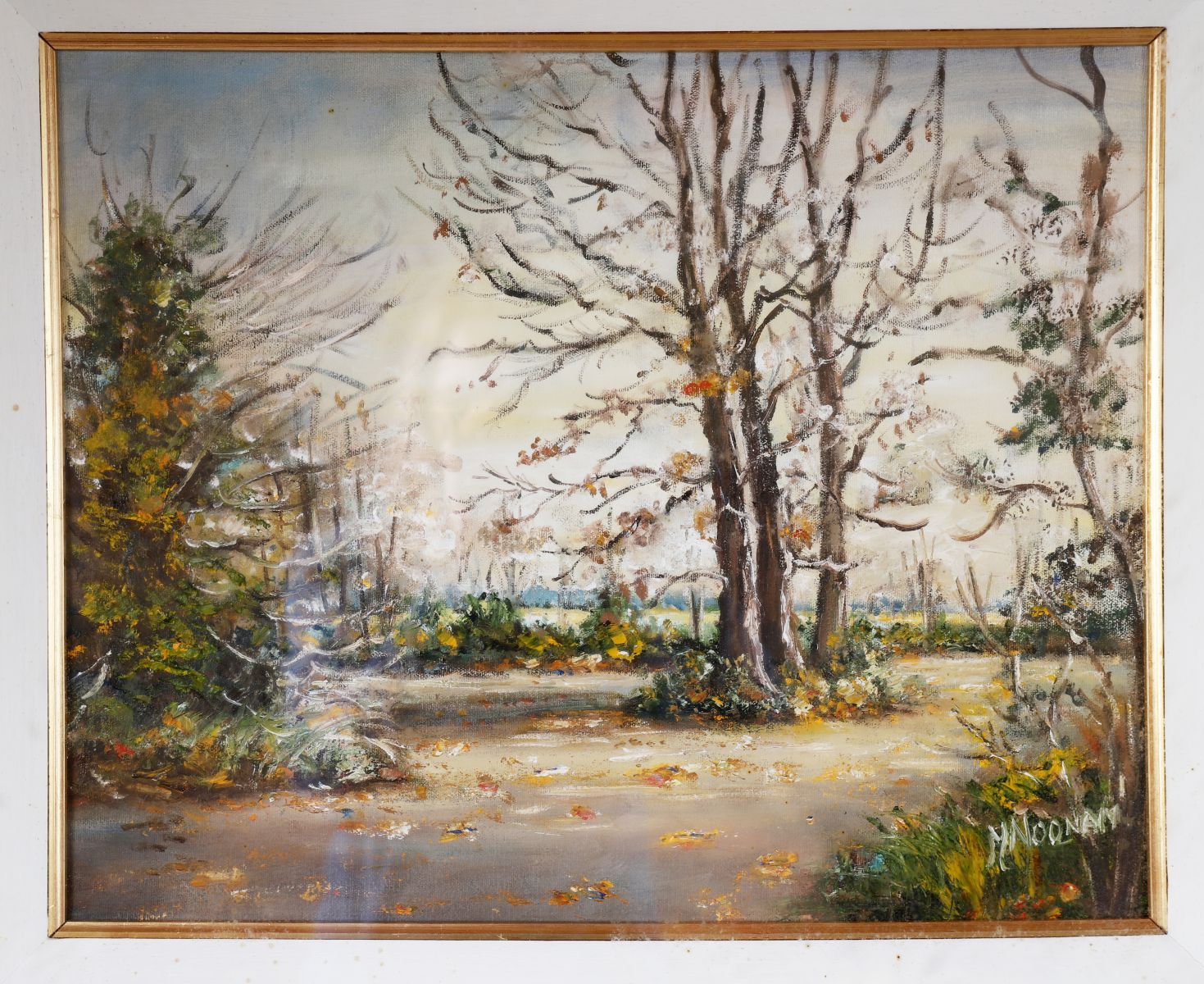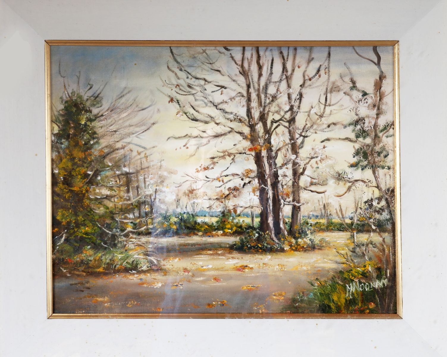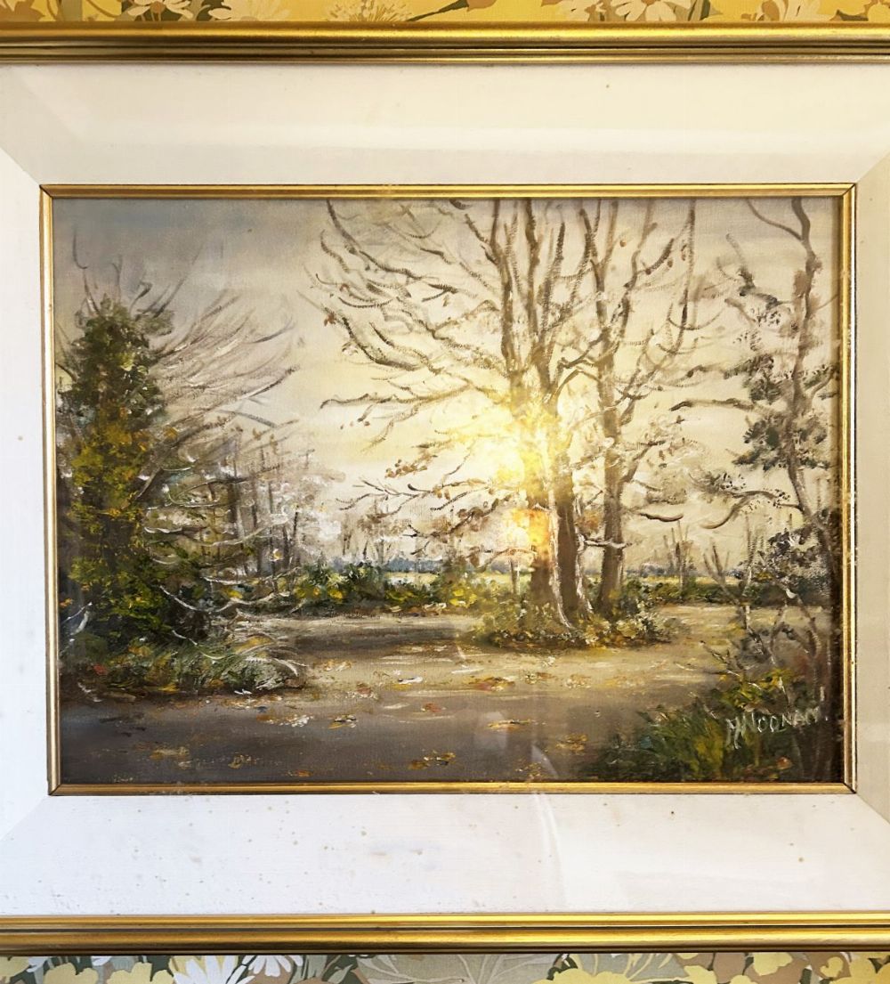 Oil on canvas depicting a wooded landscape in autumnal light, signed lower right M. Noonan. Enclosed in a painted and gilt frame.