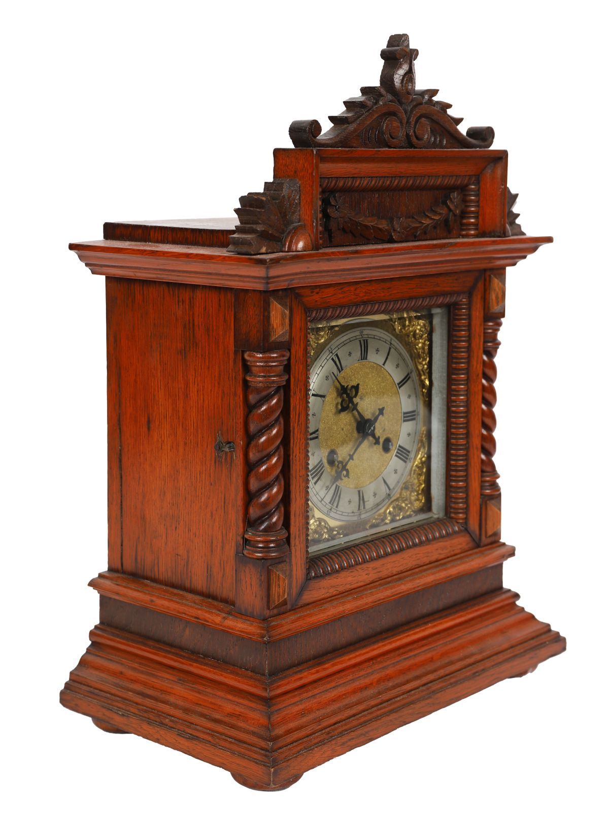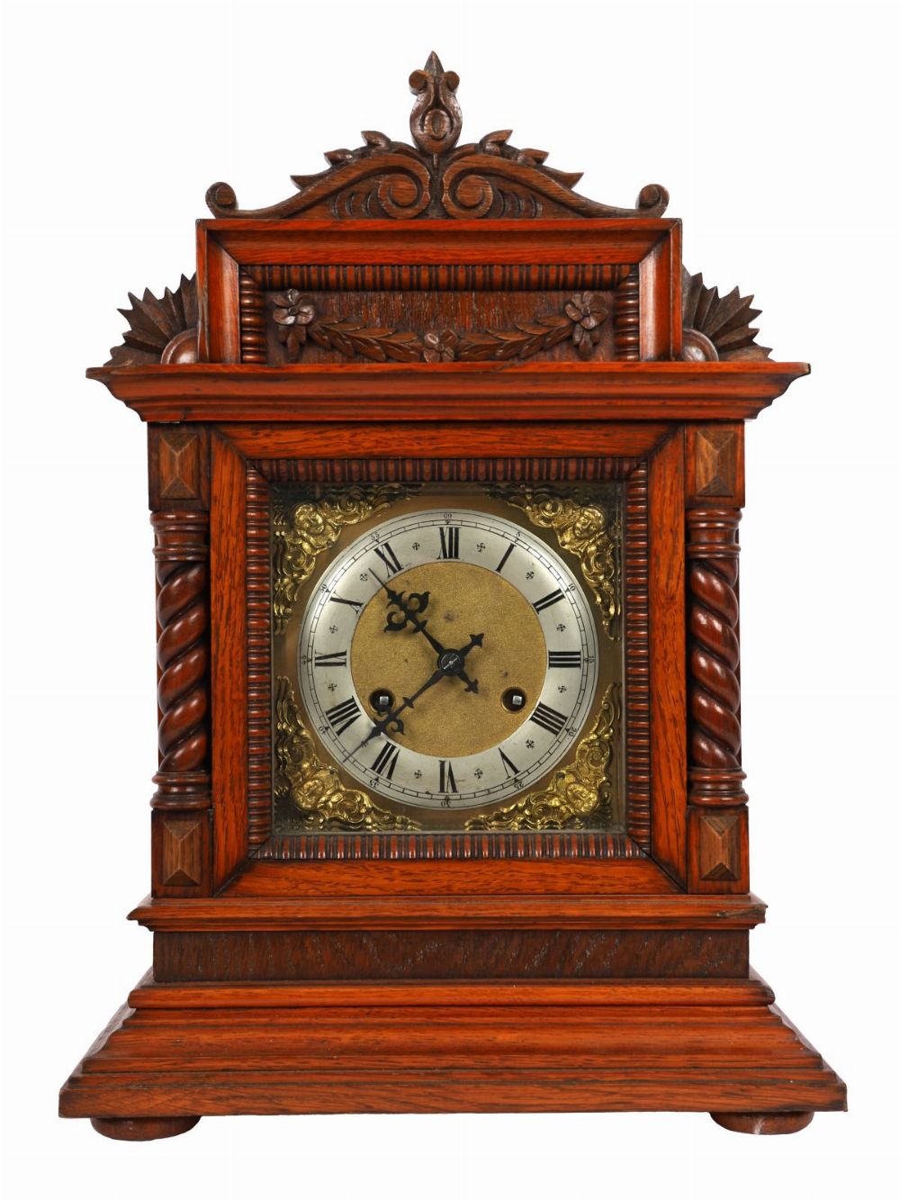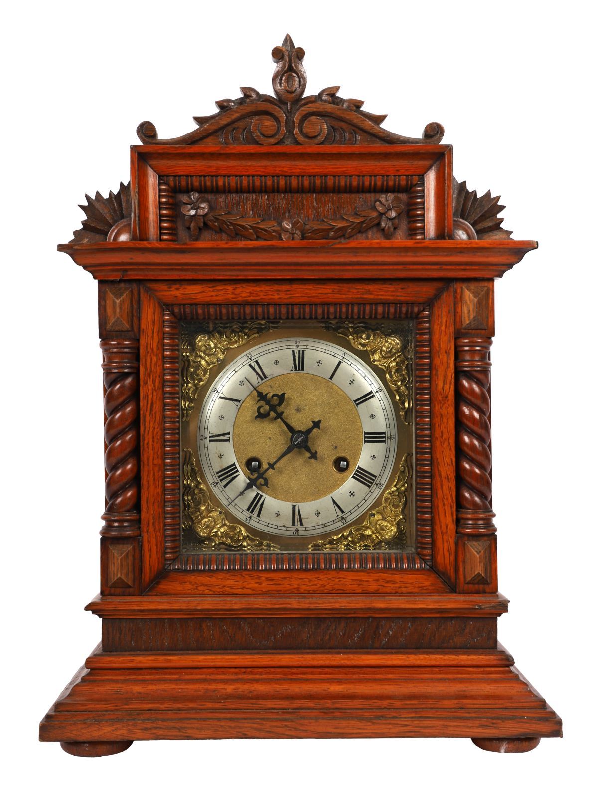 A late 19th to early 20th-century mantel clock, the architectural case richly carved with floral and scroll motifs and flanked by spiral twist columns. The gilt brass dial features a silvered chapter ring with black Roman numerals and ornate blued steel hands.
