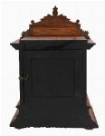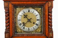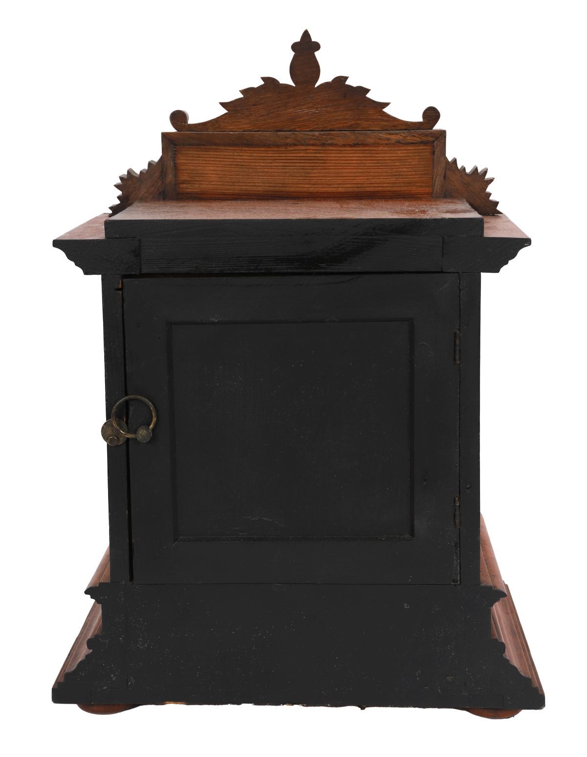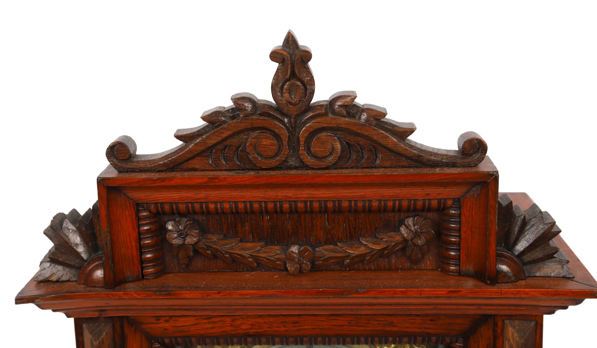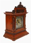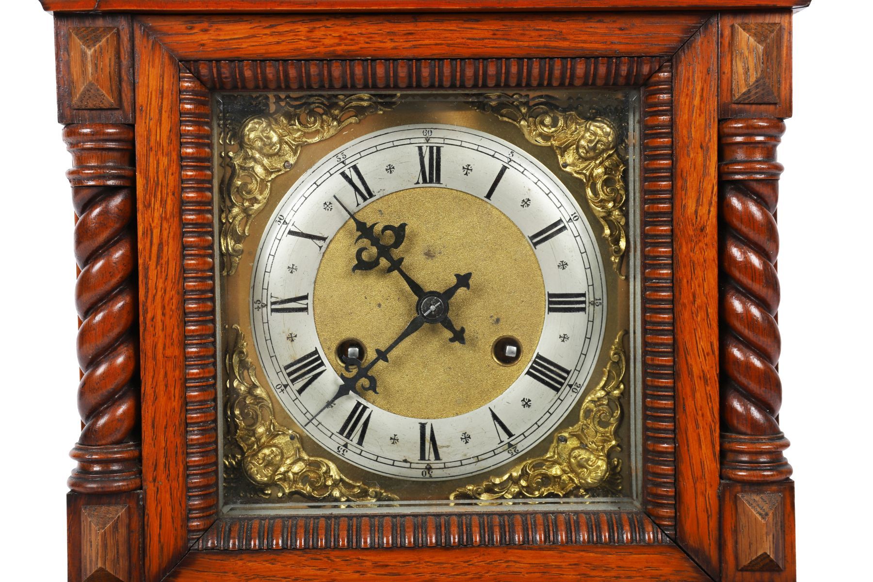 A late 19th to early 20th-century mantel clock, the architectural case richly carved with floral and scroll motifs and flanked by spiral twist columns. The gilt brass dial features a silvered chapter ring with black Roman numerals and ornate blued steel hands.