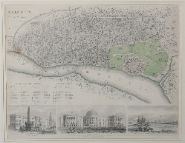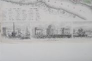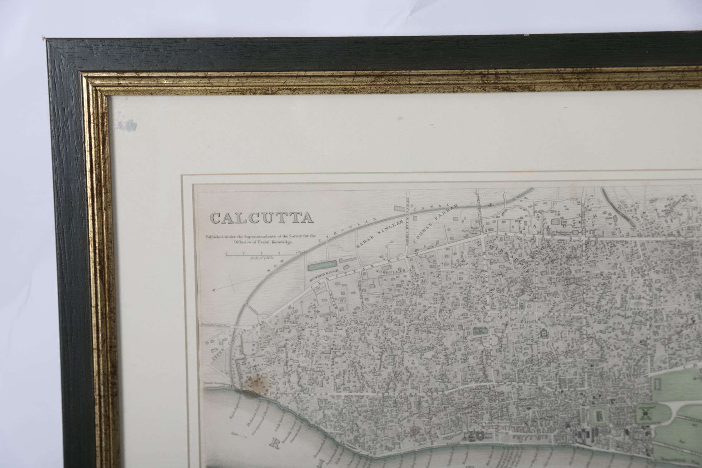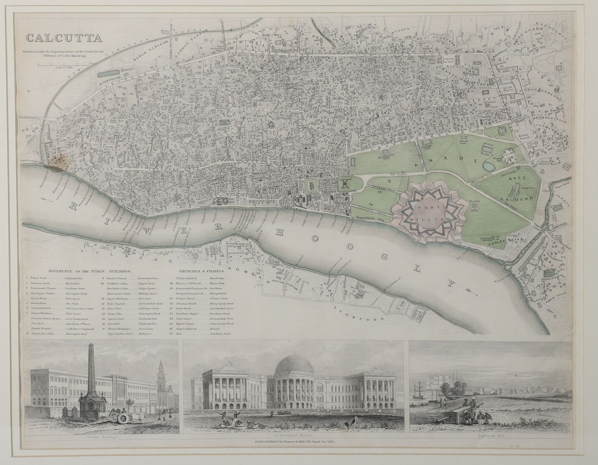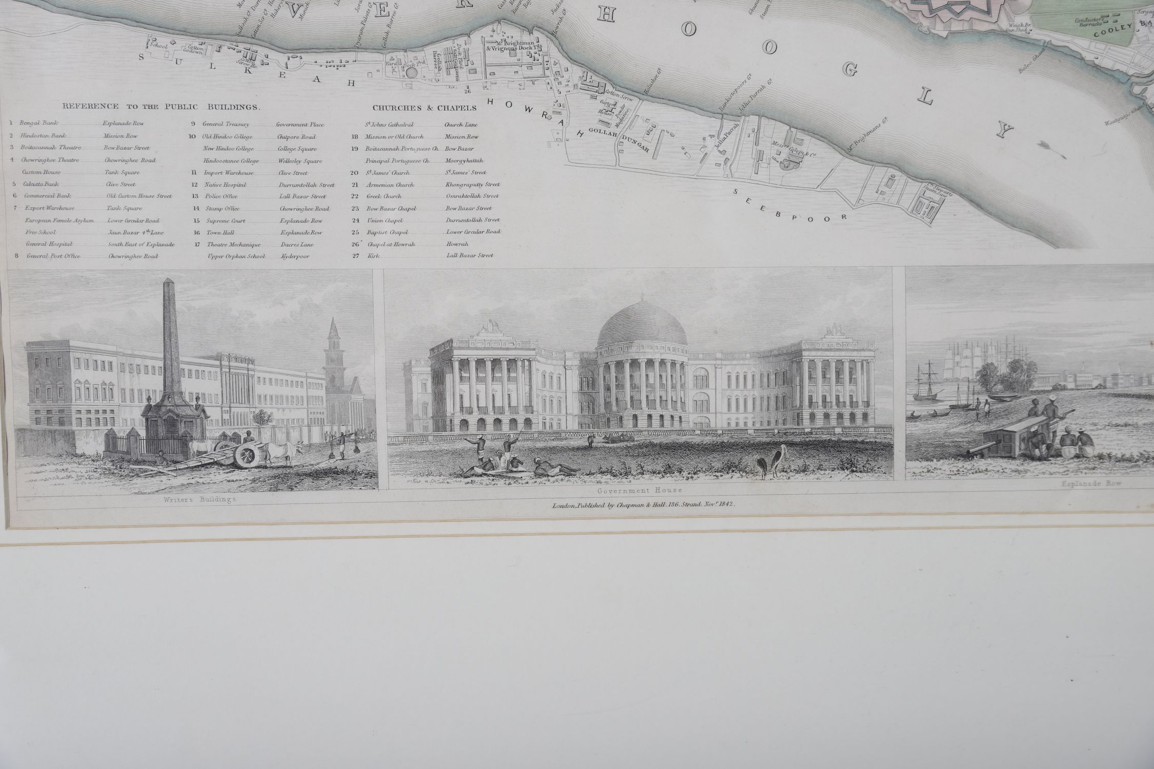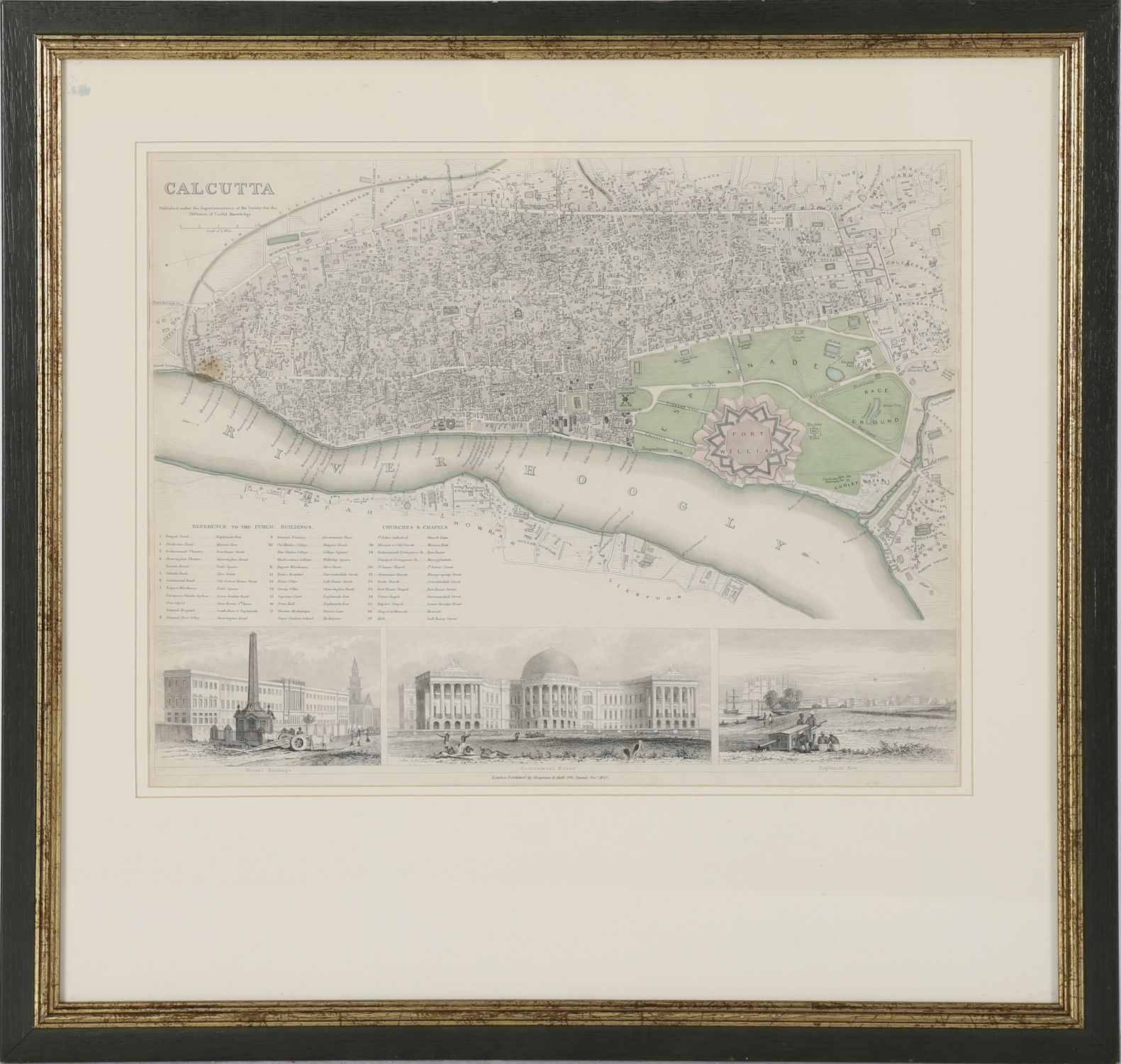City plan of Calcutta with three vignettes of the Writers Buildings, Esplanade Row and Government House. The map clearly
