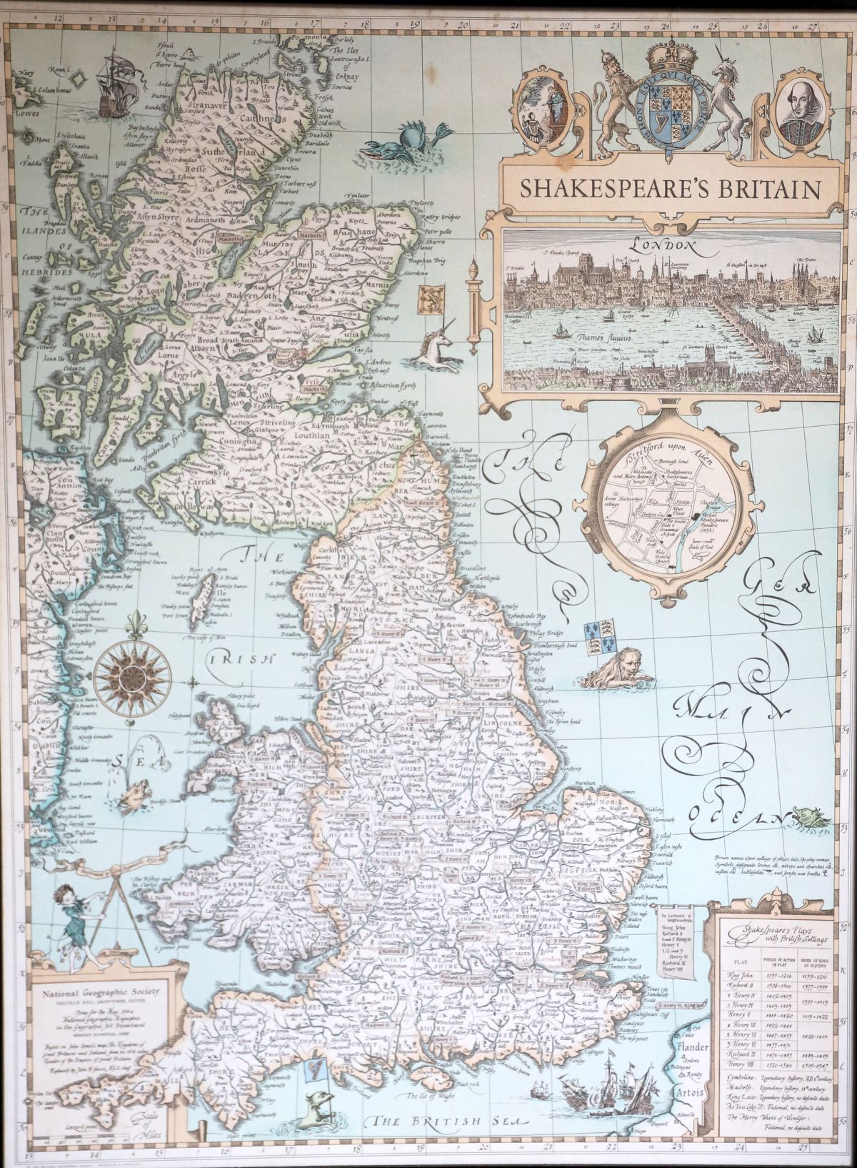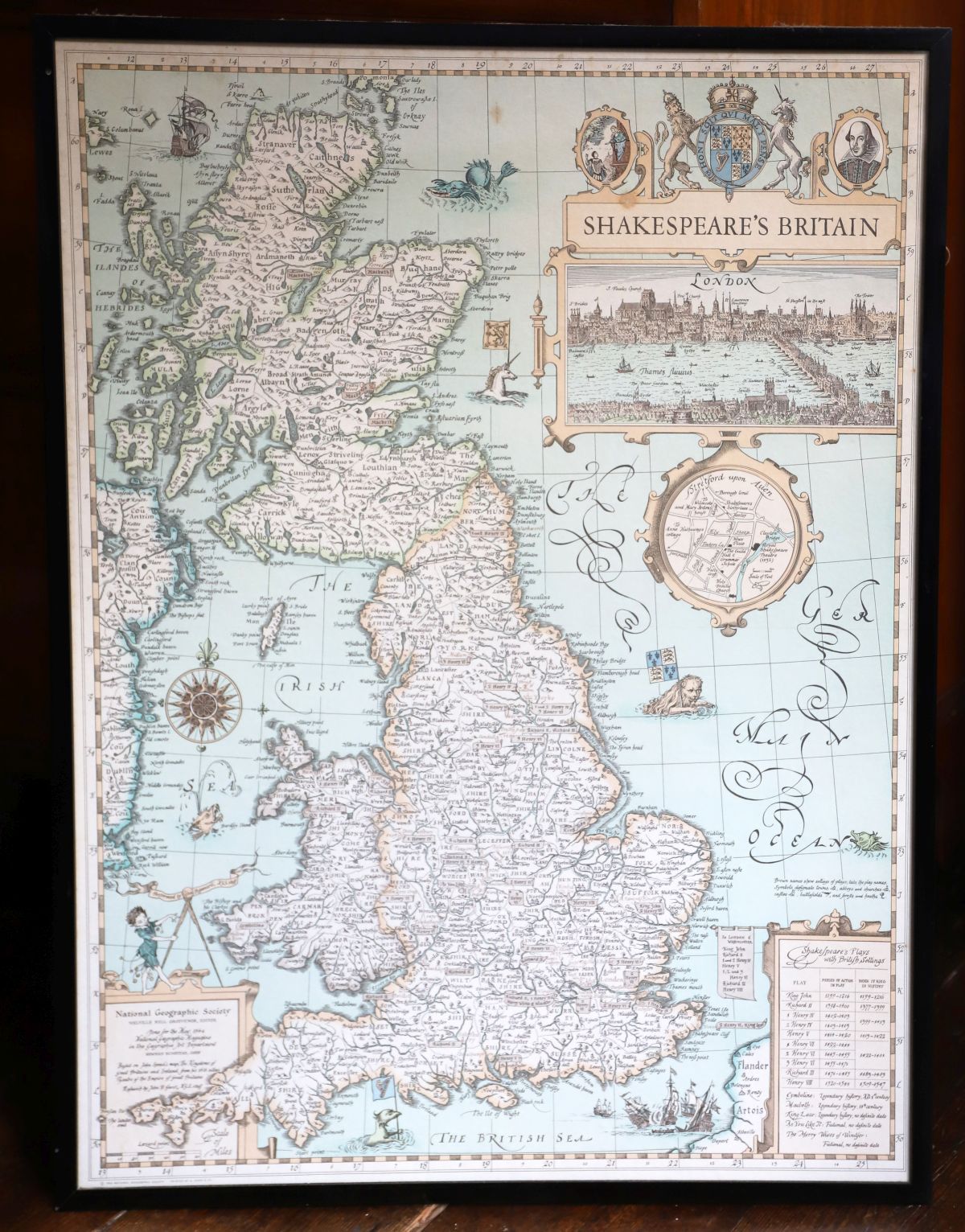 A framed decorative map titled Shakespeare’s Britain, depicting England and Wales with cartographic detail, inset views, heraldic devices and literary references. 20th century.