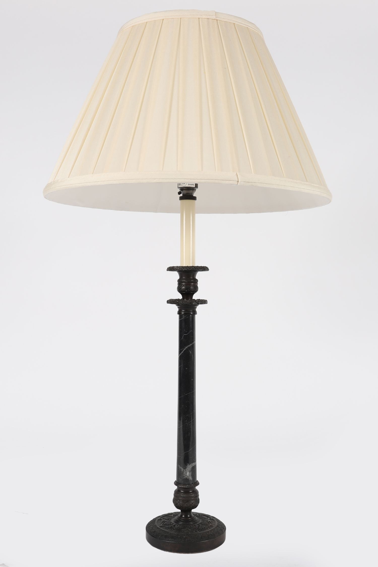 A stylish table lamp with turned marble stem and cast bronze mounts to the base and capital, complete with cream pleated shade.