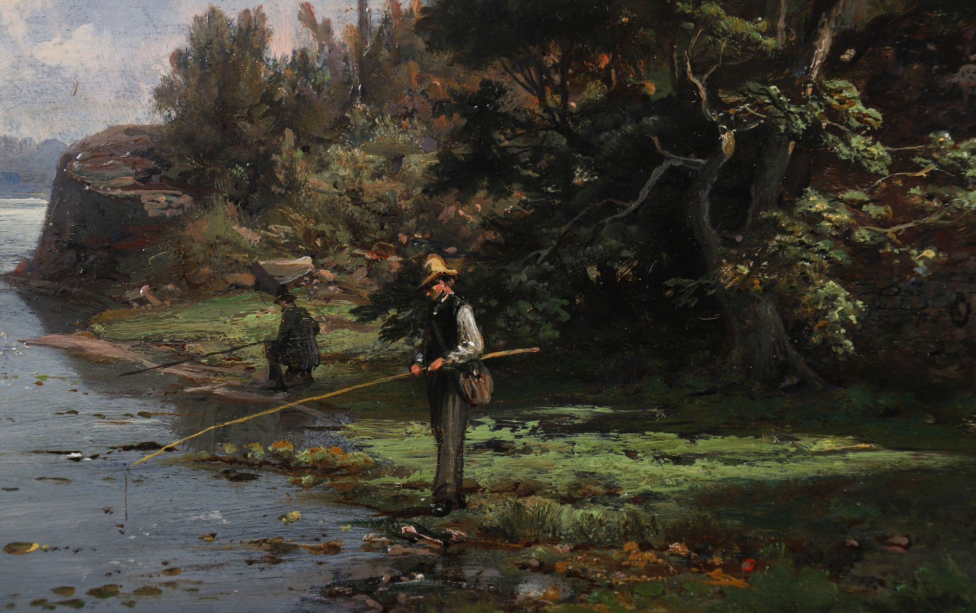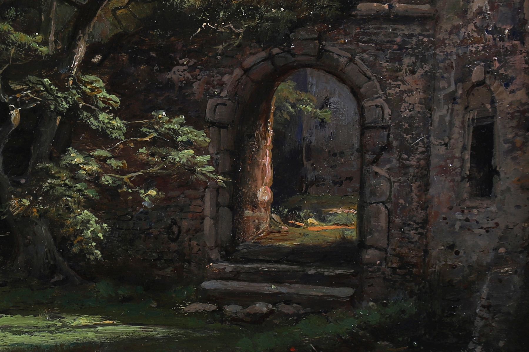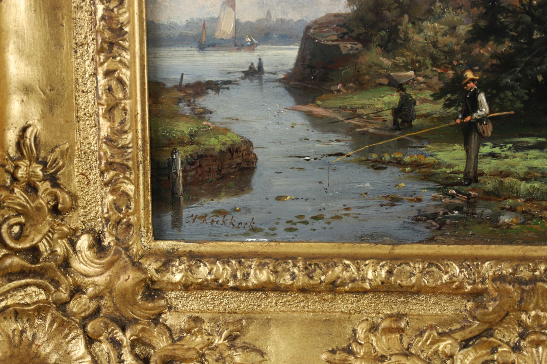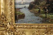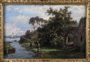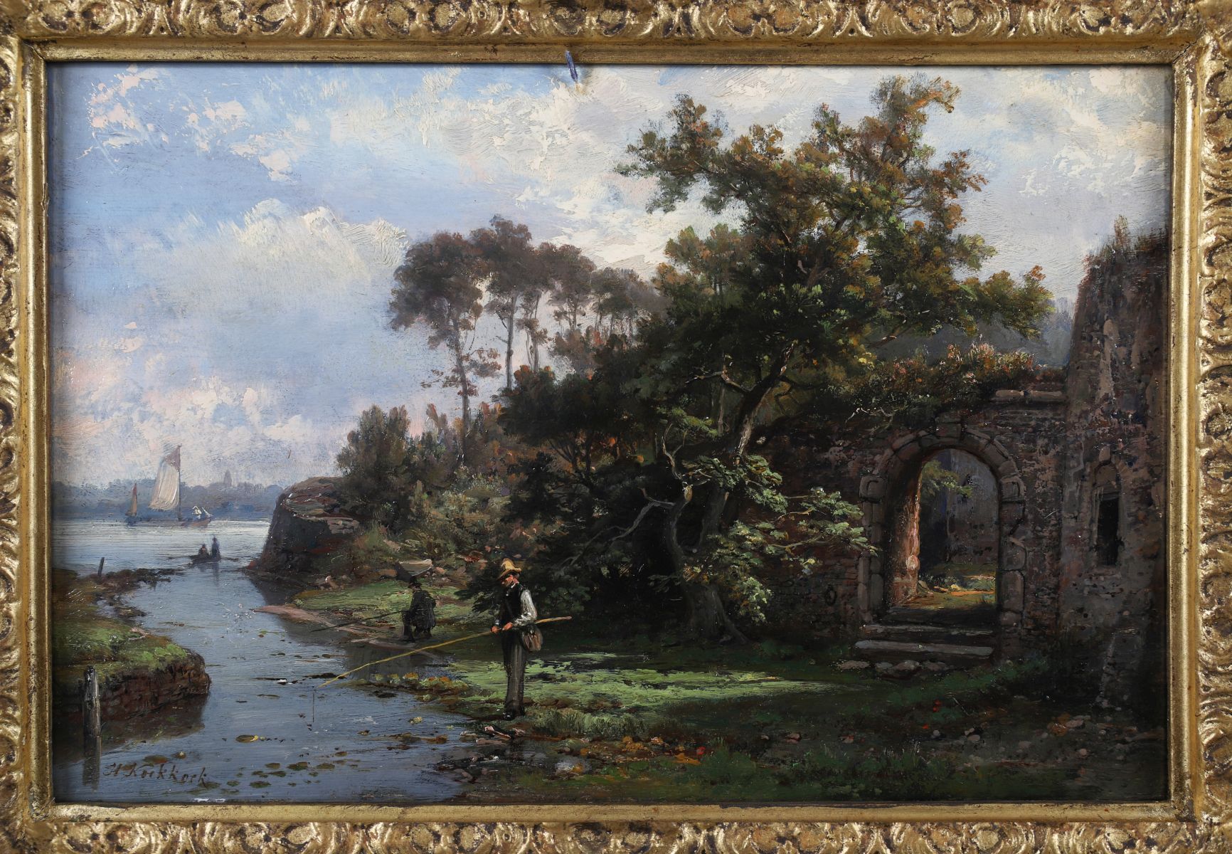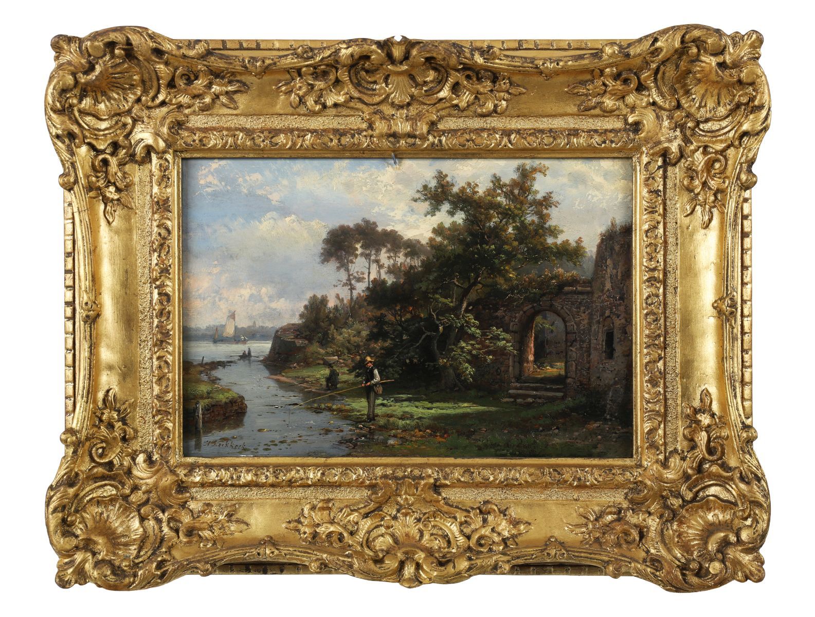 A detailed landscape showing a fisherman beside a ruined archway overlooking a calm river, with sailing boats beyond. Oil on panel, signed lower left. Enclosed in an elaborate gilt frame.
