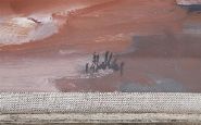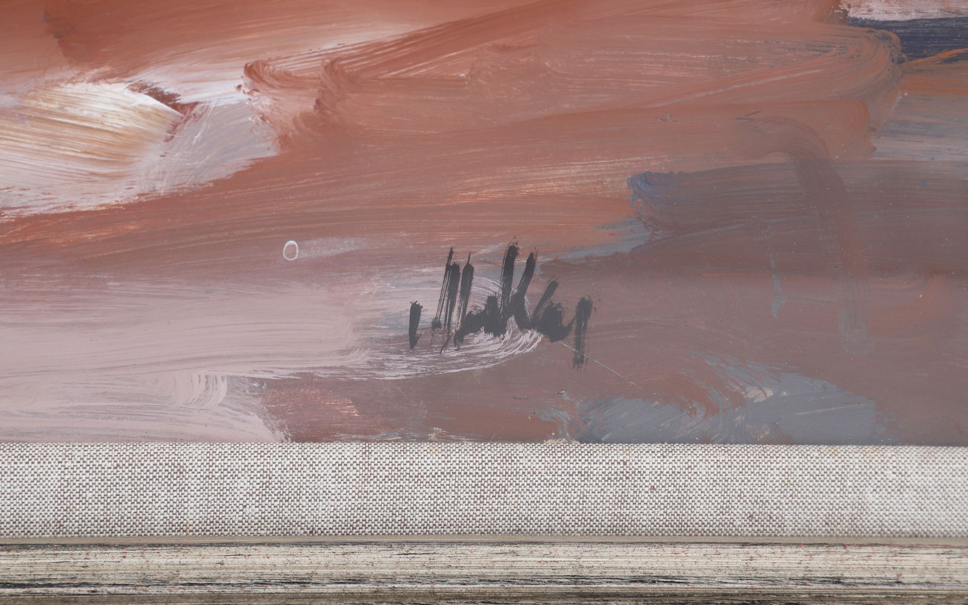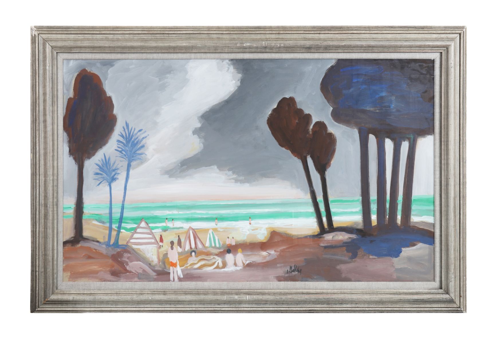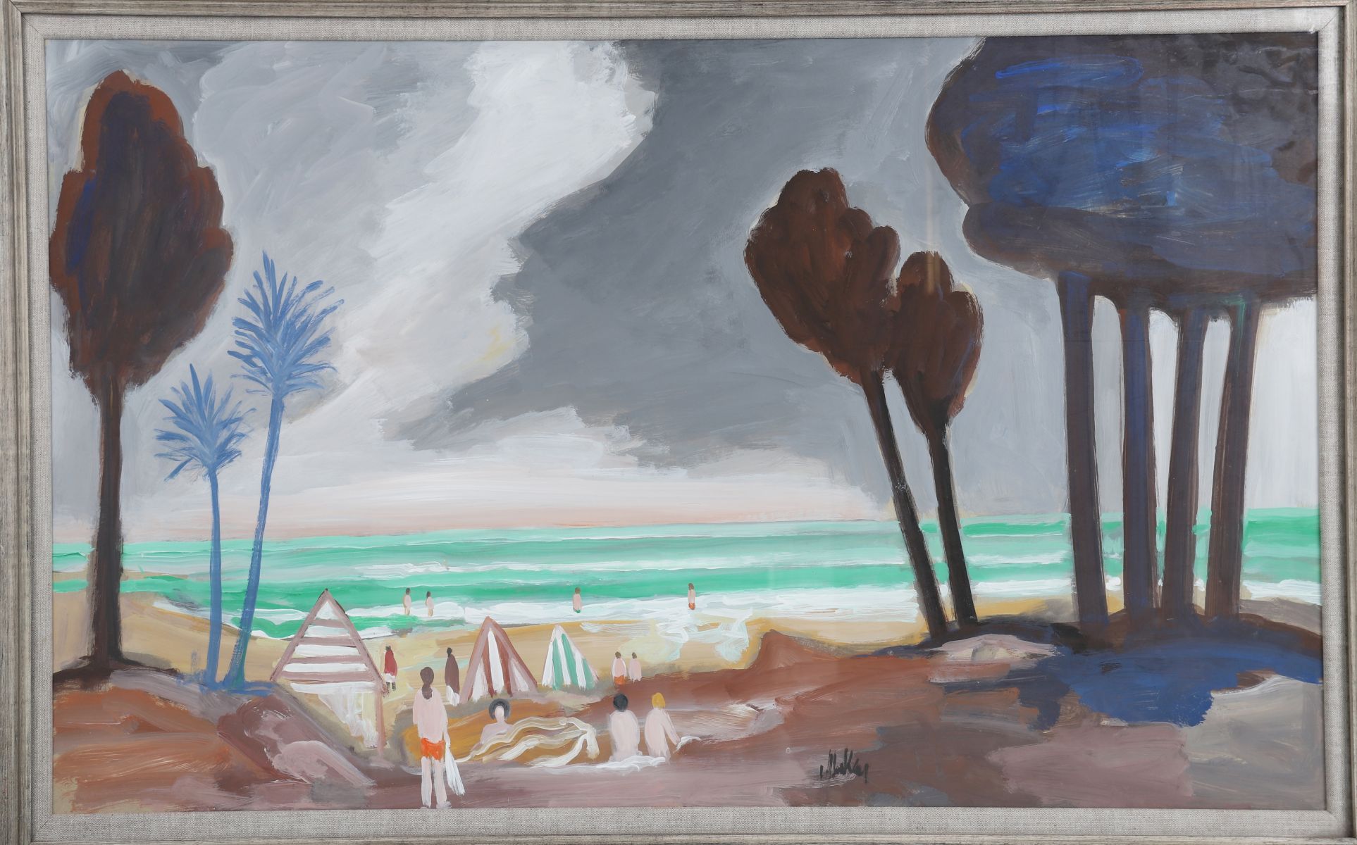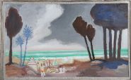 A large gouache on board featuring a stylised coastal scene with beach tents, bathers and tall palm trees set against an approaching sky. Robinson’s iconic simplified forms, flattened perspective and gentle tonal shifts create a distinctive composition with strong graphic presence. Signed bottom right.