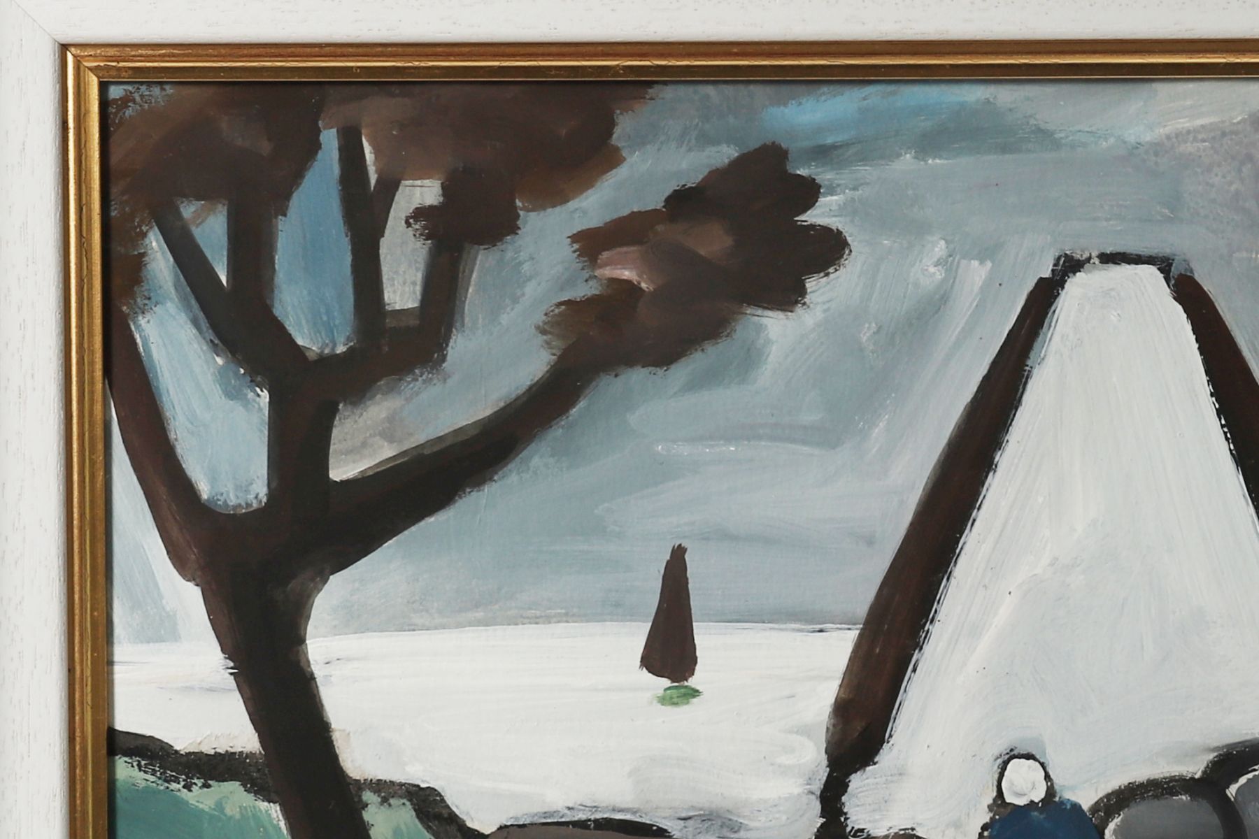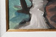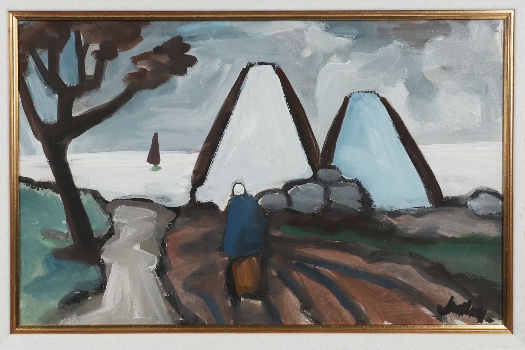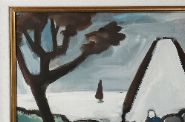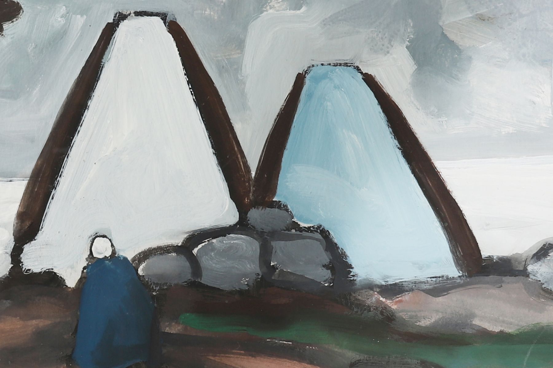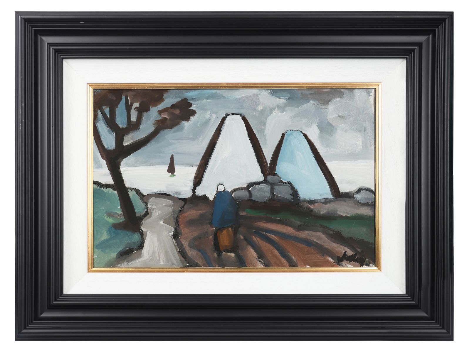A serene west coast scene featuring a shawled figure beside traditional cottages with sails rising beyond. The composition’s rhythmic forms and cool tonal balance display Robinson’s refined sense of harmony and Irish identity.