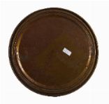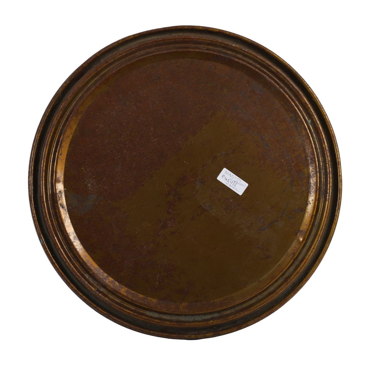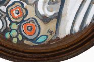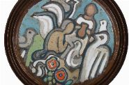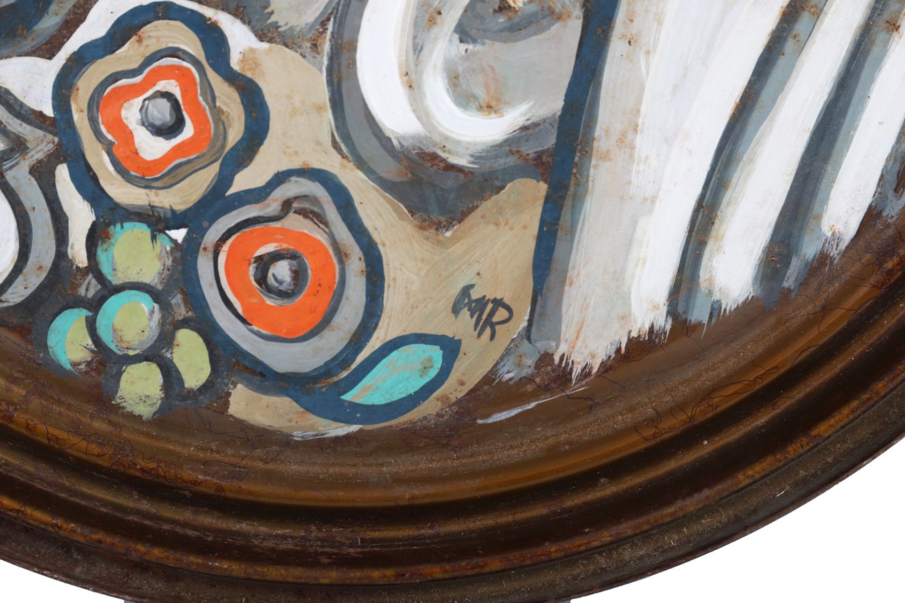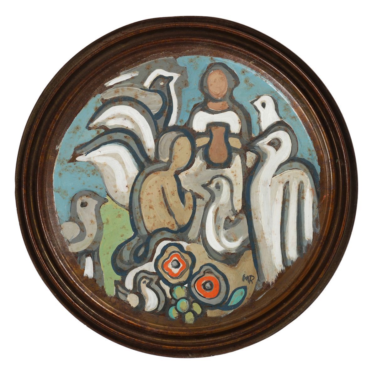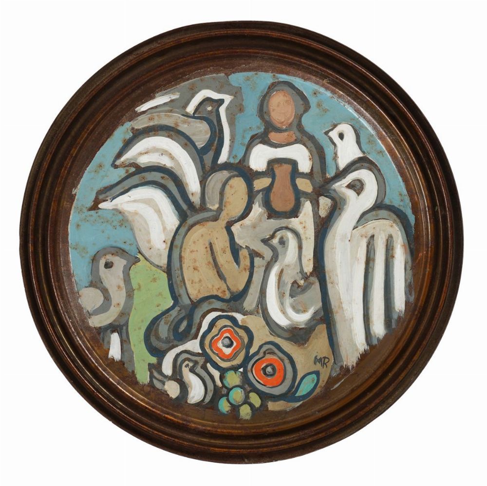 A circular painted metal panel displaying Robinson’s distinctive stylised forms, featuring doves set within a dense arrangement of abstract shapes and floral elements. Executed in muted earth tones with accents of orange and teal.