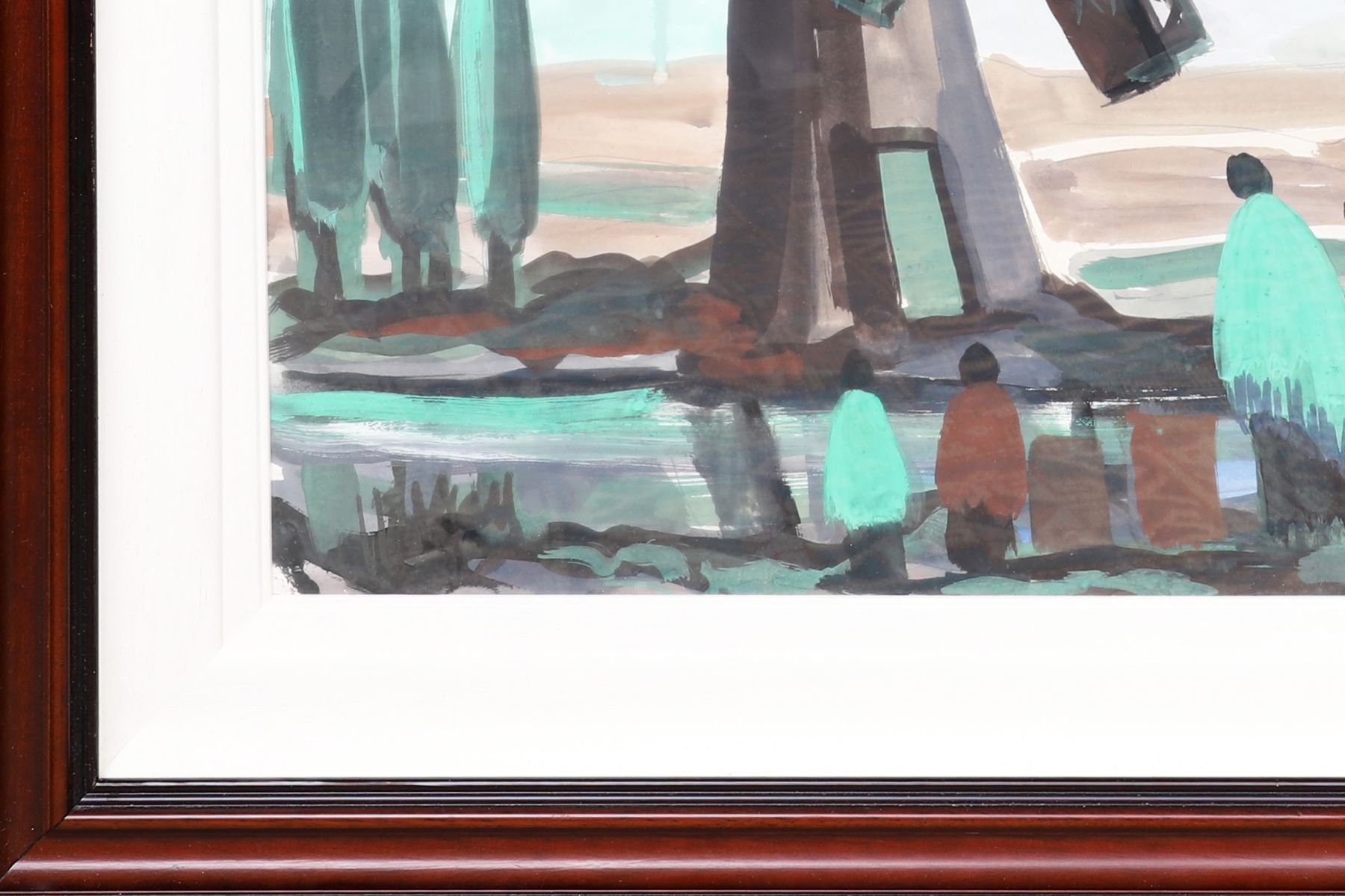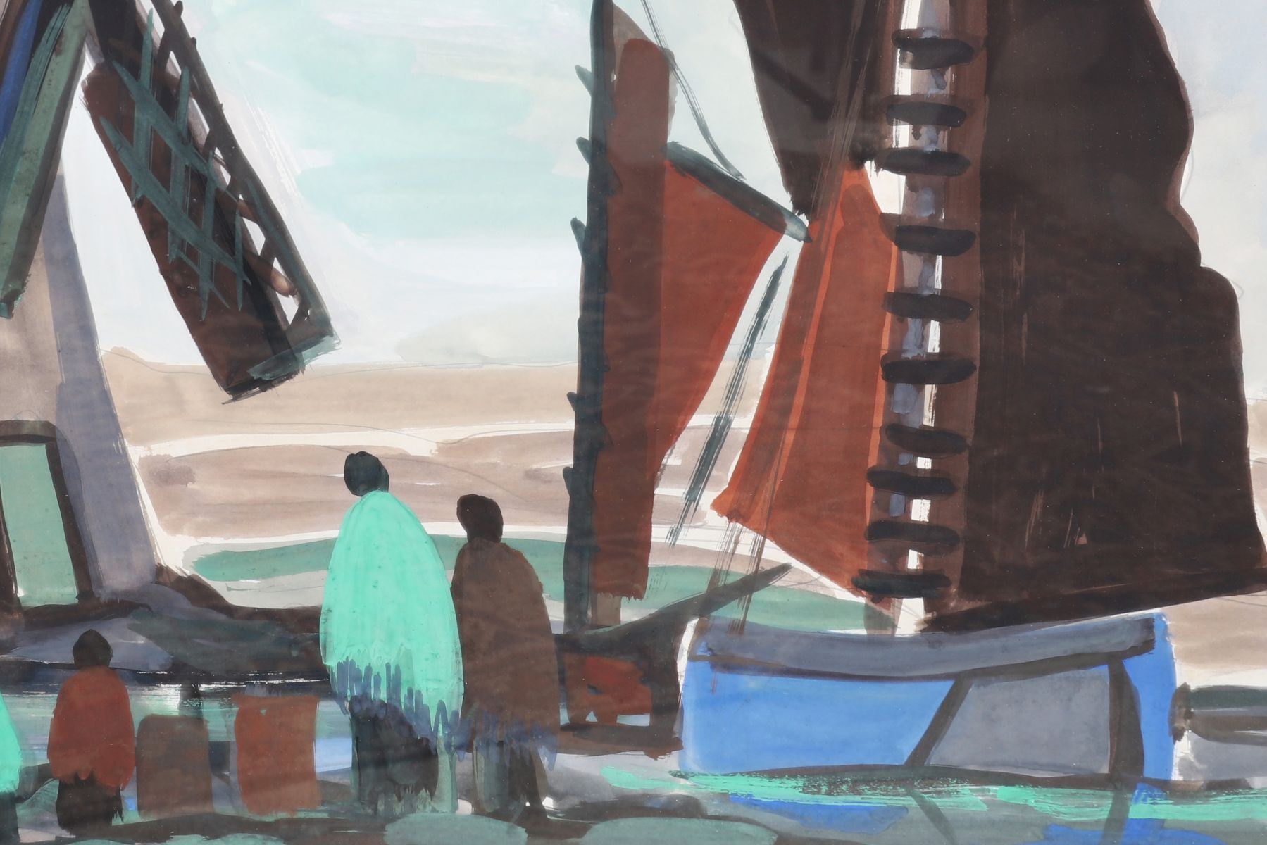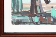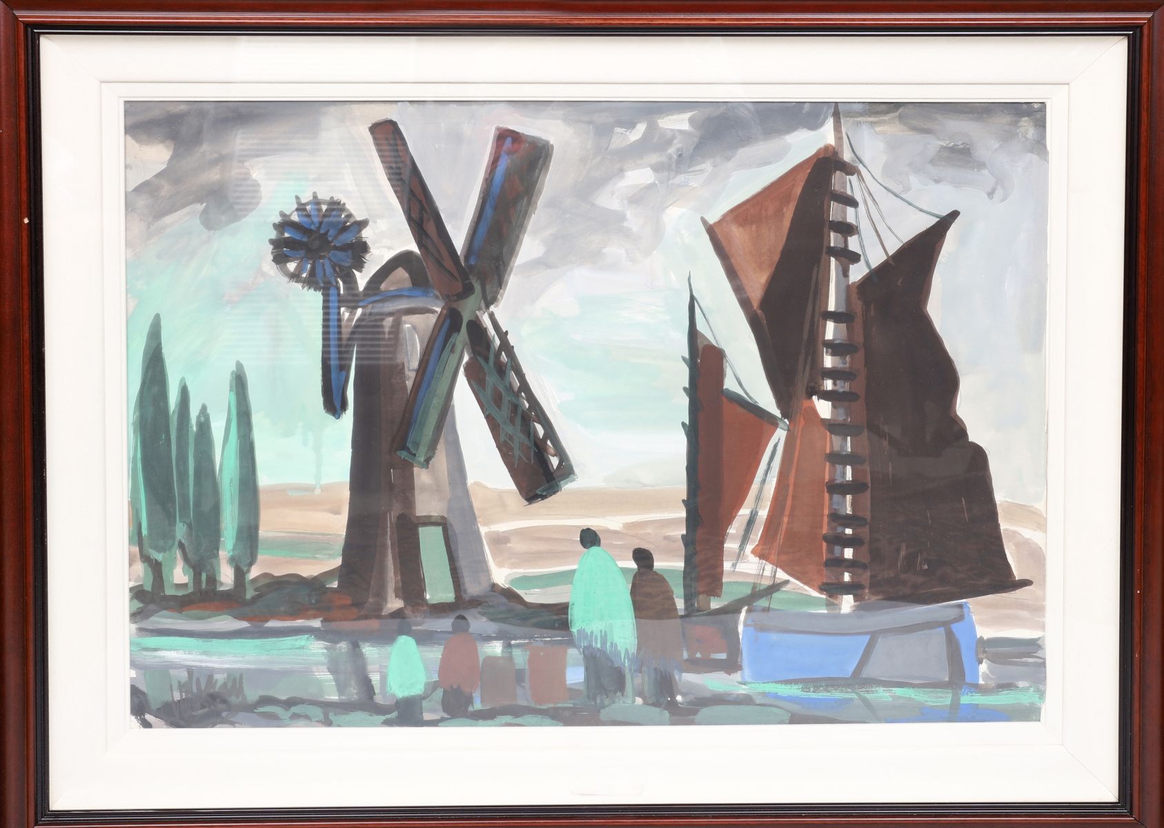 Stylised coastal scene featuring sailing vessels, windmills, and shawl-clad figures, signed. Framed. Oil on board.
