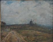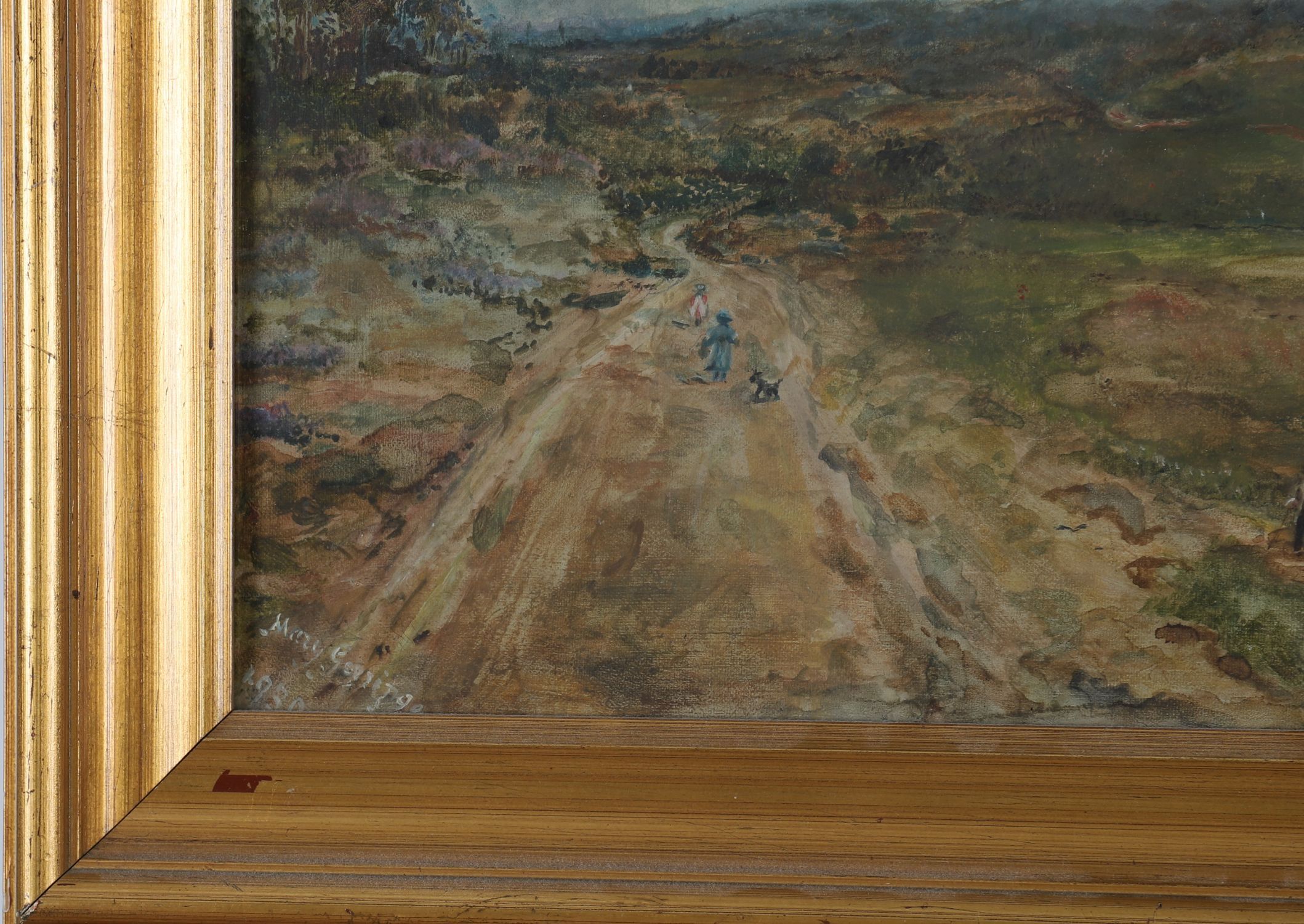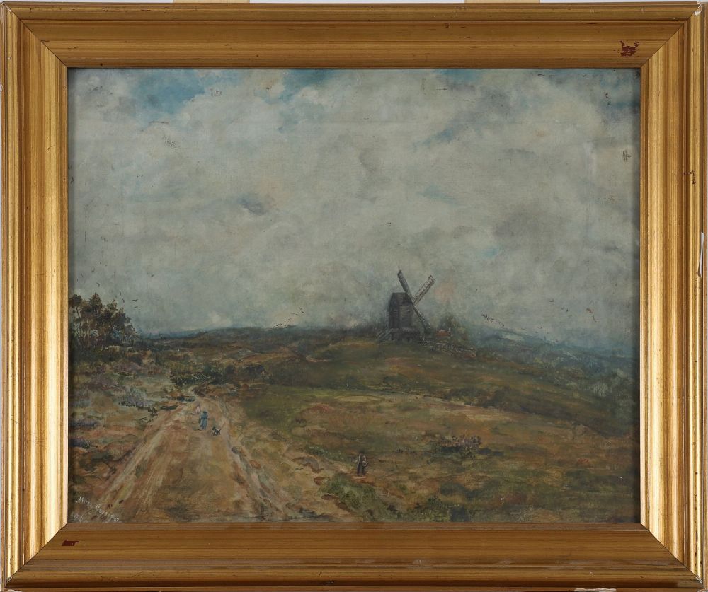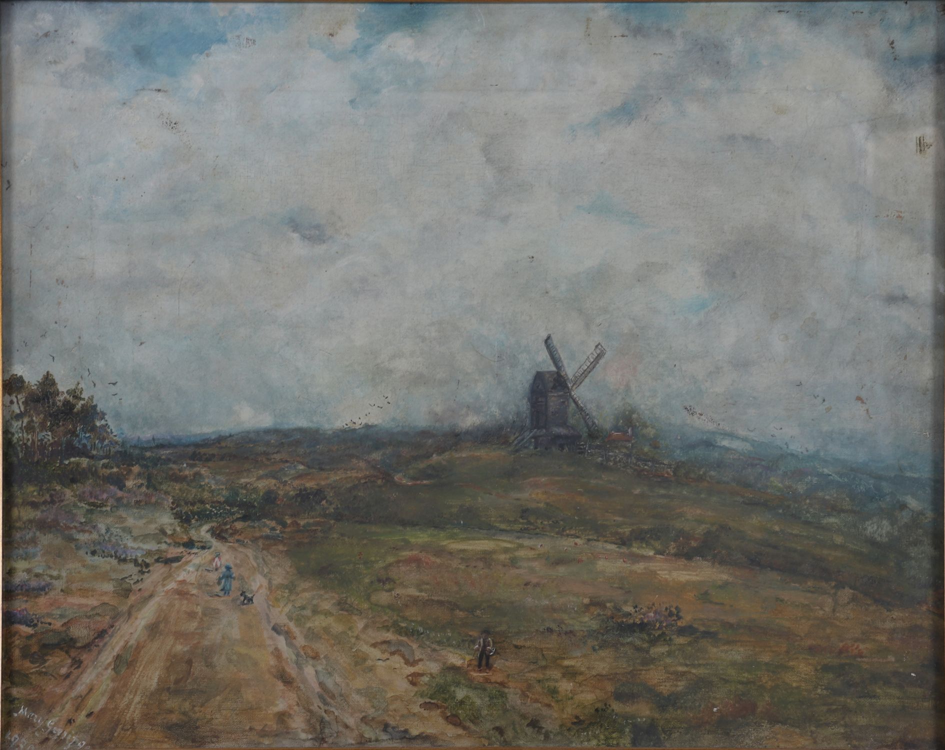An expressive landscape, oil on canvas, signed Mary Gorringe and dated 1930, depicting a windmill on a hilltop overlooking an expansive heath, with figures and winding tracks in the foreground. The work combines soft impressionistic handling with topographical observation. A label verso reads: “Capt. G.T.J. Gorringe, R.I.A.S.C.” — possibly indicating a family connection to a British Army officer in the Royal Indian Army Service Corps.