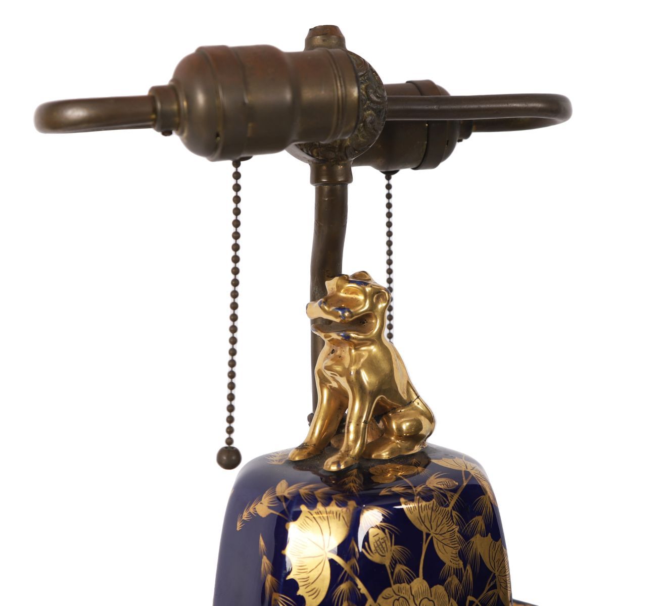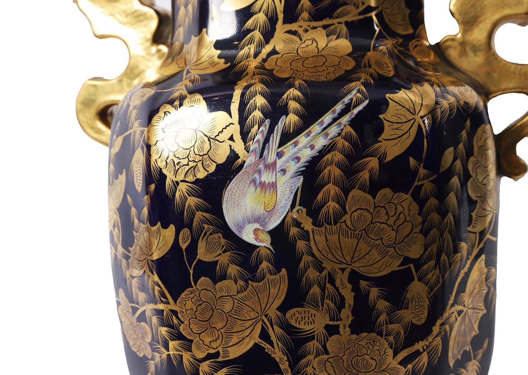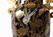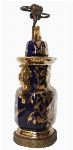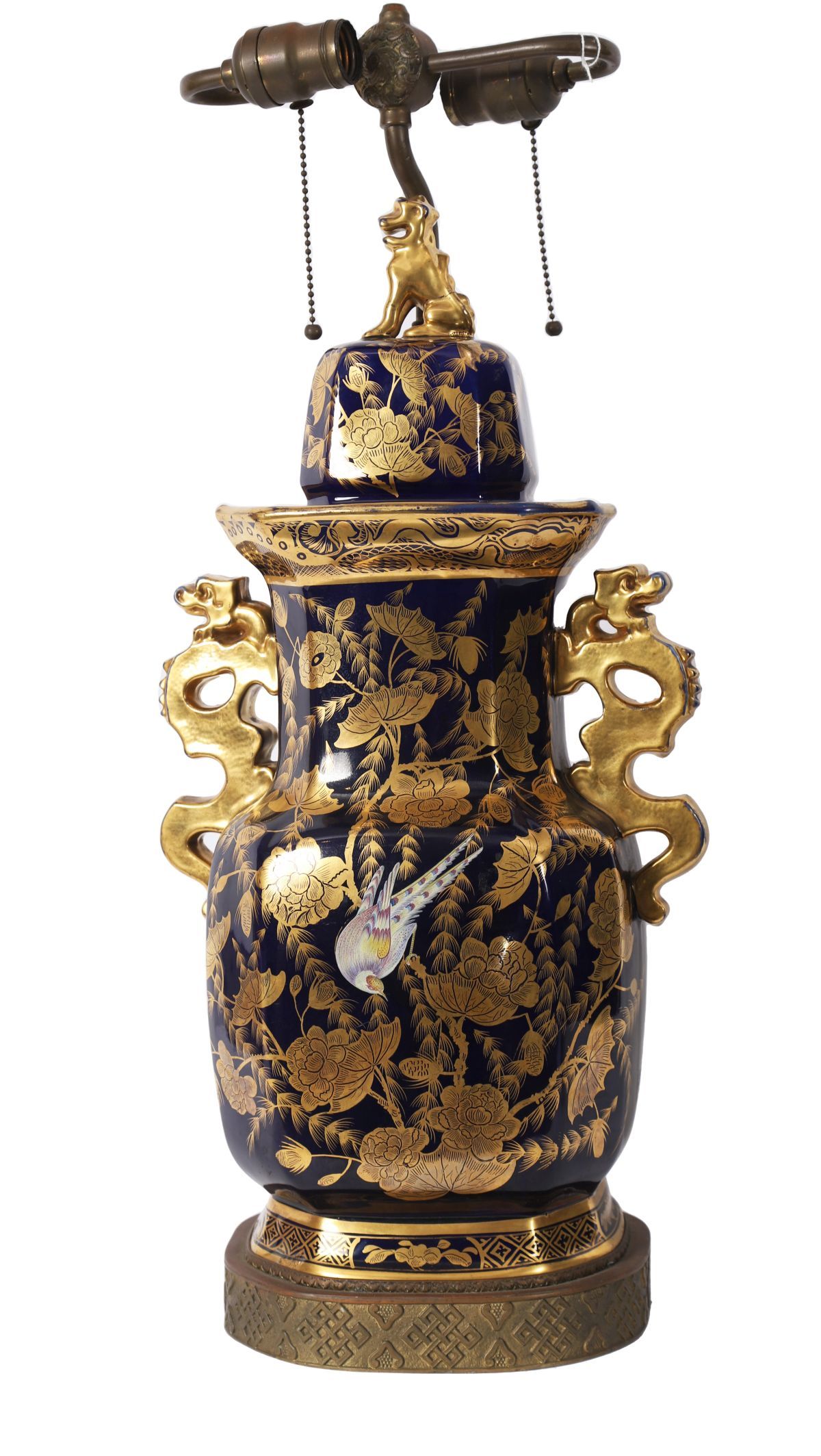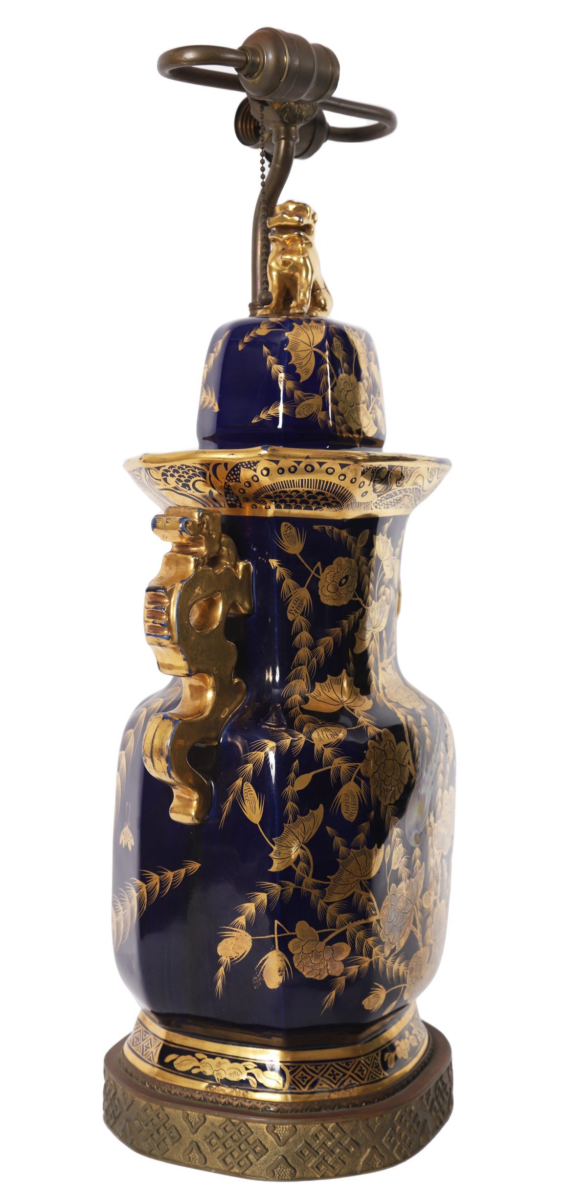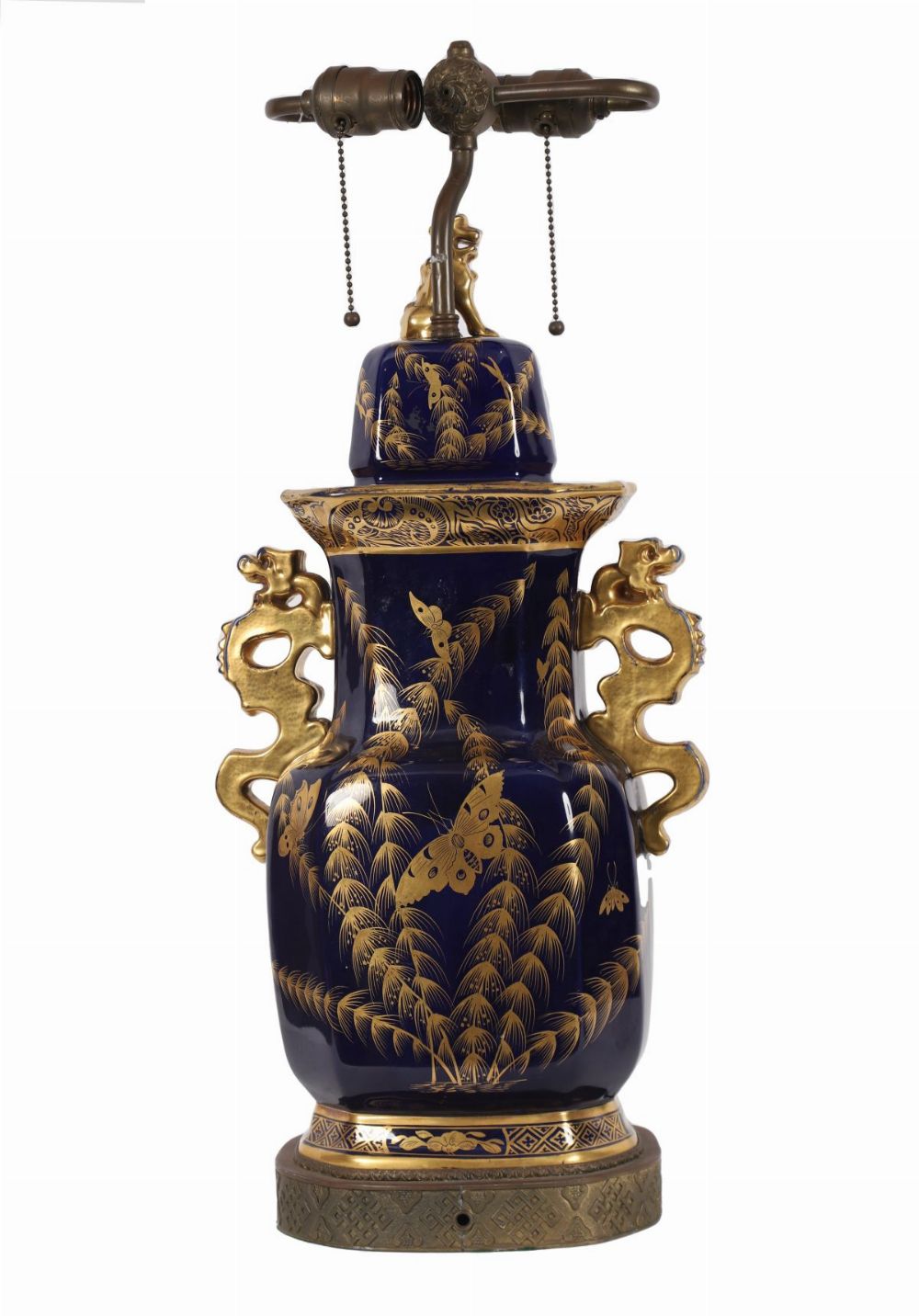 A Mason’s ironstone table lamp formed from a baluster-shaped vase decorated in a deep cobalt blue ground with gilt chinoiserie foliage and butterflies, fitted with a metal column mount and raised on a stepped base.