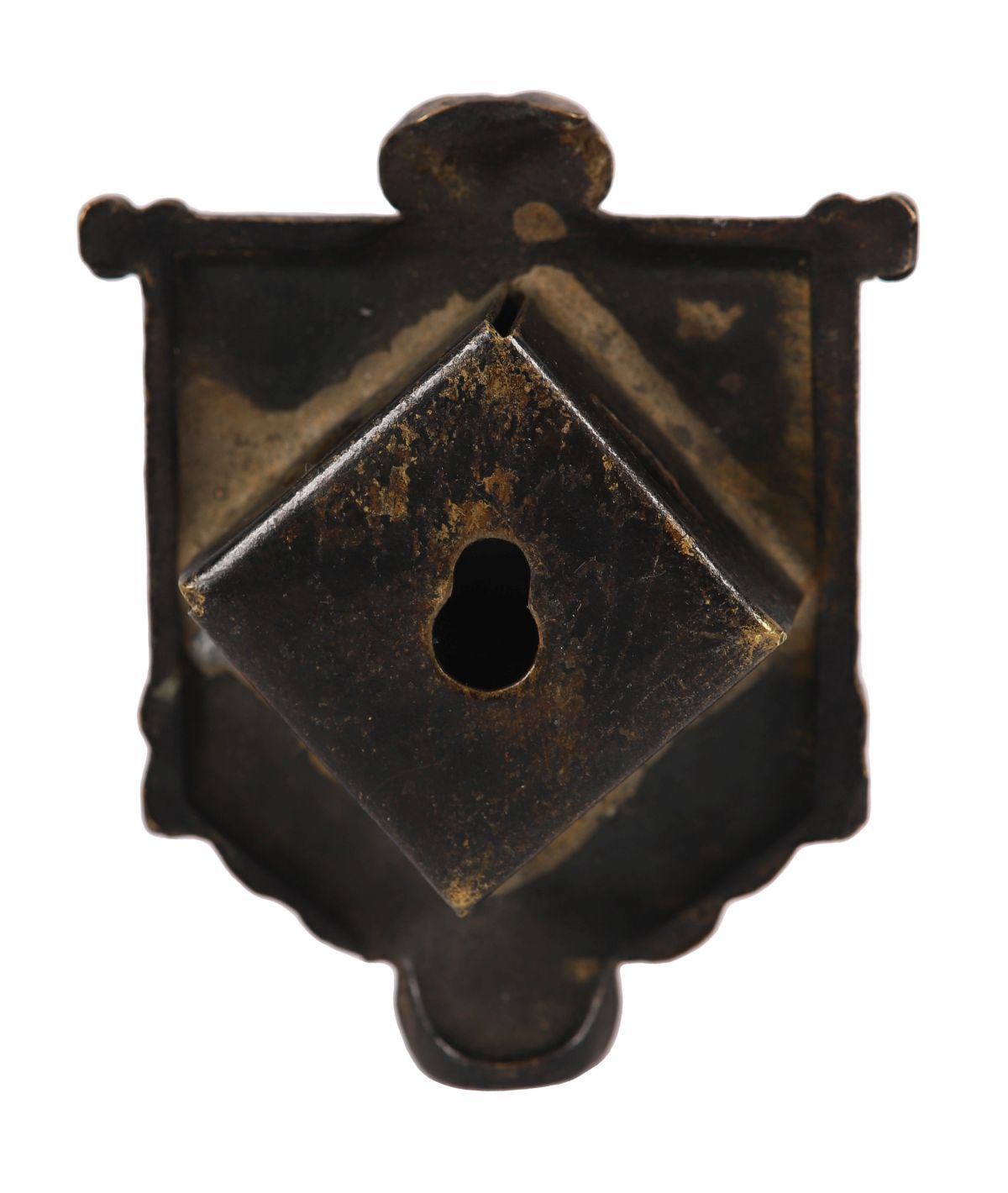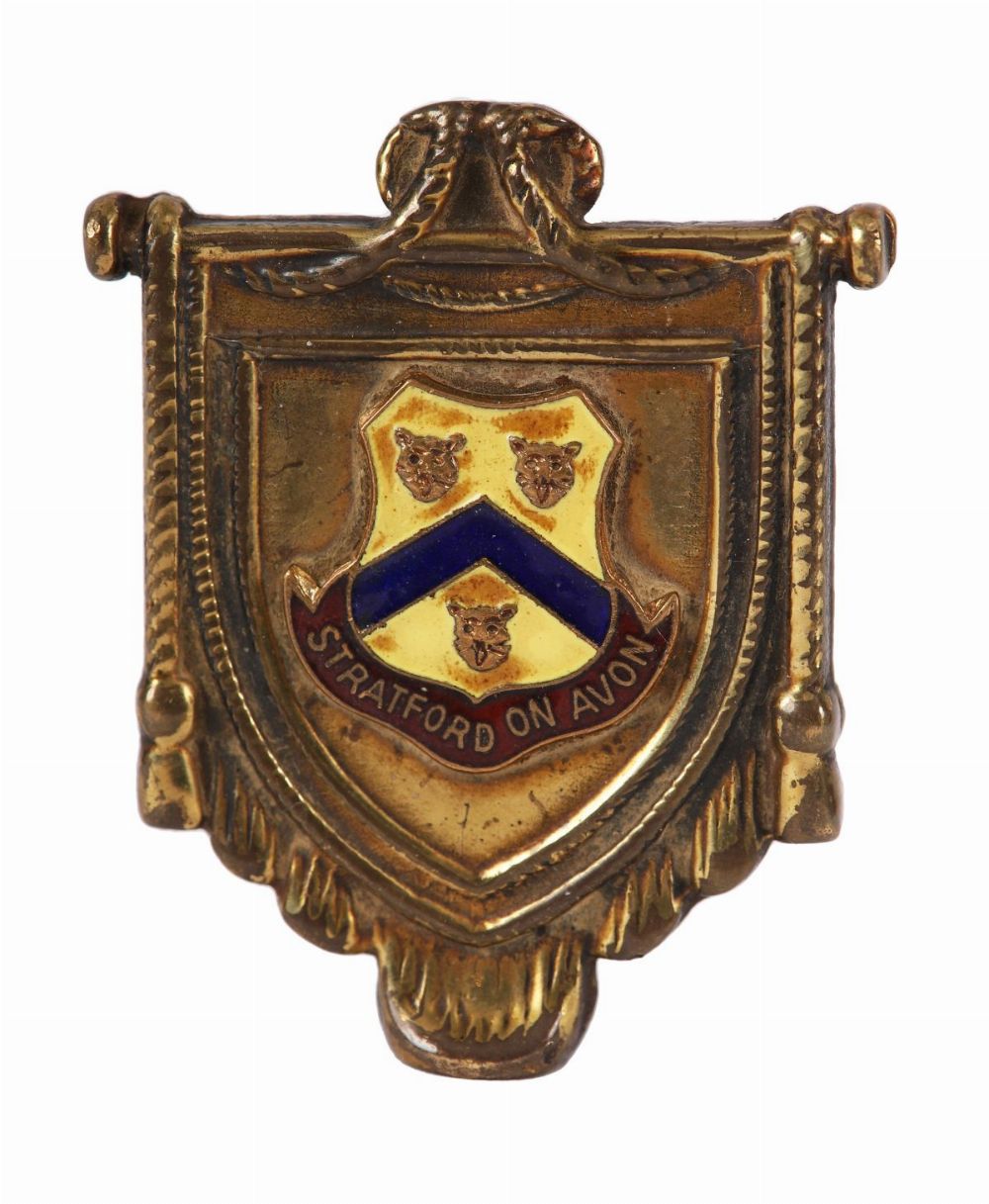 A gilt metal Masonic badge of shield form, decorated with polychrome enamel arms and inscribed “Stratford on Avon.†The shield mounted within a scroll and tassel surround.