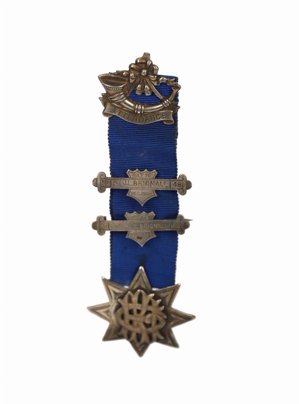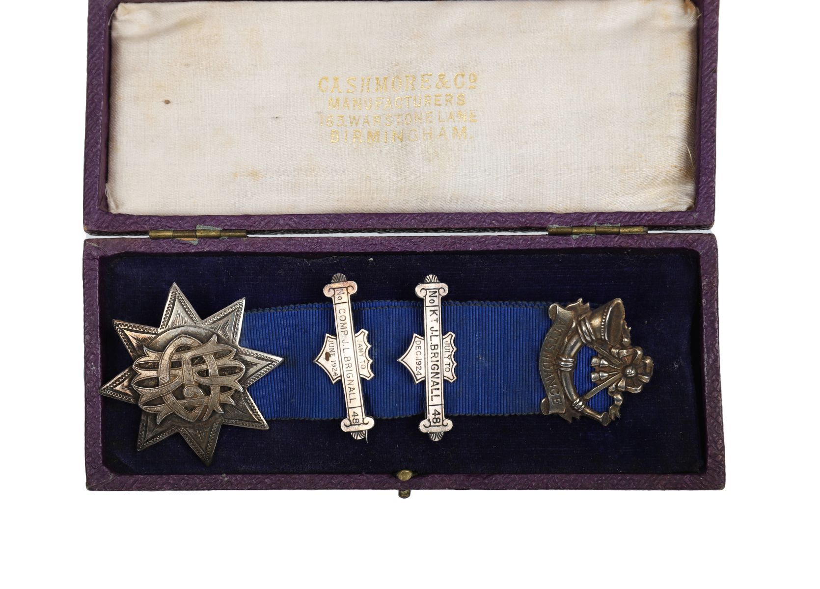 Silver (hallmarked) Knights of the Golden Horn medal, monogrammed to front and engraved on reverse: No. 48 Earl of Harewood Encampment, Comp. J. L. Brignall, July–Dec 1923, with two attendance bars (June & Dec 1924). In original Cashmore & Co., Birmingham box.